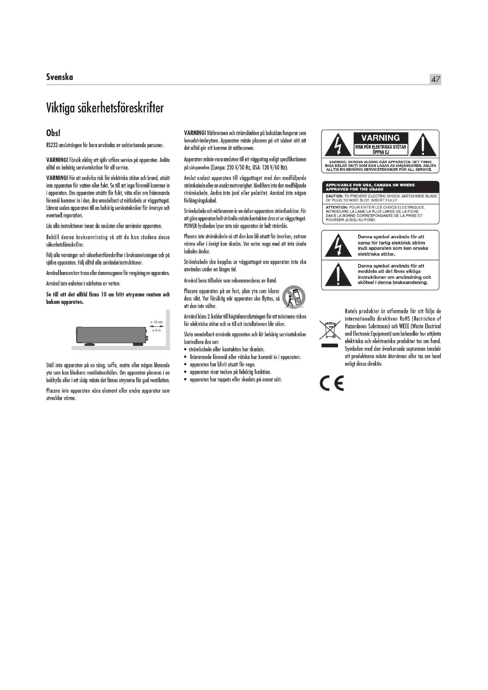 - apparaten har tappats eller skadats på annat sätt. VARNING RISK FÖR ELEKTRISKA STÖTAR ÖPPNA EJVARNING: SKRUVA ALDRIG ISÄR APPARATEN. DET FINNS INGA DELAR INUTI SOM KAN LAGAS AV ANVÄNDAREN. ANLITA ALLTID EN BEHÖRIG SERVICETEKNIKER FÖR ALL SERVICE.Denna symbol används för att varna för farlig elektrisk ström inuti apparaten som kan orsaka elektriska stötar.Denna symbol används för att meddela att det finns viktiga instruktioner om användning och skötsel i denna bruksanvisning.48 RBK-serien 8-kanals slutsteg Om Rotel Vår historia började för mer än 50 år sedan. Under alla år sedan dess har våra produkter belönats med hundratals utmärkelser och roat hundratusentals människor som tar sin underhållning på allvar – precis som du! Rotel grundades av en familj med ett passionerat intresse för musik. Detta ledde till en egen tillverkning av hifi-produkter med en kompromisslös kvalitet. Genom alla år har denna passion för musik, som delas av hela Rotels personal, varit oförminskad och målet har alltid varit att tillverka prisvärda produkter för både audiofiler och musikälskare, vilken budget de än har. Rotels ingenjörer arbetar i team och har ett nära samarbete. Tillsammans lyssnar de på och finslipar varje ny produkt tills den lever upp till deras höga krav. De får välja komponenter från hela världen för att göra produkterna så bra som möjligt. I apparaterna hittar du ofta allt från brittiska och tyska kondensatorer till japanska och amerikanska halvledare samt toroidaltransformatorer som tillverkas i Rotels egna fabriker. Vi bryr oss alla om miljön. Eftersom allt mer elektronik tillverkas, och så småningom kasseras, är det särskilt viktigt att tillverkare gör vad de kan för att produkterna får så liten inverkan som möjligt på sophantering och vattenmiljö. På Rotel är vi stolta över att kunna bidra. Vi har reducerat blyinnehållet i vår elektronik genom att använda ett speciellt ROHS-lödtenn, och våra Class D-förstärkare (ej digitala) är upp till fem gånger mer effektiva än våra äldre modeller samtidigt som de är kraftfulla och har höga prestanda. Dessa produkter utvecklar lite värme, slösar minimalt med energi, är bra för miljön – och låter bättre. Slutligen är denna manual tryckt på återvunnet papper. Även om detta är små, första steg så är de viktiga. Och vi fortsätter att eftersträva nya metoder och material som kan ge en renare och grönare tillverkning. Alla vi på Rotel tackar dig för att du köpt denna produkt. Vi är övertygade om att den kommer att ge dig många års glädje. Lite om watt RKB-850 och RKB-D850 har en effekt som specificeras till 50 watt per kanal och RKB-8100 och RKB-D8100 till 100 watt per kanal när alla åtta kanaler drivs samtidigt med full kraft. Rotel har valt att specificera effekten på detta sätt eftersom vi anser att det ger den mest korrekta bilden av en förstärkares kapacitet. När du jämför specifikationer med andra produkter bör du tänka på att uteffekt ofta specificeras på andra sätt, vilket innebär att du kanske jämför äpplen och päron. Effekten kan till exempel anges när bara en enda kanal drivs, vilket ger ett högre värde. En högtalares impedans anger det elektriska motstånd som den har när den ansluts till en förstärkare, oftast 8 eller 4 ohm. Ju lägre impedansen är desto mer kraft behöver högtalaren. En högtalare med 4 ohms impedans behöver i själva verket dubbelt så mycket kraft som en med 8 ohm. Rotels förstärkare är dock konstruerade så att de fungerar med vilken impedans som helst mellan 8 och 4 ohm, och med alla kanaler drivna på full effekt. Eftersom Rotels konstruktion är optimerad för att alla kanaler ska drivas samtidigt kan Rotel ange den sanna effekten för alla kanaler. Detta kan även vara viktigt för din underhållning. När du tittar på film är det bra om förstärkaren kan lämna full effekt i alla kanaler samtidigt, särskilt när en vulkan exploderar! Introduktion Tack för att du har köpt ett 8-kanalsslutsteg i RKB-serien. I en kvalitetsanläggning för musik kommer det att ge dig många års musikalisk njutning. RKB-förstärkarna är kraftfulla förstärkare med ljudkvalitet av högsta klass. En enorm strömförsörjning, förstklassiga komponenter och Rotels Balanced Design garanterar en suverän ljudkvalitet. Den kraftiga strömförsörjningen gör att slutstegen kan driva krävande högtalare utan problem. Tänk på att RKB-förstärkarna kan återge höga ljudnivåer. Se till att dina högtalare kan hantera så hög effekt. Om du är tveksam kontaktar du din Rotel-återförsäljare och ber om råd. Innehåll Figur 1: Kontroller och kontakter 3 Figur 2: Anslutningar 4 Viktigt 5 Viktiga säkerhetsföreskrifter .........................................47 Om Rotel .......................................................48 Lite om watt .....................................................48 Introduktion. . . . . . . . . . . . . . . . . . . . . . . . . . . . . . . . . . . . . . . . . . . . . . . . . . . . . . 48 Att tänka på 49 Placering 49 Ström och strömfunktioner ...........................................49 Ström