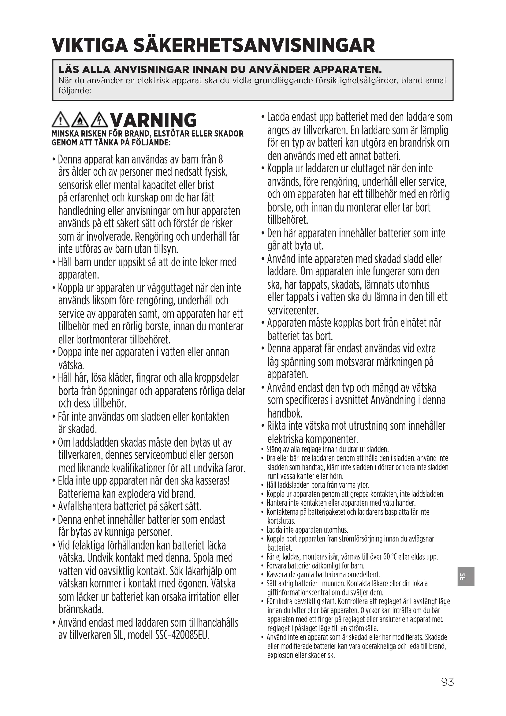 - Använd endast med laddaren som tillhandahålls av tillverkaren SIL, modell SSC-420085EU.