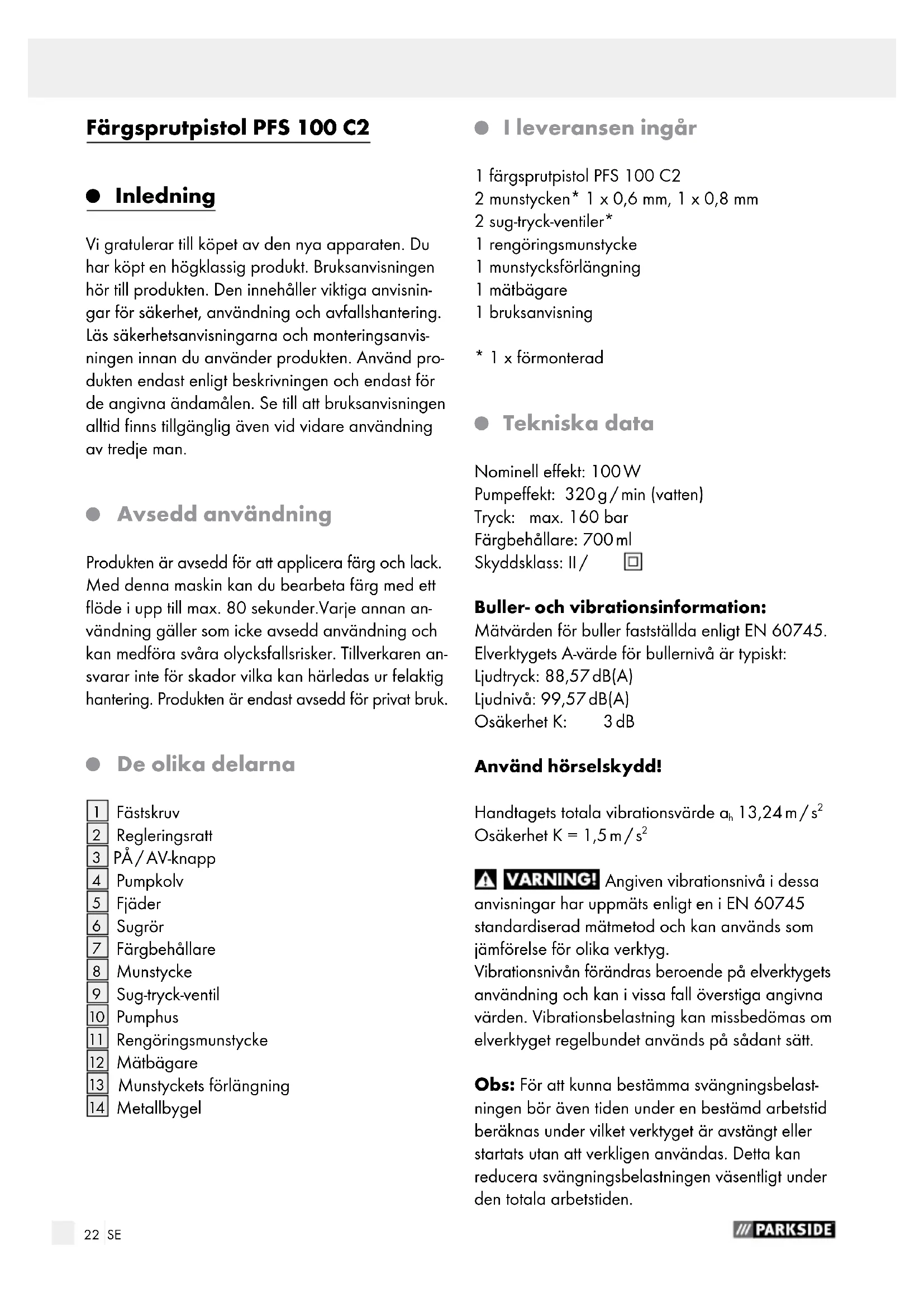 BRUKSANVISNING PFS 100 C2 PARKSIDE