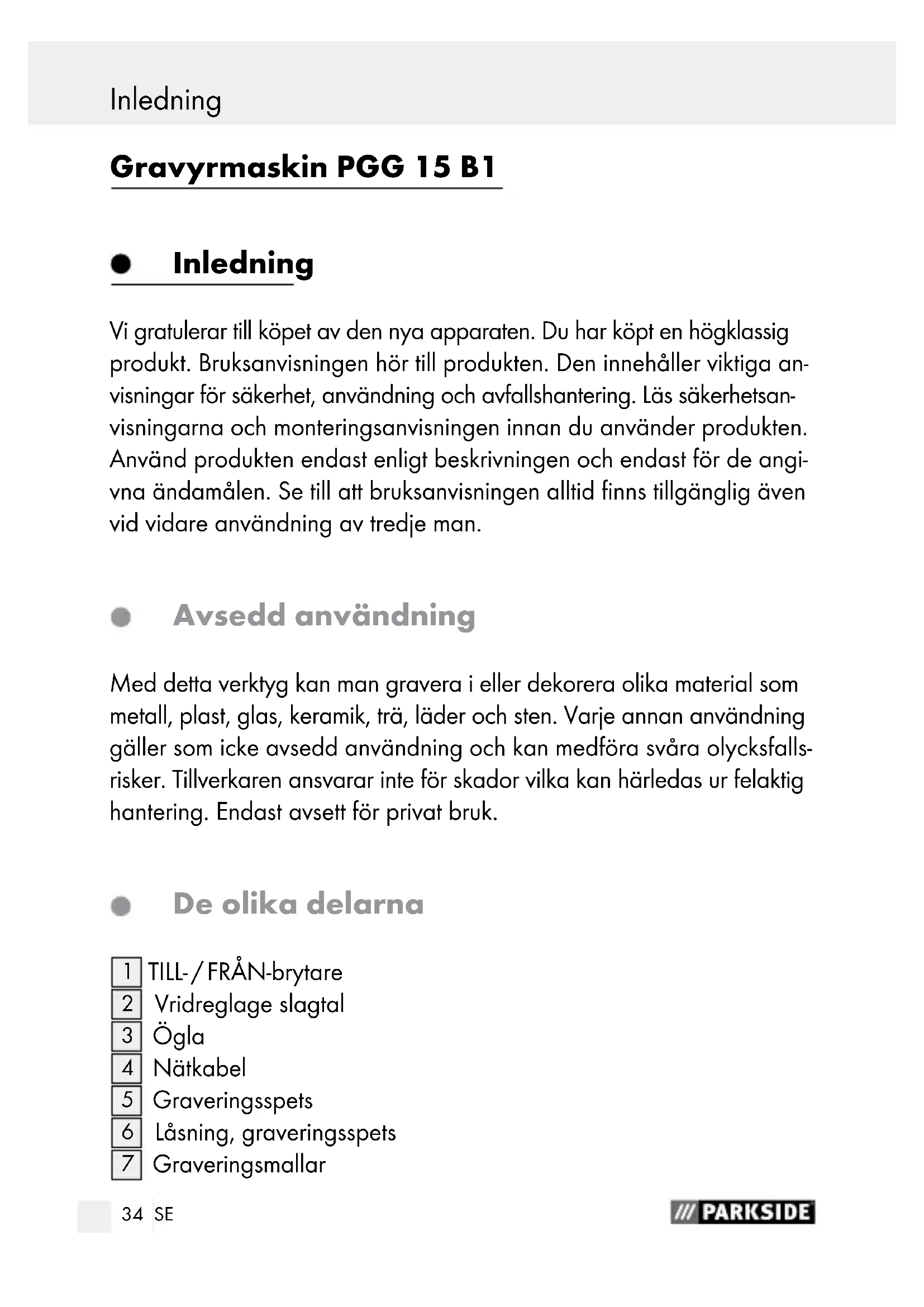 Handhavande TILL / FRÅN .............................................................................Sidan 40 Inställning av slagdjup ...........................................................Sidan 41 Byta graveringsspets .............................................................. Sidan 41 Arbetstips ................................................................................Sidan 42 Rengöring ..........................................................................Sidan 42 Service ..................................................................................Sidan 42 Garanti .................................................................................Sidan 43 Avfallshantering ..........................................................Sidan 44 Översättning av tillverkarens original-EG försäkran om överensstämmelse .................Sidan 45 InnehållsförteckningKäännös alkuperäisestä … / Valmistajan34 SE Inledning Gravyrmaskin PGG 15 B1 Inledning Vi gratulerar till köpet av den nya apparaten. Du har köpt en högklassig produkt. Bruksanvisningen hör till produkten. Den innehåller viktiga an- visningar för säkerhet, användning och avfallshantering. Läs säkerhetsan- visningarna och monteringsanvisningen innan du använder produkten. Använd produkten endast enligt beskrivningen och endast för de angi- vna ändamålen. Se till att bruksanvisningen alltid finns tillgänglig även vid vidare användning av tredje man. Avsedd användning Med detta verktyg kan man gravera i eller dekorera olika material som metall, plast, glas, keramik, trä, läder och sten. Varje annan användning gäller som icke avsedd användning och kan medföra svåra olycksfalls- risker. Tillverkaren ansvarar inte för skador vilka kan härledas ur felaktig hantering. Endast avsett för privat bruk. De olika delarna