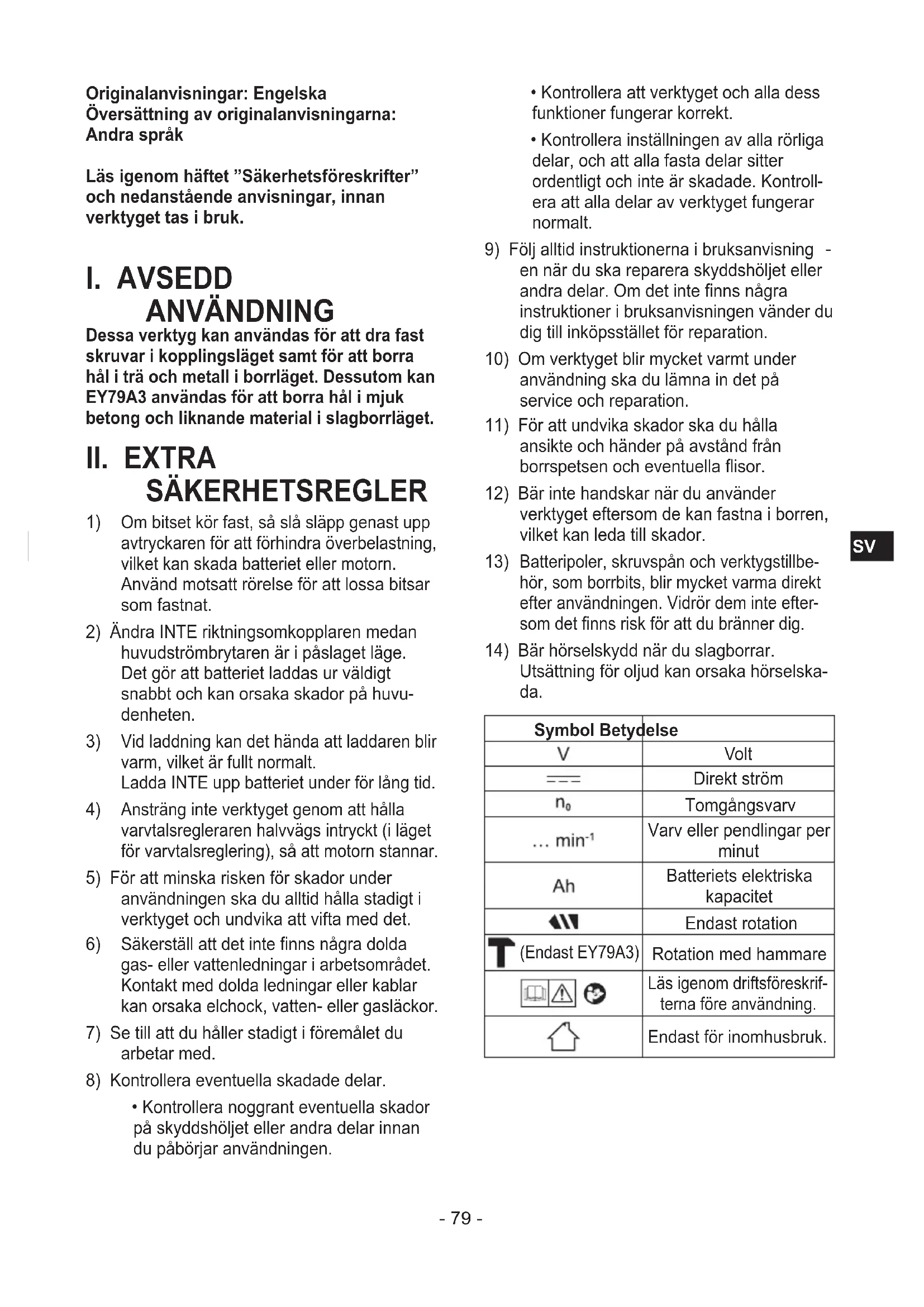 Utsättning för oljud kan orsaka hörselska- da. Symbol Betydelse Volt Direkt ström Tomgångsvarv Varv eller pendlingar per minut Batteriets elektriska kapacitet Endast rotation (Endast EY79A3) Rotation med hammare Läs igenom driftsföreskrif- terna före användning. Endast för inomhusbruk.- 80 -