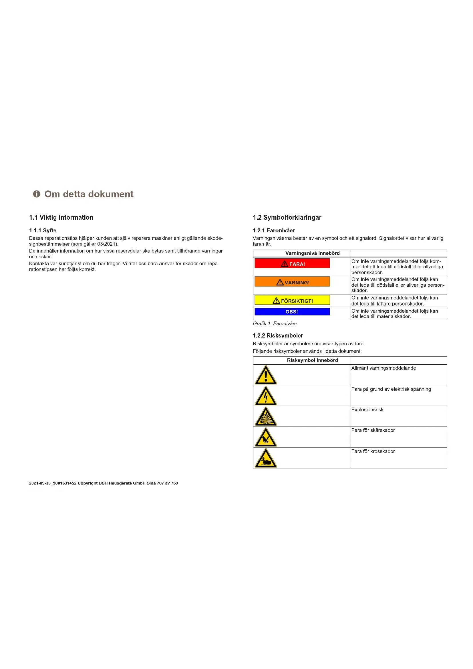 Följande allmänna symboler används i detta dokument: Allm. symbol Innebörd Identifiering av ett särskilt tips (text och/el- ler bild) Identifiering av ett enkelt tips (endast text) Allm. symbol Innebörd Identifiering av en länk till en videohand- ledning Identifiering av verktyg som behövs Identifiering av villkor som måste vara uppfyllda Identifiering av ett tillstånd (om ..., så ...) Identifiering av ett resultat Start Identifiering av en tangent eller knapp [00123456] Identifiering av ett materialnummer Status Identifiering av text/fönster som visas (i maskinens display) Grafik3: Allmänna symboler Om detta dokument 2021-09-30_9001631452 Copyright BSH Hausgeräte GmbH Sida708av769Säkerhet