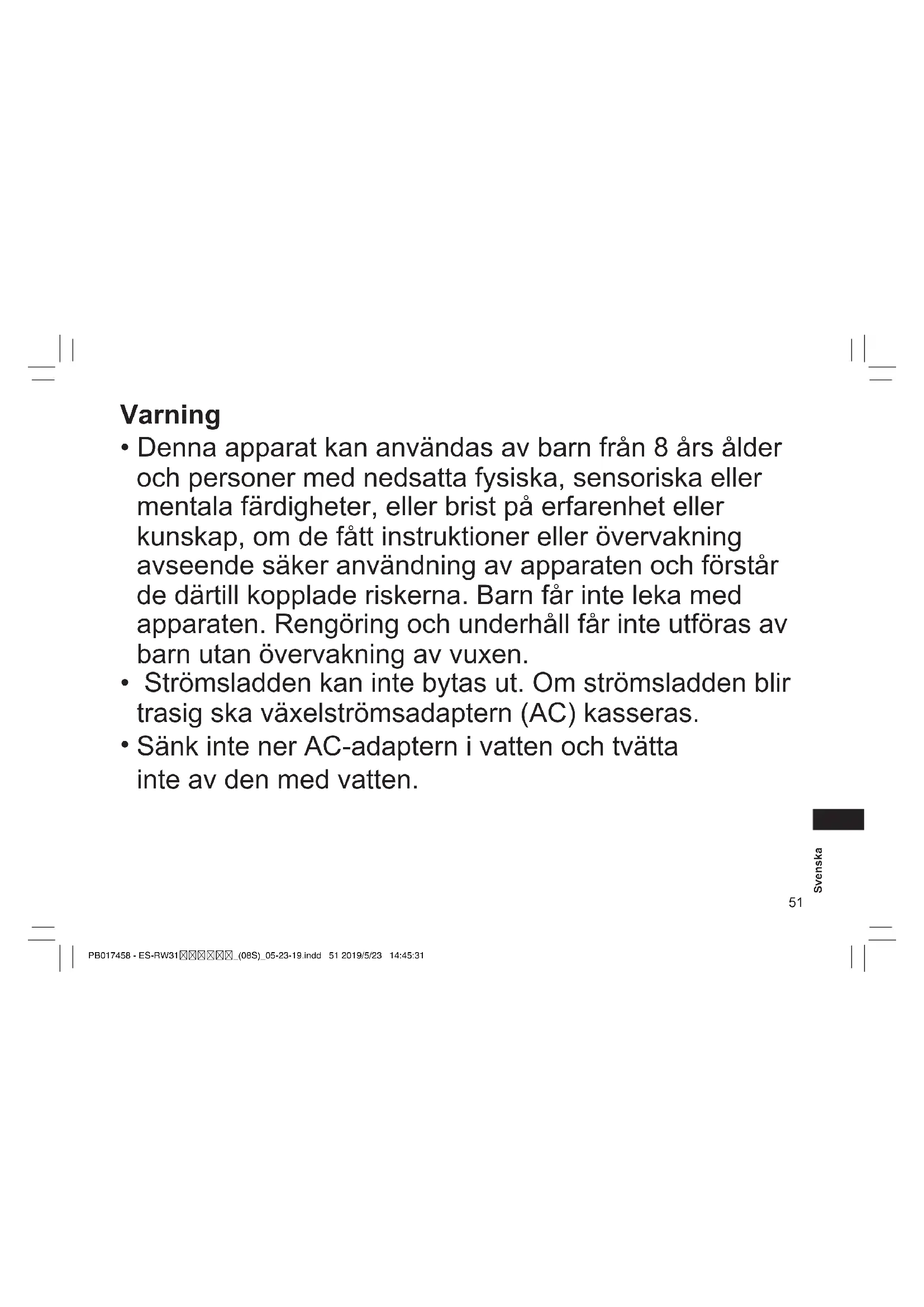 Strömsladden kan inte bytas ut. Om strömsladden blir trasig ska växelströmsadaptern (AC) kasseras. PB017458 - ES-RW31_(08S)_05-23-19.indd 51 2019/5/23 14:45:31 Sänk inte ner AC-adaptern i vatten och tvätta inte av den med vatten.52 Svenska