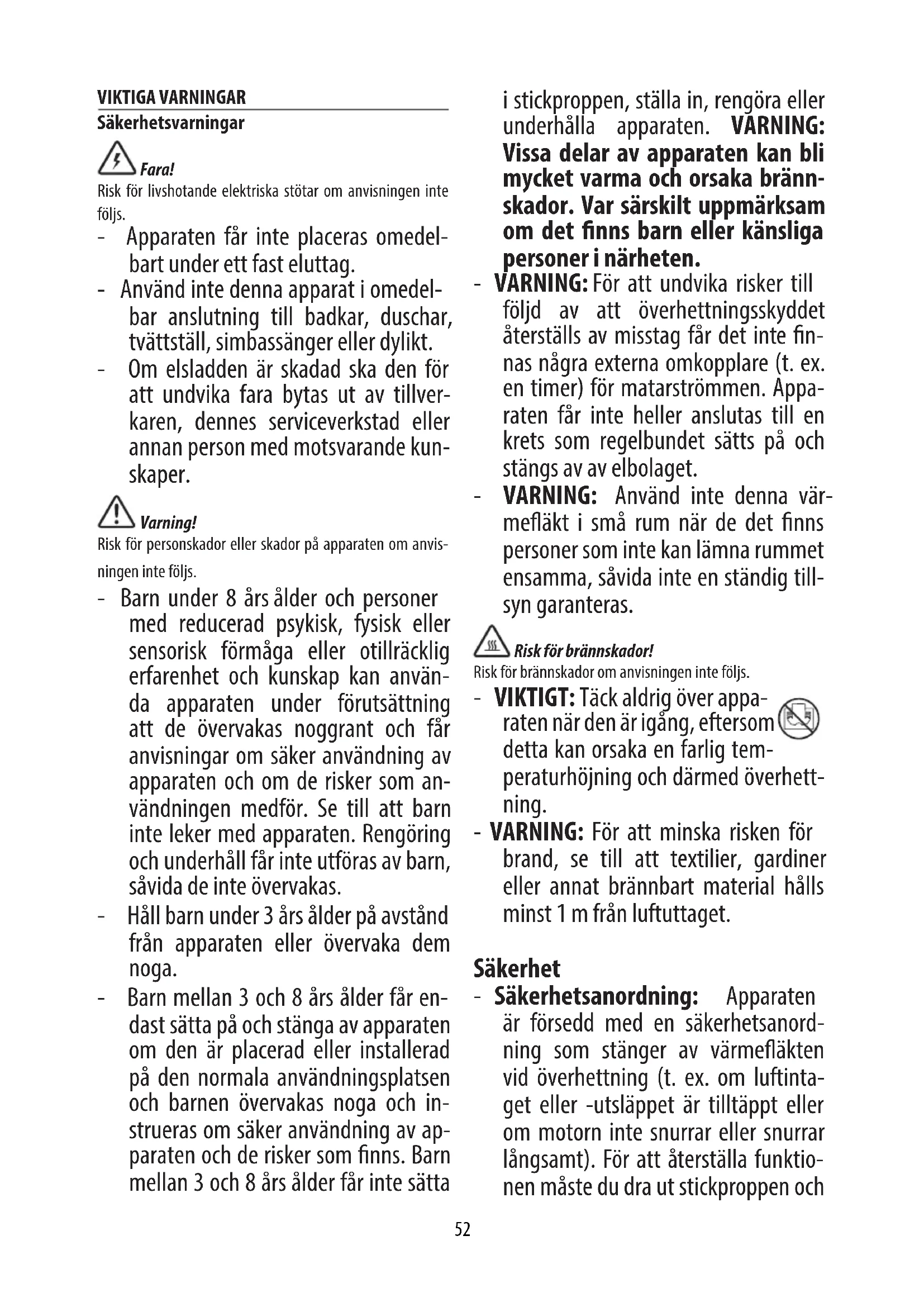 UTILGJENGELIG FOR BARN. - Svelging kan føre til alvorlige skad- er eller død på mindre enn 2 timer, grunnet kjemiske brannsår og mulig perforering av spiserøret. - Undersøk enhetene og forsikre deg om at batterirommet er korrekt luk- ket. Må ikke brukes hvis batterirom- met ikke er sikkert. - Kast brukte knappbatterier umiddel- bart og på en sikker måte. Brukte bat- terier kan uansett være farlige. Viktige sikkerhetsadvarsler Kjære kunde - mens apparatet er i funksjon varmes støpselet opp: dette er helt normalt. Dette er et OPPVARMINGSAPPARAT MED51 HØY EFFEKT, i overensstemmelse med våre høye standarder. Vi vil likevel be deg om å forsikre deg om at veggkontaktene dine er i god stand og at støpselet er korrekt satt inn i stikkontakten for å unngå all fare for utilsiktet overoppvarming. Hvis apparatet ikke skal brukes over lengre tid anbefaler vi at kontrollerer støpselet og STIKKONTAKTEN regelmessig, og alltid ta kontakt med en elektriker hvis du skulle være i tvil. Kun for marked utenfor EU: Dette produktet er ikke laget for å brukes av personer (inkludert barn) med redu- serte fysiske, sansemessige eller mentale evner, eller med manglende kunnskap om produktet, med mindre de overvåkes av eller har fått opplæring i bruken av produktet av en person som er ansvarlig for deres sikkerhet. Barn må overvåkes slik at de ikke leker med produktet.52 VIKTIGA VARNINGAR Säkerhetsvarningar Fara! Risk för livshotande elektriska stötar om anvisningen inte följs. - Apparaten får inte placeras omedel- bart under ett fast eluttag. - Använd inte denna apparat i omedel- bar anslutning till badkar, duschar, tvättställ, simbassänger eller dylikt. - Om elsladden är skadad ska den för att undvika fara bytas ut av tillver- karen, dennes serviceverkstad eller annan person med motsvarande kun- skaper. Varning! Risk för personskador eller skador på apparaten om anvis- ningen inte följs. - Barn under 8 års ålder och personer med reducerad psykisk, fysisk eller sensorisk förmåga eller otillräcklig erfarenhet och kunskap kan använ- da apparaten under förutsättning att de övervakas noggrant och får anvisningar om säker användning av apparaten och om de risker som an- vändningen medför. Se till att barn inte leker med apparaten. Rengöring och underhåll får inte utföras av barn, såvida de inte övervakas. - Håll barn under 3 års ålder på avstånd från apparaten eller övervaka dem noga. - Barn mellan 3 och 8 års ålder får en- dast sätta på och stänga av apparaten om den är placerad eller installerad på den normala användningsplatsen och barnen övervakas noga och in- strueras om säker användning av ap- paraten och de risker som nns. Barn mellan 3 och 8 års ålder får inte sätta i stickproppen, ställa in, rengöra eller underhålla apparaten. VARNING: Vissa delar av apparaten kan bli mycket varma och orsaka bränn- skador. Var särskilt uppmärksam om det nns barn eller känsliga personer i närheten. - VARNING: För att undvika risker till följd av att överhettningsskyddet återställs av misstag får det inte n- nas några externa omkopplare (t. ex. en timer) för matarströmmen. Appa- raten får inte heller anslutas till en krets som regelbundet sätts på och stängs av av elbolaget. - VARNING: Använd inte denna vär- meäkt i små rum när de det nns personer som inte kan lämna rummet ensamma, såvida inte en ständig till- syn garanteras. Risk för brännskador! Risk för brännskador om anvisningen inte följs. - VIKTIGT: Täck aldrig över appa- raten när den är igång, eftersom detta kan orsaka en farlig tem- peraturhöjning och därmed överhett- ning. - VARNING: För att minska risken för brand, se till att textilier, gardiner eller annat brännbart material hålls minst 1 m från luftuttaget. Säkerhet - Säkerhetsanordning: Apparaten är försedd med en säkerhetsanord- ning som stänger av värmeäkten vid överhettning (t. ex. om luftinta- get eller -utsläppet är tilltäppt eller om motorn inte snurrar eller snurrar långsamt). För att återställa funktio- nen måste du dra ut stickproppen och53 vänta i några minuter, åtgärda orsa- kerna till överhettningen och sedan sätta i stickproppen igen. Kontakta närmaste De’Longhi-verkstad om fe- let kvarstår. - Tippskydd: Vissa modeller är försed- da med ett tippskydd som stänger av apparaten om den faller. För att starta äkten igen behöver du bara placera den i vertikal position. Om het appa- raat weer aan te zetten, zet u het een- voudigweg weer overeind. OBS: Denna symbol visar på råd och information som är viktiga för användaren. - Använd apparaten på en vågrät och stabil yta. - Använd bara apparaten i vertikal posi- tion. - Använd inte apparaten om den har tappats. - Använd inte apparaten om den har synliga tecken på skador. - Använd helst inte förlängningsslad- dar. Om du måste använda en för- längningssladd bör du noggrant följa instruktionerna för denna och se till att inte överskrida den maximieekt som anges på den. - Använd inte apparaten nära väggar, möbler, gardiner och dylikt. - Använd inte denna apparat i rum med mindre golvyta än 4m². - Kontrollera att apparaten är helt av- stängd och att stickkontakten är ur- dragen innan du ställer undan appa- raten. Förvara inte apparaten i dammiga ut- rymmen. - Placera inga föremål ovanpå appara- ten. - Apparaten får inte på något vis häng- as upp. - Vissa modeller har en anordning som fördröjer äktens avstängning med några sekunder. - Använd inte apparaten för att torka tvätt. Hindra inte luftens in- och uttag (risk för överhettning). - Endast för torktumlare: den här appa- raten är endast avsedd för torkning av tyg som tvättats i vatten. Viktigt!