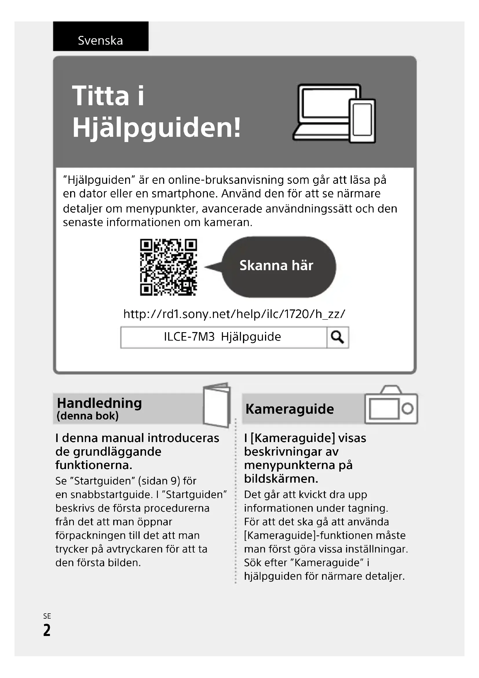 C:\1102\4732950411ILCE7M3CEC\11SE-ILCE7M3CEC\010BEF.indd DTP data saved: 2017/10/25 18:43 PDF file created: 2017/11/02 15:36 Svenska Titta i Hjälpguiden! ”Hjälpguiden” är en online-bruksanvisning som går att läsa på en dator eller en smartphone. Använd den för att se närmare detaljer om menypunkter, avancerade användningssätt och den senaste informationen om kameran. Skanna här http://rd1.sony.net/help/ilc/1720/h_zz/ Handledning (denna bok) Kameraguide I denna manual introduceras de grundläggande funktionerna. Se ”Startguiden” (sidan 9) för en snabbstartguide. I ”Startguiden” beskrivs de första procedurerna från det att man öppnar förpackningen till det att man trycker på avtryckaren för att ta den första bilden. I [Kameraguide] visas beskrivningar av menypunkterna på bildskärmen. Det går att kvickt dra upp informationen under tagning.För att det ska gå att använda [Kameraguide]-funktionen måste man först göra vissa inställningar. Sök efter ”Kameraguide” i hjälpguiden för närmare detaljer. ILCE-7M3 HjälpguideILCE-7M3 4-732-950-41(1)