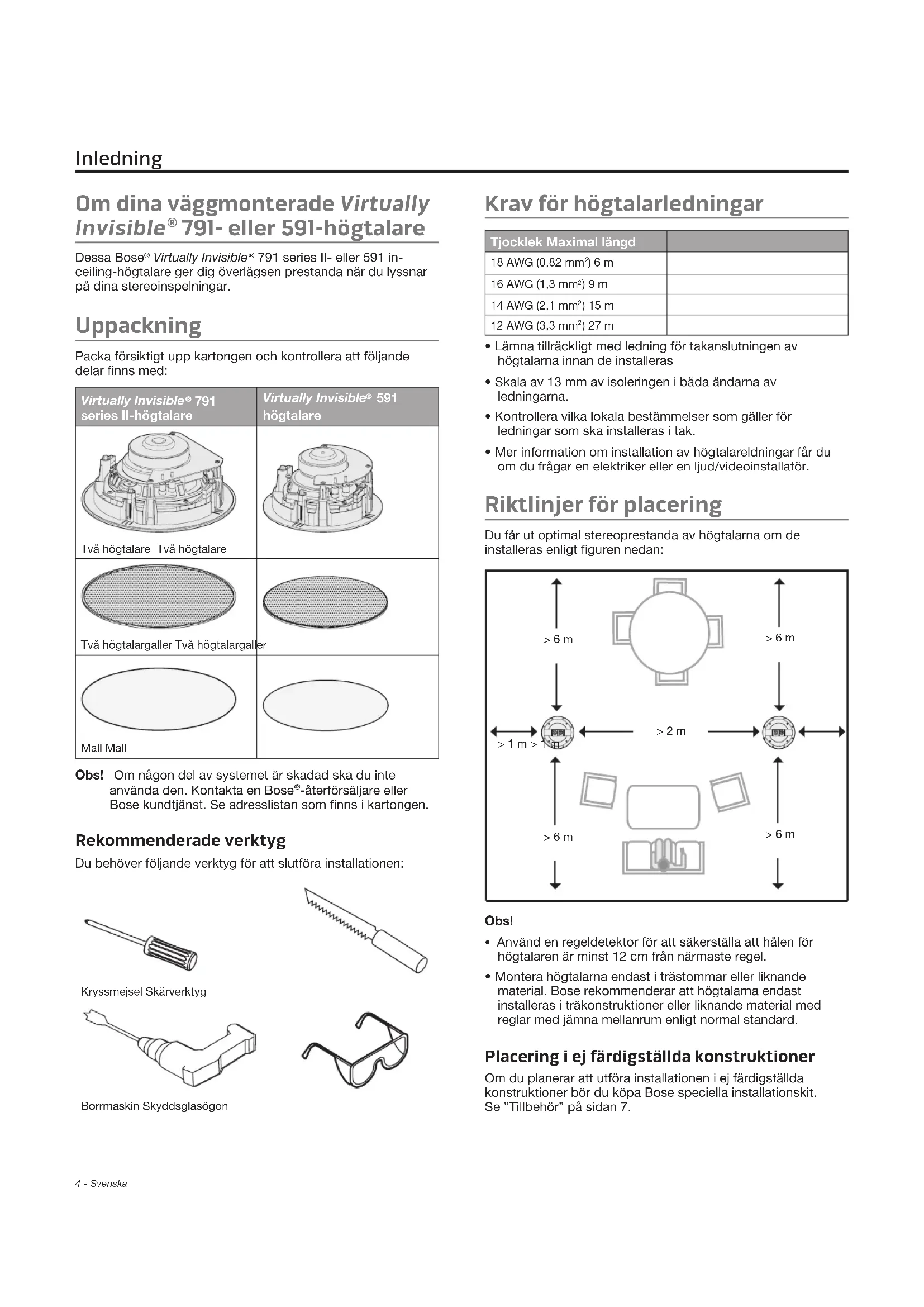 -återförsäljare eller Bose kundtjänst. Se adresslistan som finns i kartongen. Rekommenderade verktyg Du behöver följande verktyg för att slutföra installationen: Kryssmejsel SkärverktygBorrmaskin Skyddsglasögon Krav för högtalarledningar Tjocklek Maximal längd 18 AWG (0,82 mm ) 6 m16 AWG (1,3 mm ) 9 m14 AWG (2,1 mm ) 15 m12 AWG (3,3 mm ) 27 m