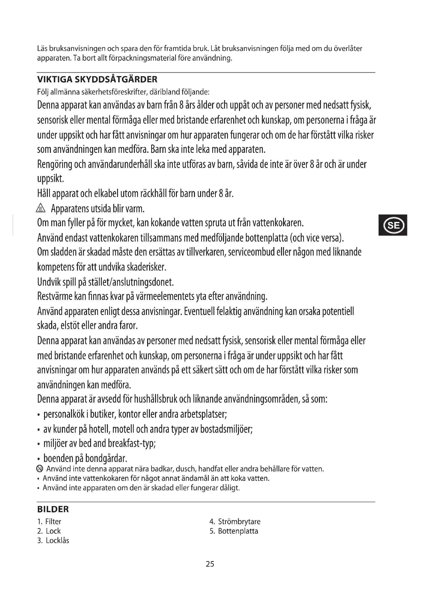 Följ allmänna säkerhetsföreskrifter, däribland följande: Denna apparat kan användas av barn från 8 års ålder och uppåt och av personer med nedsatt fysisk, sensorisk eller mental förmåga eller med bristande erfarenhet och kunskap, om personerna i fråga är under uppsikt och har fått anvisningar om hur apparaten fungerar och om de har förstått vilka risker som användningen kan medföra. Barn ska inte leka med apparaten. Rengöring och användarunderhåll ska inte utföras av barn, såvida de inte är över 8 år och är under uppsikt. Håll apparat och elkabel utom räckhåll för barn under 8 år. h Apparatens utsida blir varm. Om man fyller på för mycket, kan kokande vatten spruta ut från vattenkokaren. Använd endast vattenkokaren tillsammans med medföljande bottenplatta (och vice versa). Om sladden är skadad måste den ersättas av tillverkaren, serviceombud eller någon med liknande kompetens för att undvika skaderisker. Undvik spill på stället/anslutningsdonet. Restvärme kan nnas kvar på värmeelementets yta efter användning. Använd apparaten enligt dessa anvisningar. Eventuell felaktig användning kan orsaka potentiell skada, elstöt eller andra faror. Denna apparat kan användas av personer med nedsatt fysisk, sensorisk eller mental förmåga eller med bristande erfarenhet och kunskap, om personerna i fråga är under uppsikt och har fått anvisningar om hur apparaten används på ett säkert sätt och om de har förstått vilka risker som användningen kan medföra. Denna apparat är avsedd för hushållsbruk och liknande användningsområden, så som: