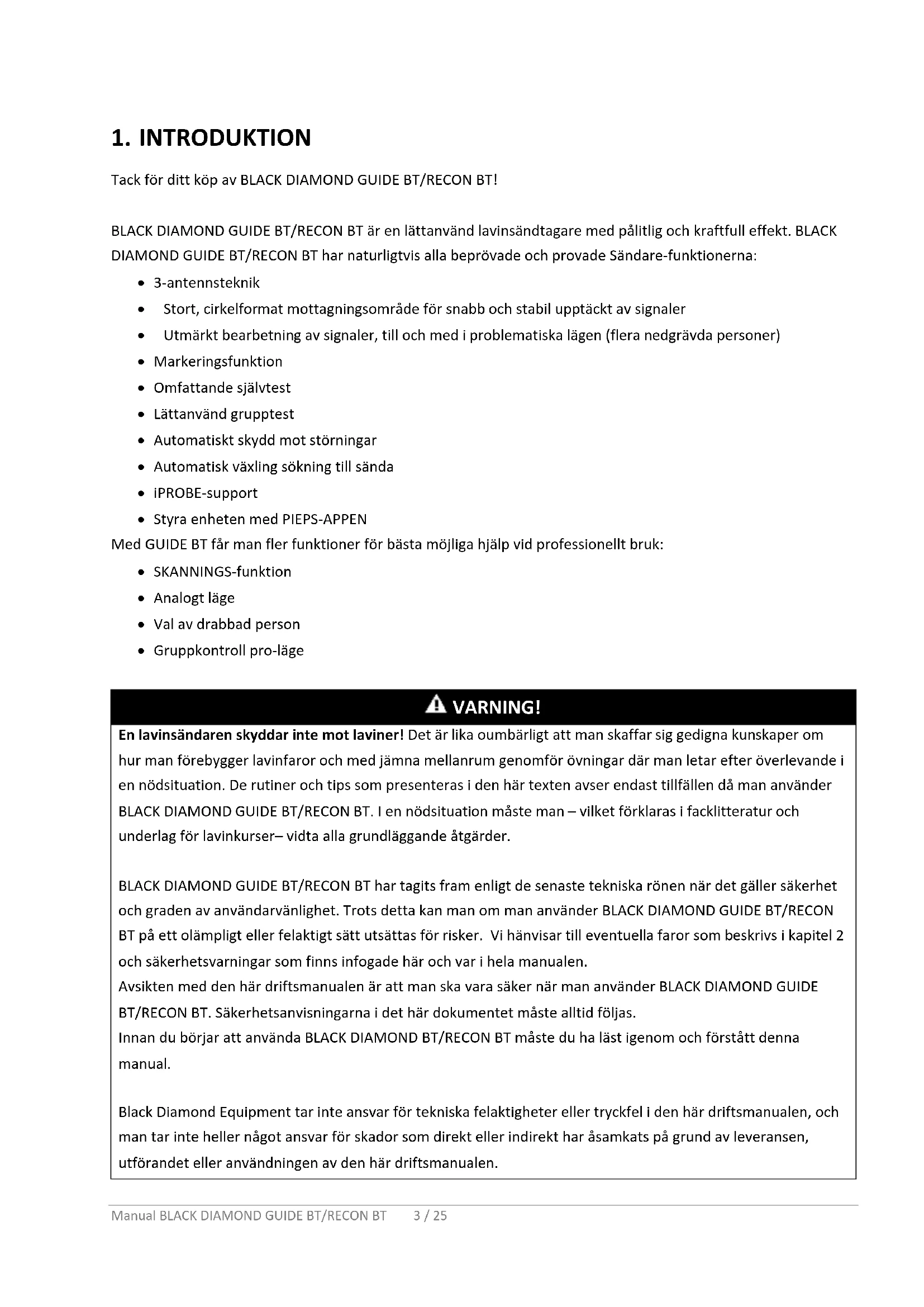 - Gruppkontroll pro-läge VARNING! En lavinsändaren skyddar inte mot laviner! Det är lika oumbärligt att man skaffar sig gedigna kunskaper om hur man förebygger lavinfaror och med jämna mellanrum genomför övningar där man letar efter överlevande i en nödsituation. De rutiner och tips som presenteras i den här texten avser endast tillfällen då man använder BLACK DIAMOND GUIDE BT/RECON BT. I en nödsituation måste man – vilket förklaras i facklitteratur och underlag för lavinkurser– vidta alla grundläggande åtgärder. BLACK DIAMOND GUIDE BT/RECON BT har tagits fram enligt de senaste tekniska rönen när det gäller säkerhet och graden av användarvänlighet. Trots detta kan man om man använder BLACK DIAMOND GUIDE BT/RECON BT på ett olämpligt eller felaktigt sätt utsättas för risker. Vi hänvisar till eventuella faror som beskrivs i kapitel 2 och säkerhetsvarningar som finns infogade här och var i hela manualen. Avsikten med den här driftsmanualen är att man ska vara säker när man använder BLACK DIAMOND GUIDE BT/RECON BT. Säkerhetsanvisningarna i det här dokumentet måste alltid följas. Innan du börjar att använda BLACK DIAMOND BT/RECON BT måste du ha läst igenom och förstått denna manual. Black Diamond Equipment tar inte ansvar för tekniska felaktigheter eller tryckfel i den här driftsmanualen, och man tar inte heller något ansvar för skador som direkt eller indirekt har åsamkats på grund av leveransen, utförandet eller användningen av den här driftsmanualen.Manual BLACK DIAMOND GUIDE BT/RECON BT 4 / 25 Copyright