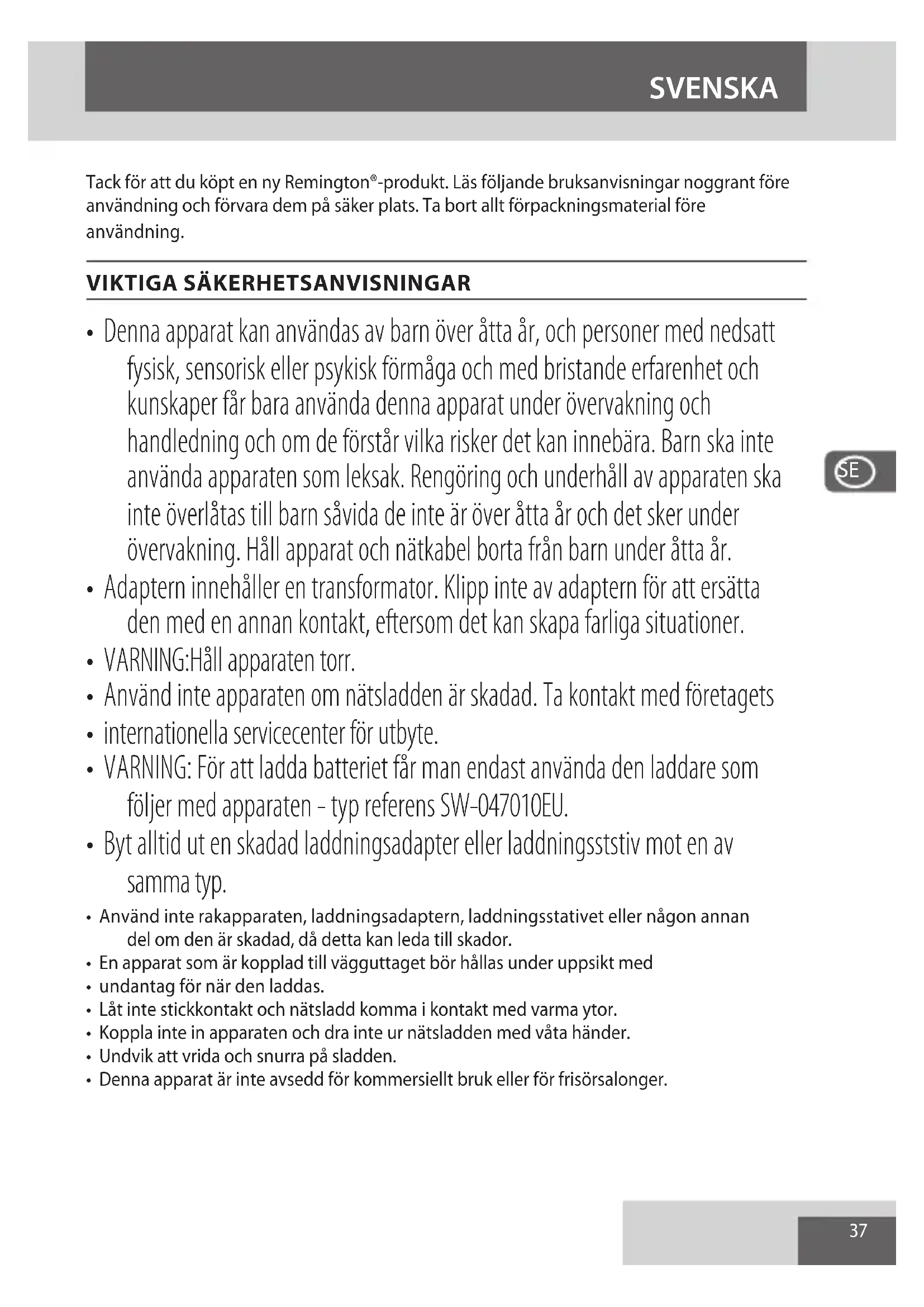 För att undvika miljö- och hälsoproblem pga. farliga ämnen får man inte kassera apparater eller laddningsbara och icke-laddningsbara batterier märkta med någon av dessa symboler i osorterat kommunalt avfall. Elektriska och elektroniska produkter och, där tillämpligt, laddningsbara och icke-laddningsbara batterier ska alltid kasseras vid en lämplig, officiell återvinnings-/uppsamlingsstation.41 Takk for at du kjøper et nytt Remington®-produkt. Vennligst les denne bruksanvisningen godt og legg den på et trygt sted. Fjern all emballasje før bruk. VIKTIG SIKKERHETSTILTAK