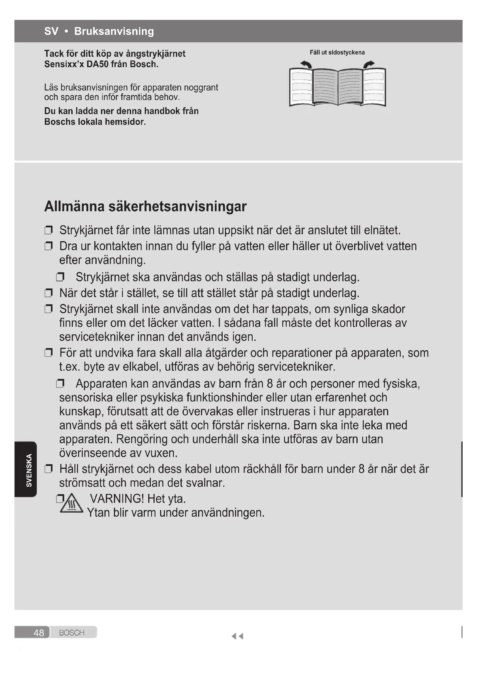 VARNING! Het yta. Ytan blir varm under användningen. SV • Bruksanvisning Tack för ditt köp av ångstrykjärnet Sensixx’x DA50 från Bosch. Läs bruksanvisningen för apparaten noggrant och spara den inför framtida behov. Du kan ladda ner denna handbok från Boschs lokala hemsidor. Fäll ut sidostyckena49 B O S C H