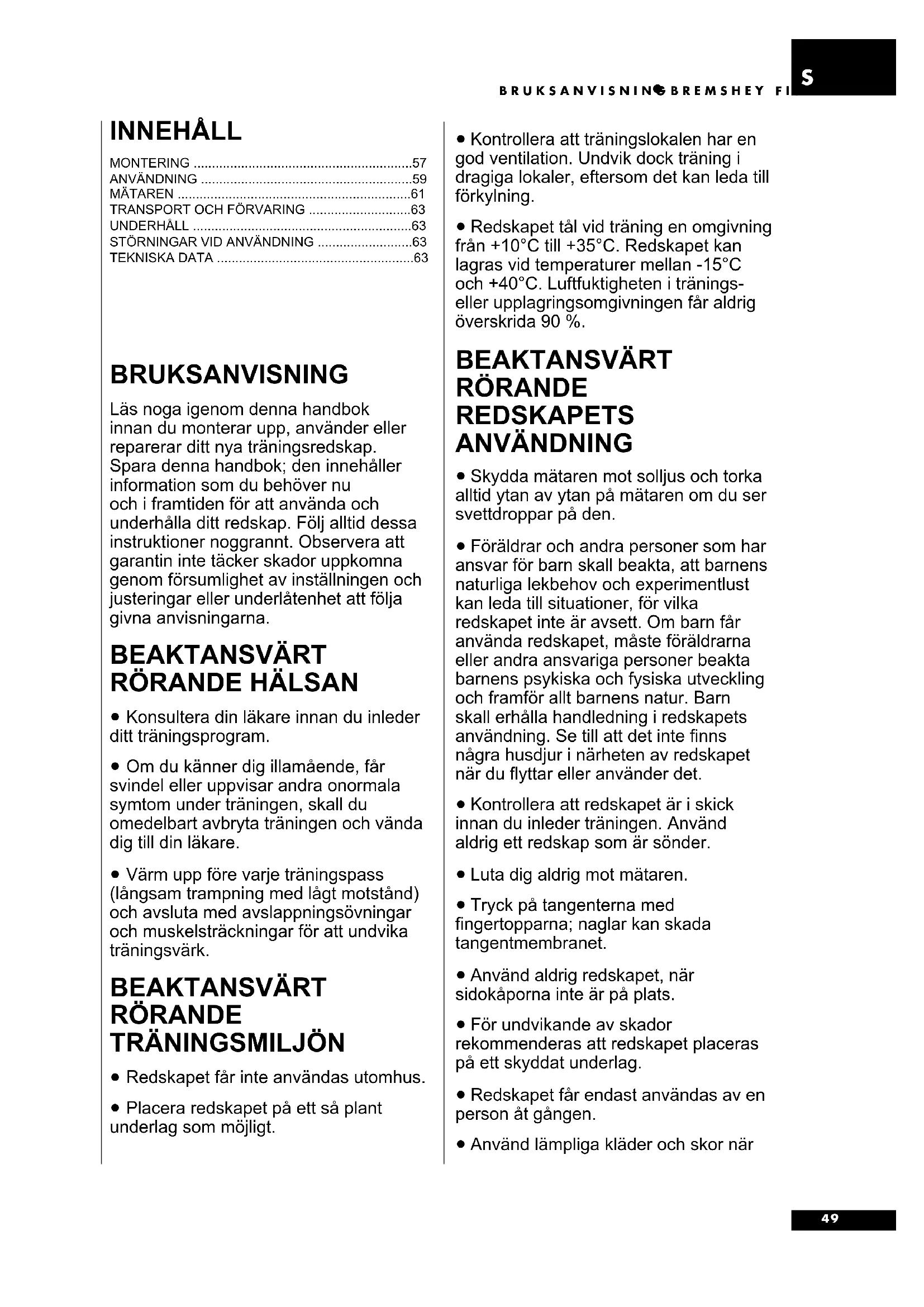 TEKNISKA DATA ......................................................63 BRUKSANVISNING Läs noga igenom denna handbok innan du monterar upp, använder eller reparerar ditt nya träningsredskap. Spara denna handbok; den innehåller information som du behöver nu och i framtiden för att använda och underhålla ditt redskap. Följ alltid dessa instruktioner noggrannt. Observera att garantin inte täcker skador uppkomna genom försumlighet av inställningen och justeringar eller underlåtenhet att följa givna anvisningarna. BEAKTANSVÄRT