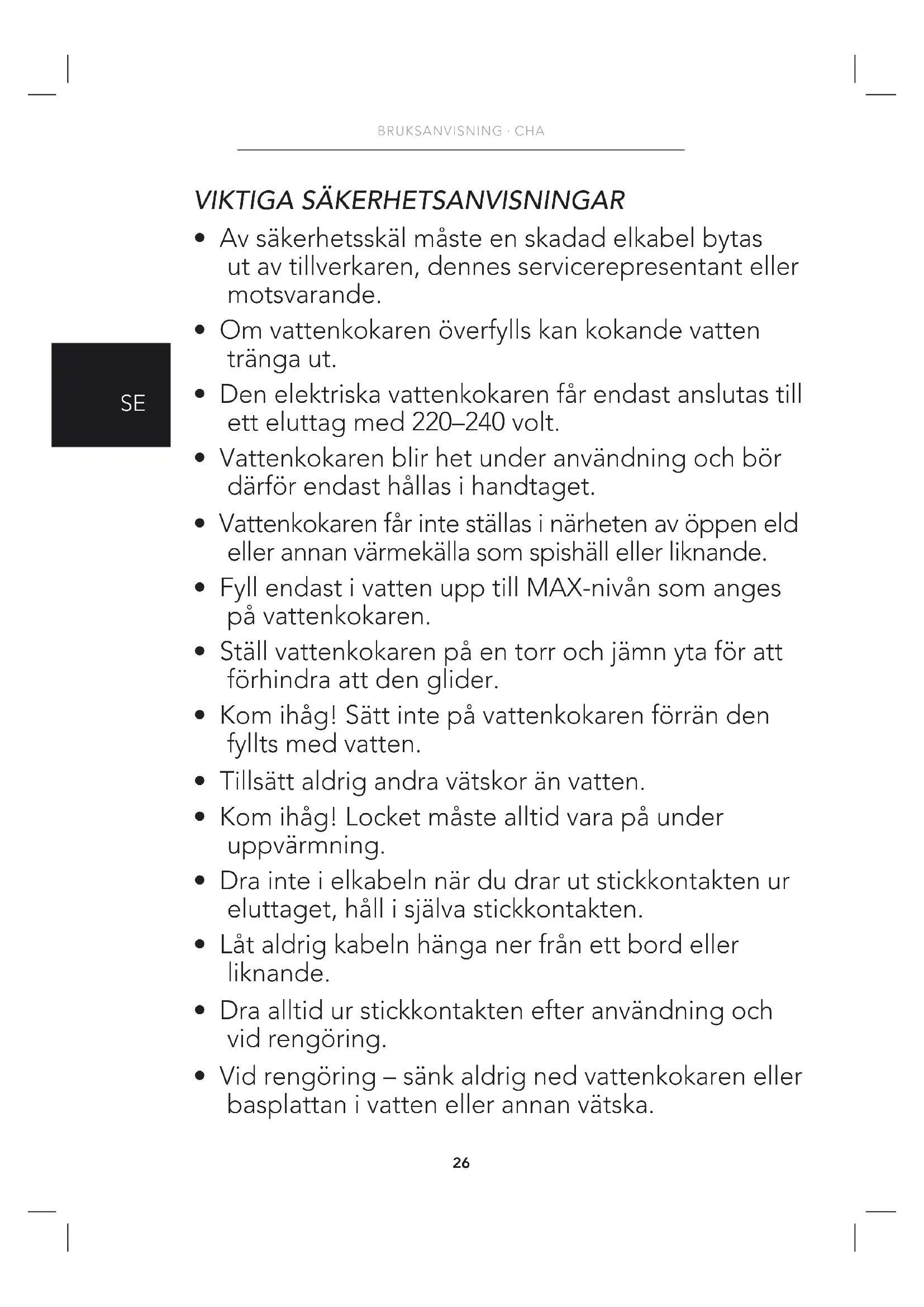 - Använd rent vatten när du sköljer ur vattenkokaren efter avkalkning.32 BRUKSANVISNING · CHA