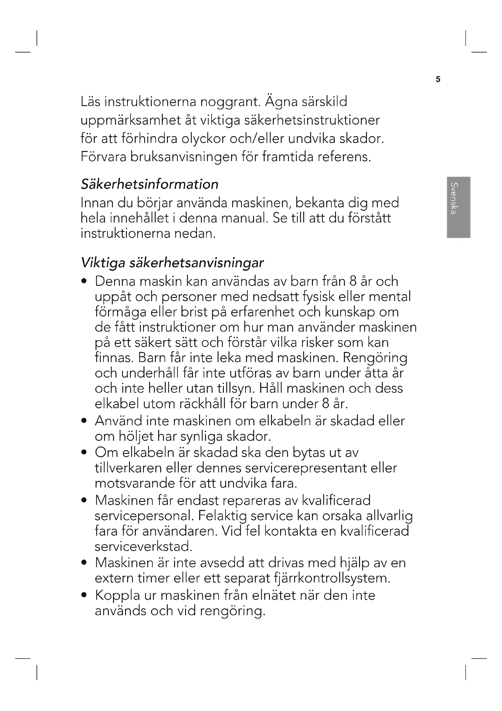 - Denna maskin kan användas av barn från 8 år och uppåt och personer med nedsatt fysisk eller mental förmåga eller brist på erfarenhet och kunskap om de fått instruktioner om hur man använder maskinen på ett säkert sätt och förstår vilka risker som kan finnas. Barn får inte leka med maskinen. Rengöring och underhåll får inte utföras av barn under åtta år och inte heller utan tillsyn. Håll maskinen och dess elkabel utom räckhåll för barn under 8 år.