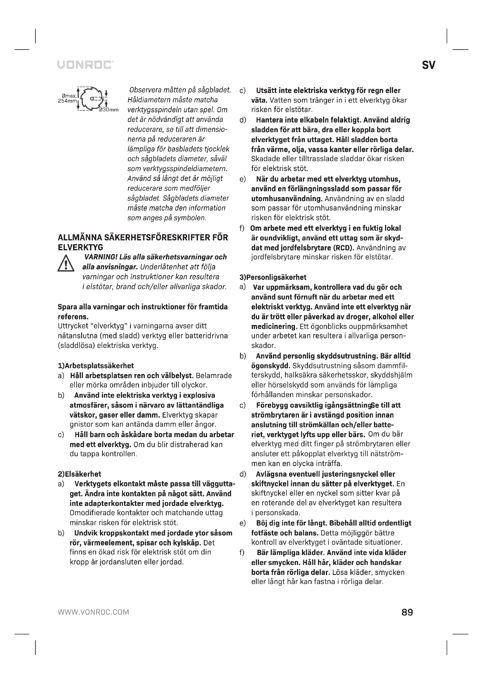 Var uppmärksam, kontrollera vad du gör och använd sunt förnuft när du arbetar med ett elektriskt verktyg. Använd inte ett elverktyg när du är trött eller påverkad av droger, alkohol eller medicinering. Ett ögonblicks ouppmärksamhet under arbetet kan resultera iallvarliga person- skador. b) Använd personlig skyddsutrustning. Bär alltid ögonskydd. Skyddsutrustning såsom dammfil- terskydd, halksäkra säkerhetsskor, skyddshjälm eller hörselskydd som används för lämpliga förhållanden minskar personskador. c) Förebygg oavsiktlig igångsättning. Se till att strömbrytaren är iavstängd position innan anslutning till strömkällan och/eller batte- riet, verktyget lyfts upp eller bärs. Om du bär elverktyg med ditt finger på strömbrytaren eller ansluter ett påkopplat elverktyg till nätström- men kan en olycka inträffa. d) Avlägsna eventuell justeringsnyckel eller skiftnyckel innan du sätter på elverktyget. En skiftnyckel eller en nyckel som sitter kvar på en roterande del av elverktyget kan resultera ipersonskada. e) Böj dig inte för långt. Bibehåll alltid ordentligt fotfäste och balans. Detta möjliggör bättre kontroll av elverktyget ioväntade situationer. f) Bär lämpliga kläder. Använd inte vida kläder eller smycken. Håll hår, kläder och handskar borta från rörliga delar. Lösa kläder, smycken eller långt hår kan fastna irörliga delar. Ø30mm Ømax. 254mm Observera måtten på sågbladet. Håldiametern måste matcha verktygsspindeln utan spel. Om det är nödvändigt att använda reducerare, se till att dimensio- nerna på reduceraren är lämpliga för basbladets tjocklek och sågbladets diameter, såväl som verktygsspindeldiametern. Använd så långt det är möjligt reducerare som medföljer sågbladet. Sågbladets diameter måste matcha den information som anges på symbolen. ALLMÄNNA SÄKERHETSFÖRESKRIFTER FÖR ELVERKTYG VARNING! Läs alla säkerhetsvarningar och alla anvisningar. Underlåtenhet att följa varningar och instruktioner kan resultera ielstötar, brand och/eller allvarliga skador. Spara alla varningar och instruktioner för framtida referens. Uttrycket “elverktyg” ivarningarna avser ditt nätanslutna (med sladd) verktyg eller batteridrivna (sladdlösa) elektriska verktyg.
