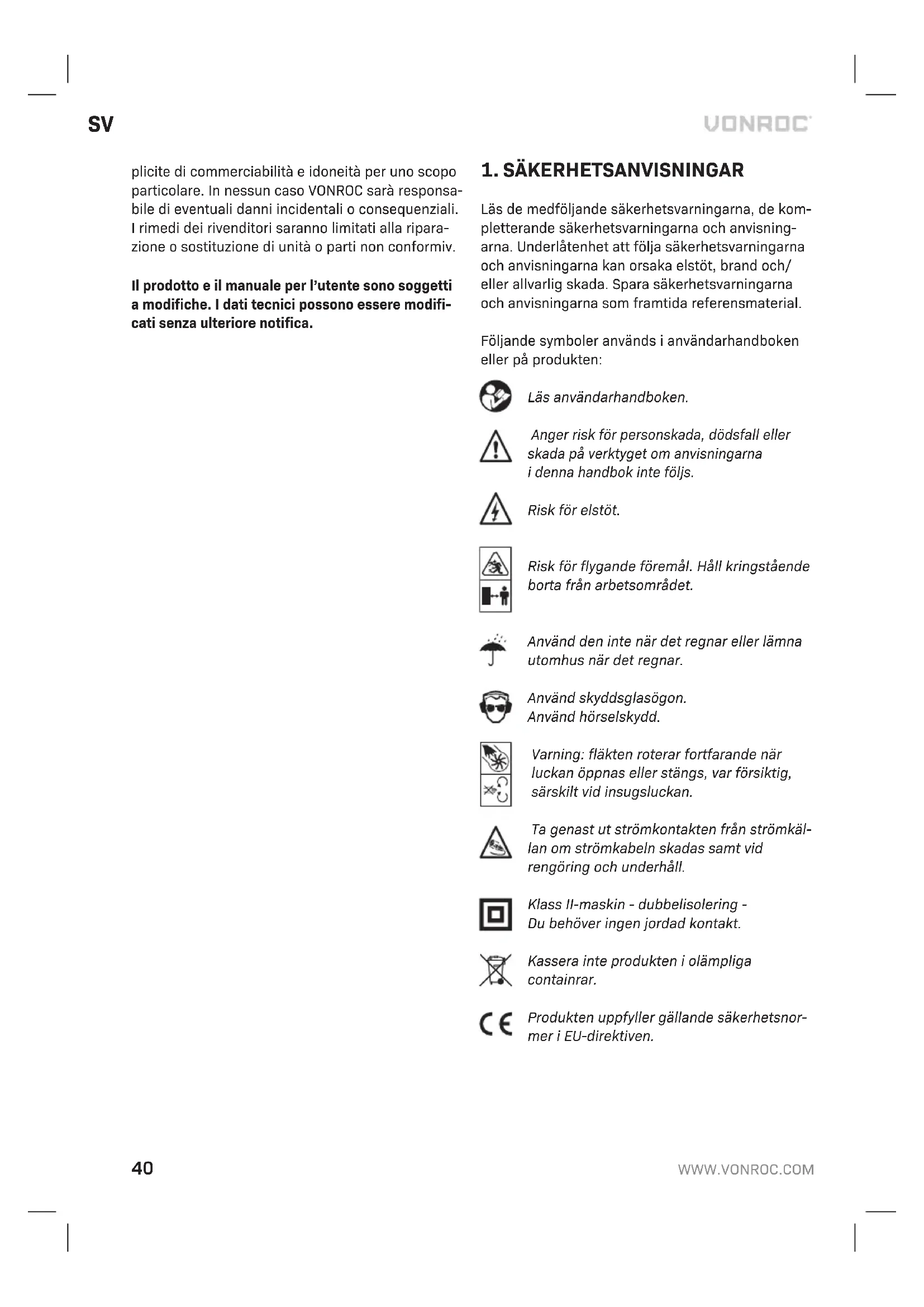 - Reservdelar som inte är original har använts. Detta utgör den enda garantin som företaget ger antingen uttryckt eller underförstått. Det finns inga andra garantier uttryckta eller underförstådda som sträcker sig bortom detta, inklusive de underförståd- da garantierna för säljbarhet och lämplighet för ett visst syfte. Under inga omständigheter ska VONROC hållas ansvarigt för indirekta skador eller följdska- dor. Återförsäljarnas åtgärder ska begränsas till reparation eller byte av enheter eller delar som inte uppfyller kraven. Produkten och användarhandboken kan ändras. Specifikationerna kan ändras utan förvarning.46