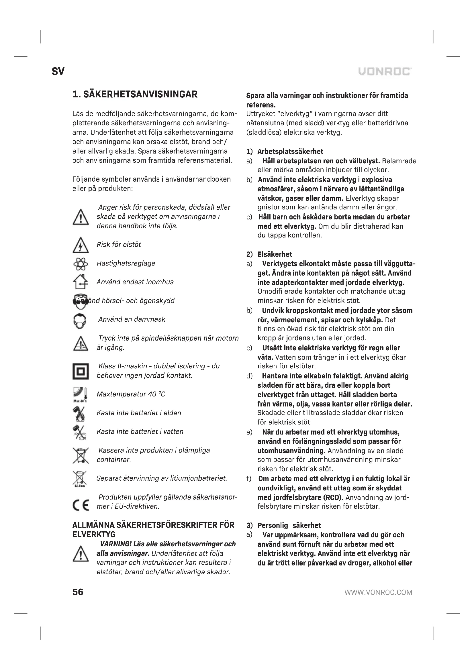 - Reservdelar som inte är original har använts. Detta utgör den enda garantin som företaget ger antingen uttryckt eller underförstått. Det fi nns inga andra garantier uttryckta eller underförstådda som sträcker sig bortom detta, inklusive de underför- stådda garantierna för säljbarhet och lämplighet för ett visst syfte. Under inga omständigheter ska VONROC hållas ansvarigt för indirekta skador eller följdskador. Återförsäljarnas åtgärder ska begrän- sas till reparation eller byte av enheter eller delar som inte uppfyller kraven. Produkten och användarhandboken kan ändras. Specifi kationerna kan ändras utan förvarning.