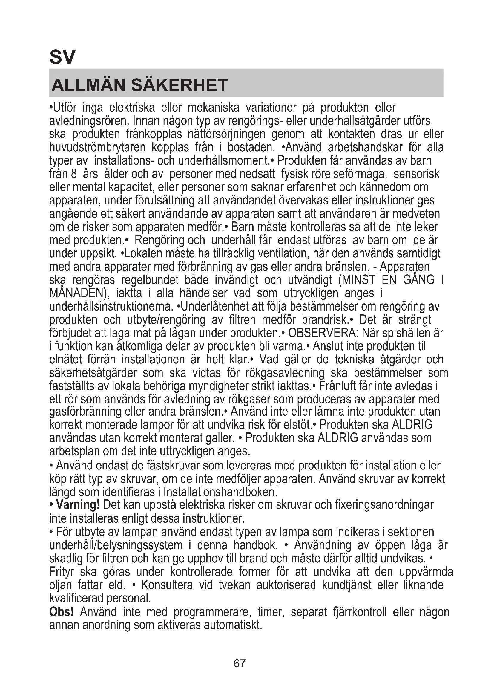 - För utbyte av lampan använd endast typen av lampa som indikeras i sektionen underhåll/belysningssystem i denna handbok. • Användning av öppen låga är skadlig för filtren och kan ge upphov till brand och måste därför alltid undvikas. • Frityr ska göras under kontrollerade former för att undvika att den uppvärmda oljan fattar eld. • Konsultera vid tvekan auktoriserad kundtjänst eller liknande kvalificerad personal. Obs! Använd inte med programmerare, timer, separat fjärrkontroll eller någon annan anordning som aktiveras automatiskt. 67• Minimum avståndet mellan stödytan för behållarna på kokanordningen och köksfläktens nedersta del får inte vara under 55 cm i fall av elektriska spisar och 65 cm i fall av gasspisar eller blandade. Om instruktionerna för installation av gasspisanordningen specificerar ett större avstånd ska detta följas. Håll barn under 3 år borta från apparaten. Apparaten måste förvaras utom räckhåll för barn under 8 år, som inte är under konstant uppsikt av en vuxen. VARNING: apparaten är inte avsedd att sättas i drift med hjälp av en extern enhet eller ett separat fjärrstyrningssystem. Denna apparat är inte avsedd för professionell användning. Använd inte apparaten utomhus. För att undvika risk för kroppsskador måste förflyttning och installation av apparaten utföras av två eller flera personer. Installationen, inklusive eventuell anslutning till vattenförsörjning (om sådan föreskrivs), samt elektriska anslutningar och reparationsåtgärder, måste utföras av kvalificerad personal. När installationen har slutförts förvaras förpackningsmaterialet (plastdelar, frigolit etc.) utom räckhåll för barn för att undvika kvävningsrisk. Använd inte apparaten om du är blöt eller barfota. Använd aldrig apparaten för ångrengöring – risk för elstöt. Emballagets material kan återanvändas till 100 % och är markerat med symbolen för återanvändning Apparatens utseende kan skilja sig från illustrationen i ritningarna i denna handbok men alla anvisningar för användning, underhåll och installation förblir desamma. Följ noga instruktionerna i denna handbok. Tillverkaren frånsäger sig allt ansvar för eventuella funktionsfel, skador eller bränder som uppstår på apparaten på grund av att instruktionerna i denna handbok inte har respekterats. Apparaten är endast avsedd för hushållsbruk för tillagning av livsmedel och utsugning av rök från själva tillagningen. Andra typer av användning är inte tillåtet (t.ex. rumsuppvärmning). Tillverkaren frånsäger sig allt ansvar för olämplig användning eller felaktiga inställningar av reglagen. ● Läs igenom instruktionerna noggrant: dessa tillhandahåller viktig information beträffande installation, användning och säkerhet. ● Utför inte elektriska ändringar på apparaten. ● Innan installation av apparaten påbörjas, kontrollera att inga skador har uppstått på komponenterna. Kontakta i annat fall återförsäljaren innan installationen utförs.