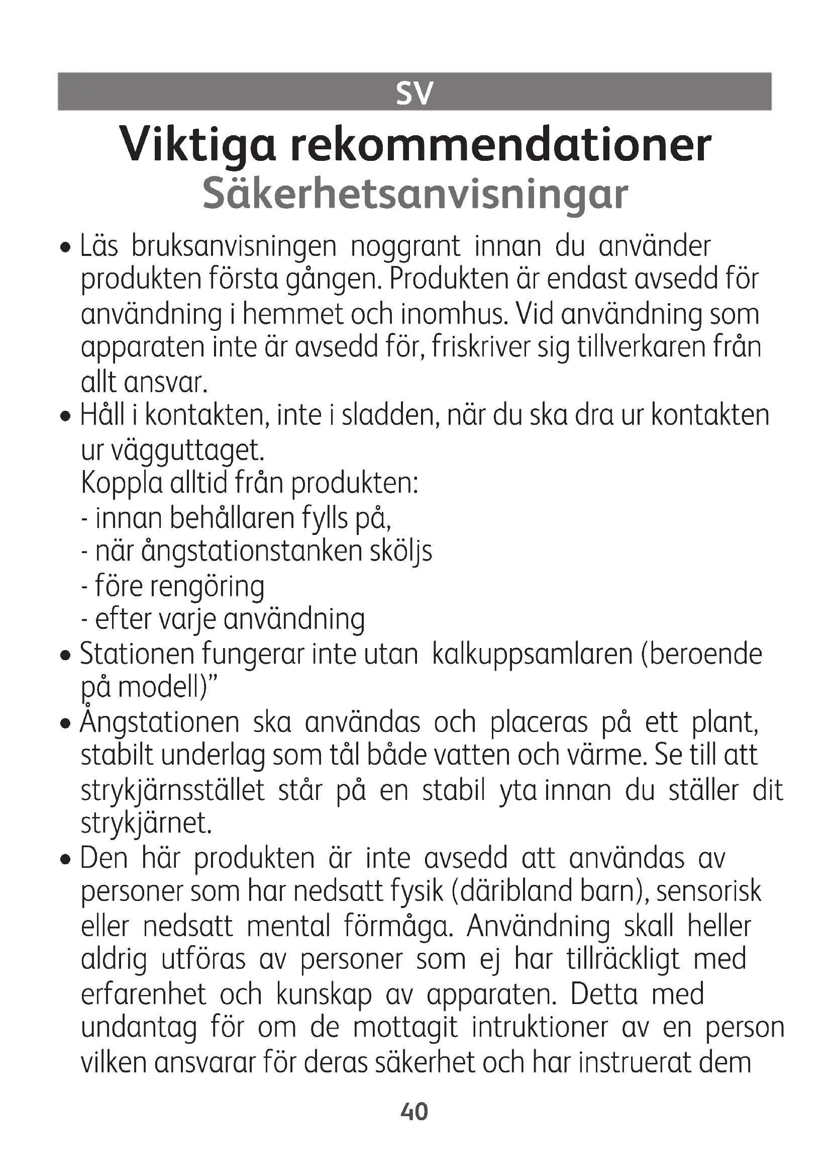 - Den här ångstationen är en elektrisk produkt : Den ska användas under normala användningsförhållanden. Den är endast avsedd att användas i hushållet.