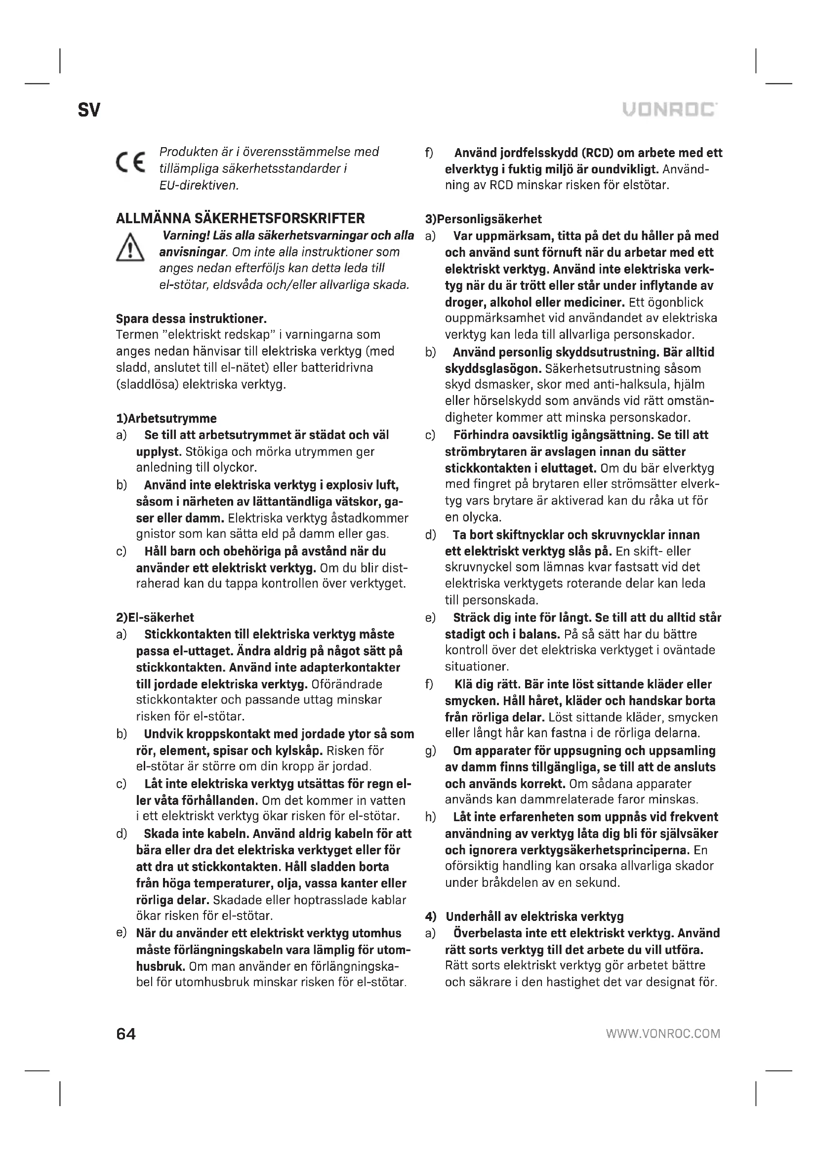 - Icke-originalreservdelar har använts. Detta utgör hela garantin från företaget, antingen uttryckt eller underförstått. Det finns inga andra garantier, uttalade eller underförstådda som gäller utöver ordalydelsen härav, häri, inklusive de outtalade garantierna för säljbarhet och lämplighet för ett särskilt syfte. Under inga omständigheter skall VONROC hållas ansvarig för några oförutsedda eller indirekta skador. Återförsäljarens åtgärder skall begränsas till reparation eller byte av felaktiga enheter eller delar. Med förbehåll för ändringar i produkten och bruksanvisningen. Specifikationer kan ändras utan förvarning.72