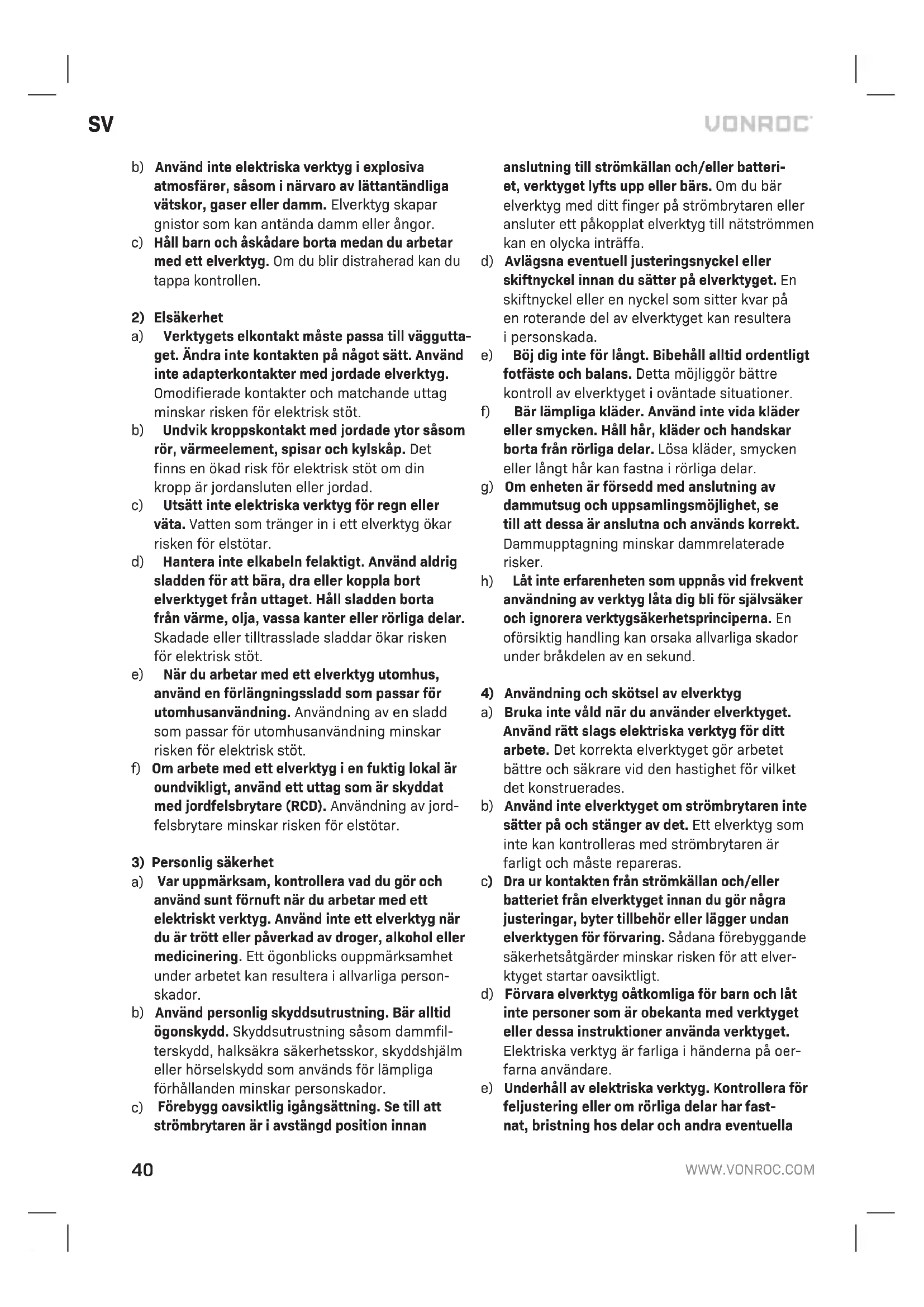 Ta bort mycket ihållande smuts med en mjuk trasa fuktad med tvållösning. Använd inte lösningsmedel som bensin, alkohol, ammoniak osv. Sådana kemika- lier skadar de syntetiska komponenterna. MILJÖ Felaktig och/eller kasserad elektrisk eller elektronisk utrustning måste lämnas in på lämpliga återvinningsstationer. Endast för EU-länder Kassera inte elverktyg ihushållsavfall. Enligt den europeiska riktlinjen 2012/19/EC om kasserad elek- trisk och elektronisk utrustning och dess tillämpning inationell rätt måste elverktyg som inte längre är användbara samlas in separat och kasseras på ett miljövänligt sätt. GARANTI VONROC-produkter är utvecklade enligt högsta kvali- tetsstandard och garanteras fria från defekter ibåde material och utförande under den period som lagen föreskriver från och med inköpsdatumet. Om produk- ten skulle utveckla fel under denna period på grund av defekt material och/eller utförande, kontakta då VONROC direkt. Följande omständigheter är undantagna från denna garanti: