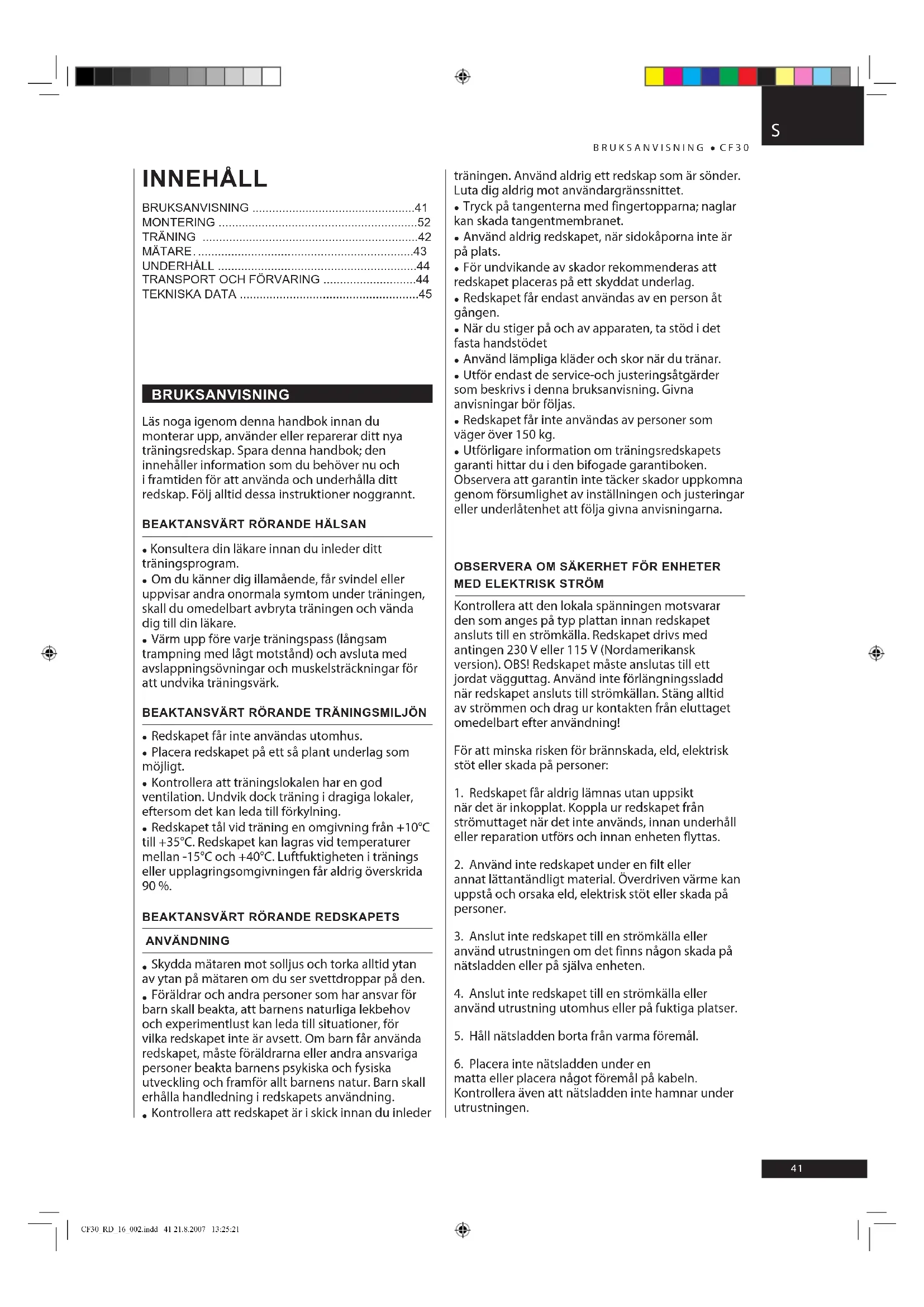 BRUKSANVISNING CF30 BRUKSANVISNING Läs noga igenom denna handbok innan du monterar upp, använder eller reparerar ditt nya träningsredskap. Spara denna handbok; den innehåller information som du behöver nu och i framtiden för att använda och underhålla ditt redskap. Följ alltid dessa instruktioner noggrannt.