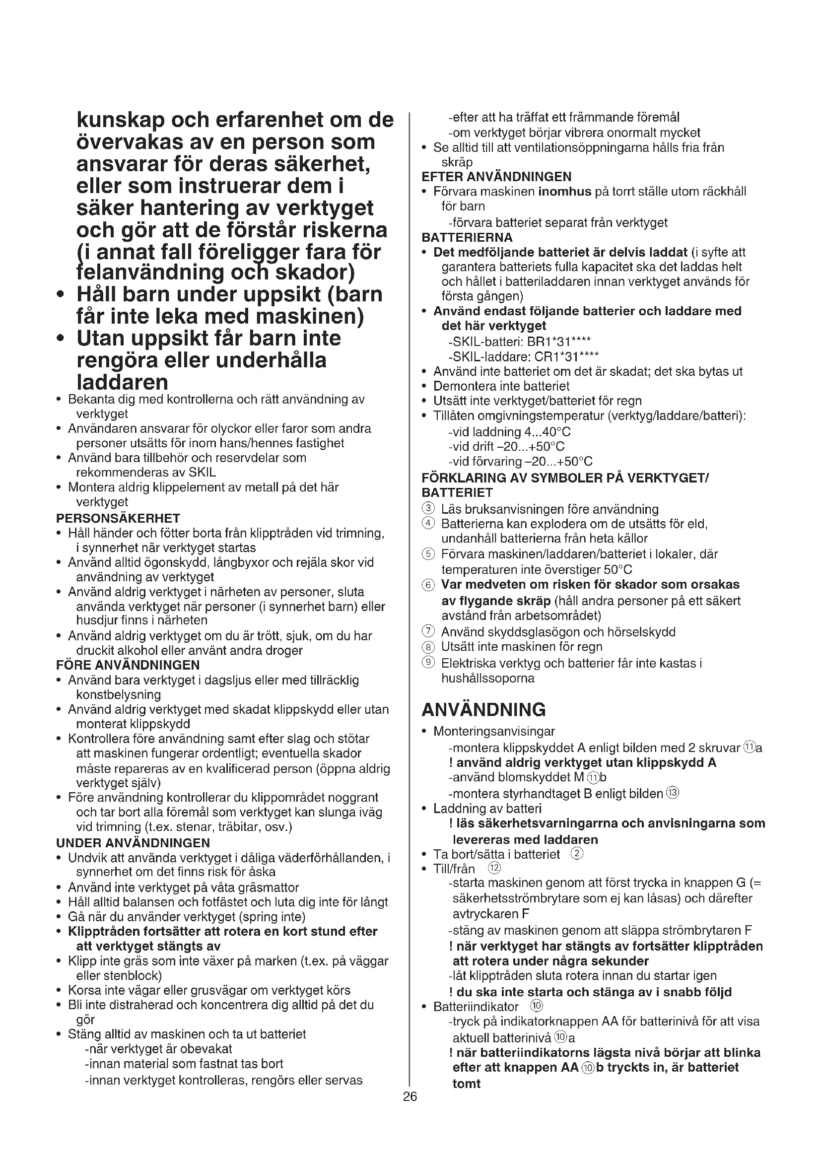 b tryckts in, är batteriet tomt kunskap och erfarenhet om de övervakas av en person som ansvarar för deras säkerhet, eller som instruerar dem i säker hantering av verktyget och gör att de förstår riskerna (i annat fall föreligger fara för felanvändning och skador)