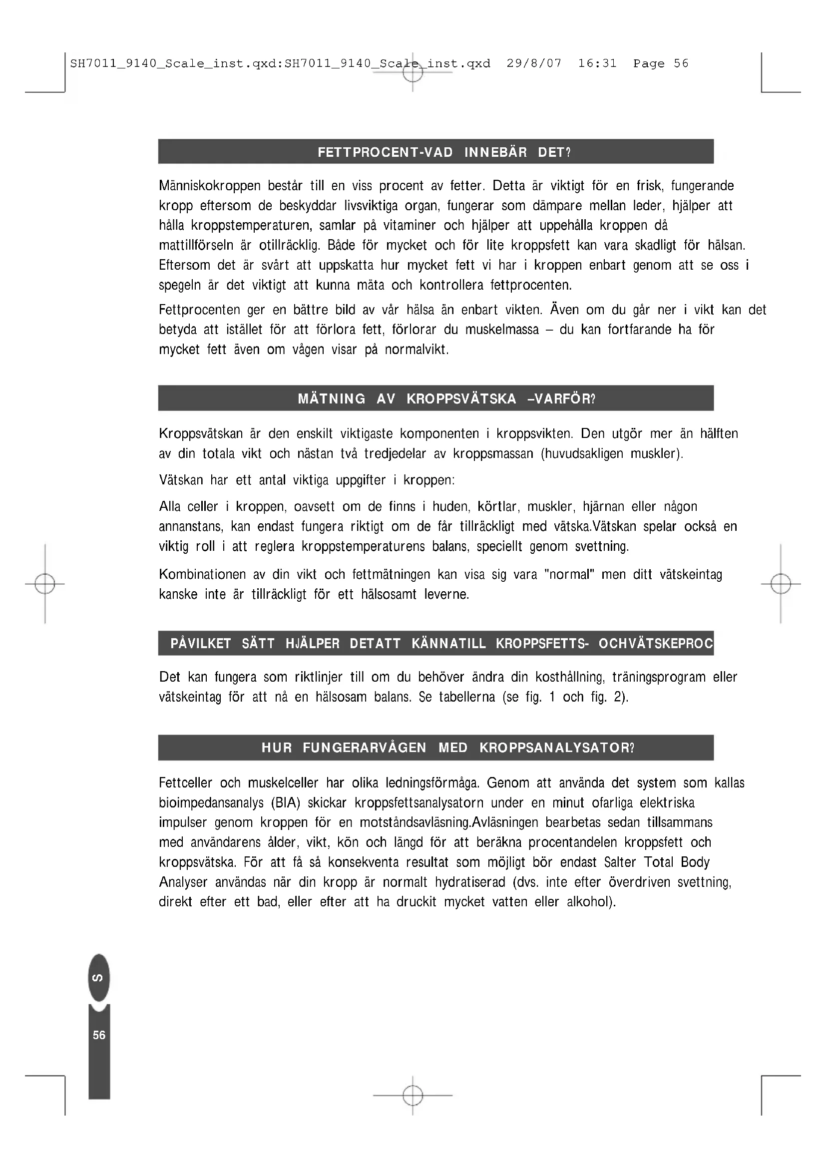Människokroppen består till en viss procent av fetter. Detta är viktigt för en frisk, fungerande kropp eftersom de beskyddar livsviktiga organ, fungerar som dämpare mellan leder, hjälper att hålla kroppstemperaturen, samlar på vitaminer och hjälper att uppehålla kroppen då mattillförseln är otillräcklig. Både för mycket och för lite kroppsfett kan vara skadligt för hälsan. Eftersom det är svårt att uppskatta hur mycket fett vi har i kroppen enbart genom att se oss i spegeln är det viktigt att kunna mäta och kontrollera fettprocenten. Fettprocenten ger en bättre bild av vår hälsa än enbart vikten. Även om du går ner i vikt kan det betyda att istället för att förlora fett, förlorar du muskelmassa – du kan fortfarande ha för mycket fett även om vågen visar på normalvikt. FETTPROCENT-VAD INNEBÄR DET? Kroppsvätskan är den enskilt viktigaste komponenten i kroppsvikten. Den utgör mer än hälften av din totala vikt och nästan två tredjedelar av kroppsmassan (huvudsakligen muskler). Vätskan har ett antal viktiga uppgifter i kroppen: Alla celler i kroppen, oavsett om de finns i huden, körtlar, muskler, hjärnan eller någon annanstans, kan endast fungera riktigt om de får tillräckligt med vätska.Vätskan spelar också en viktig roll i att reglera kroppstemperaturens balans, speciellt genom svettning. Kombinationen av din vikt och fettmätningen kan visa sig vara "normal" men ditt vätskeintag kanske inte är tillräckligt för ett hälsosamt leverne. MÄTNING AV KROPPSVÄTSKA –VARFÖR? Det kan fungera som riktlinjer till om du behöver ändra din kosthållning, träningsprogram eller vätskeintag för att nå en hälsosam balans. Se tabellerna (se fig. 1 och fig. 2). PÅVILKET SÄTT HJÄLPER DETATT KÄNNATILL KROPPSFETTS- OCHVÄTSKEPROCENT? Fettceller och muskelceller har olika ledningsförmåga. Genom att använda det system som kallas bioimpedansanalys (BIA) skickar kroppsfettsanalysatorn under en minut ofarliga elektriska impulser genom kroppen för en motståndsavläsning.Avläsningen bearbetas sedan tillsammans med användarens ålder, vikt, kön och längd för att beräkna procentandelen kroppsfett och kroppsvätska. För att få så konsekventa resultat som möjligt bör endast Salter Total Body Analyser användas när din kropp är normalt hydratiserad (dvs. inte efter överdriven svettning, direkt efter ett bad, eller efter att ha druckit mycket vatten eller alkohol). HUR FUNGERARVÅGEN MED KROPPSANALYSATOR? SH7011_9140_Scale_inst.qxd:SH7011_9140_Scale_inst.qxd 29/8/07 16:31 Page 56S