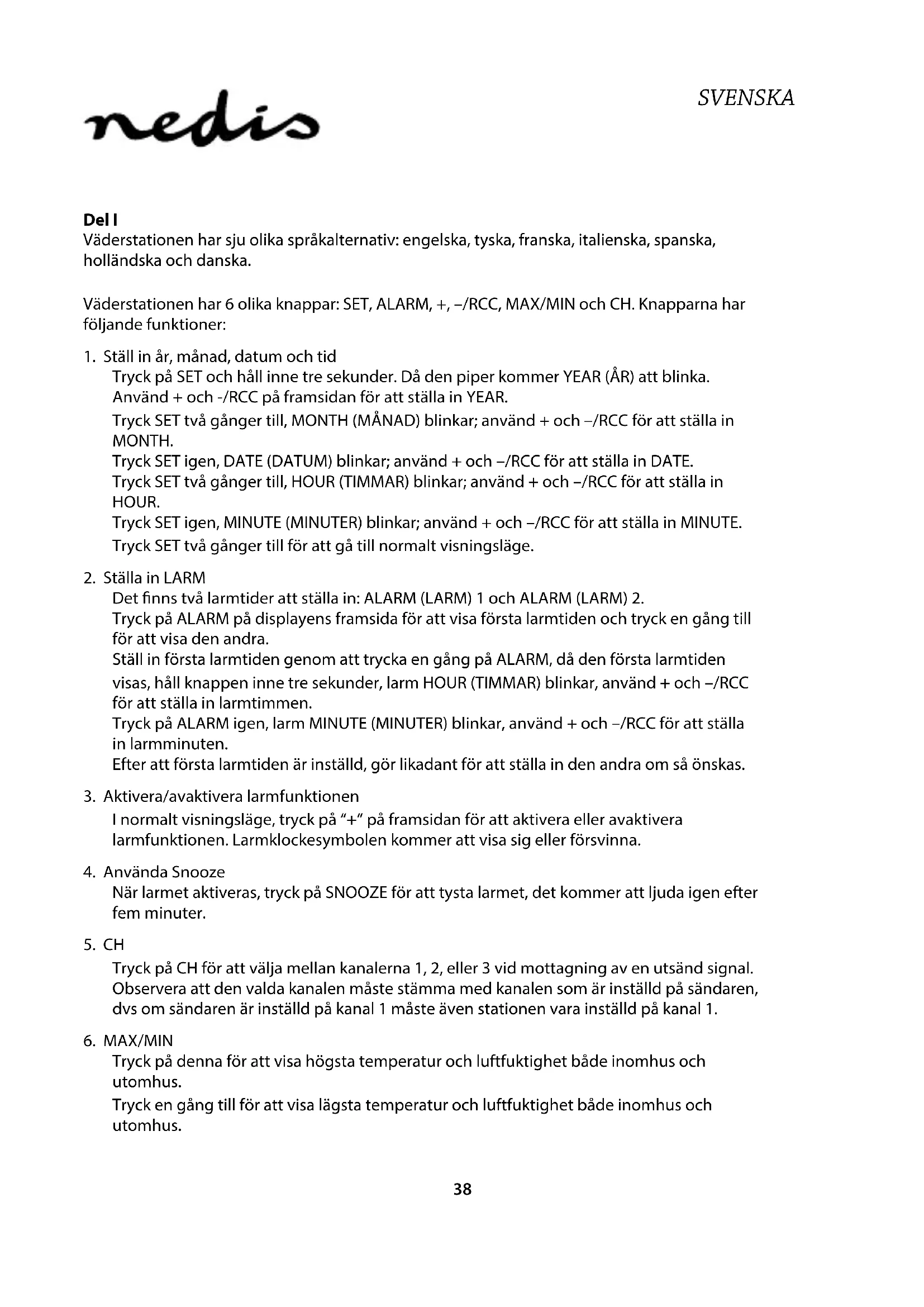 ÖPPNA INTE Säkerhetsanvisningar: För att minska risken för elektriska stötar bör denna produkt ENDAST öppnas av behörig tekniker när service behövs. Dra ut strömkabeln från eluttaget och koppla ur all annan utrustning om något problem skulle uppstå. Utsätt inte produkten för vatten eller fukt. Underhåll: Torka endast av med torr trasa. Använd inga rengöringsmedel som innehåller lösningsmedel eller slipmedel. Garanti: Varken garanti eller skadeståndsskyldighet gäller vid ändringar eller modieringar av produkten, eller för skador som har uppstått på grund av felaktig användning av denna produkt. Allmänt: Utseende och specikationer kan komma att ändras utan föregående meddelande. Alla logotyper och produktnamn är varumärken eller registrerade varumärken som tillhör sina ägare och är härmed erkända som sådana. Behåll bruksanvisningen och förpackningen för eventuellt framtida behov. Obs: Denna produkt är märkt med denna symbol. Produkten är märkt med denna symbol som betyder att använda elektriska eller elektroniska produkter inte får slängas bland vanliga hushållssopor. Det nns särskilda återvinningssystem för dessa produkter. Den här produkten har tillverkats och levereras i enlighet med alla relevanta regler och direktiv som gäller för alla medlemsstater inom Europeiska Unionen. Den efterlever även alla tillämpliga specikationer och regler i försäljningslandet. Formell dokumentation nns att beställa på begäran. Detta omfattar, men är inte begränsat till: Deklaration om överensstämmelse (och produktidentitet), materialsäkerhetsdatablad, produkttestrapport. Kontakta vår kundtjänst för att få hjälp: via webbplatsen: http://www.nedis.com/en-us/contact/contact-form.htm via e-post: service@nedis.com via telefon: +31 (0)73-5993965 (under kontorstid) NEDIS B.V., De Tweeling 28, 5215 MC ’s-Hertogenbosch, NEDERLÄNDERNA42 ČESKY Deel I Tato meteorologická stanice umožňuje nastavení 7 různých jazyků: angličtinu, němčinu, francouzštinu, italštinu, španělštinu, holandštinu a dánštinu. Meteorologická stanice je vybavena 6různými tlačítky: SET, ALARM, +, –/RCC, MAX/MIN. a CH. Tato tlačítka se používají pro tyto funkce: