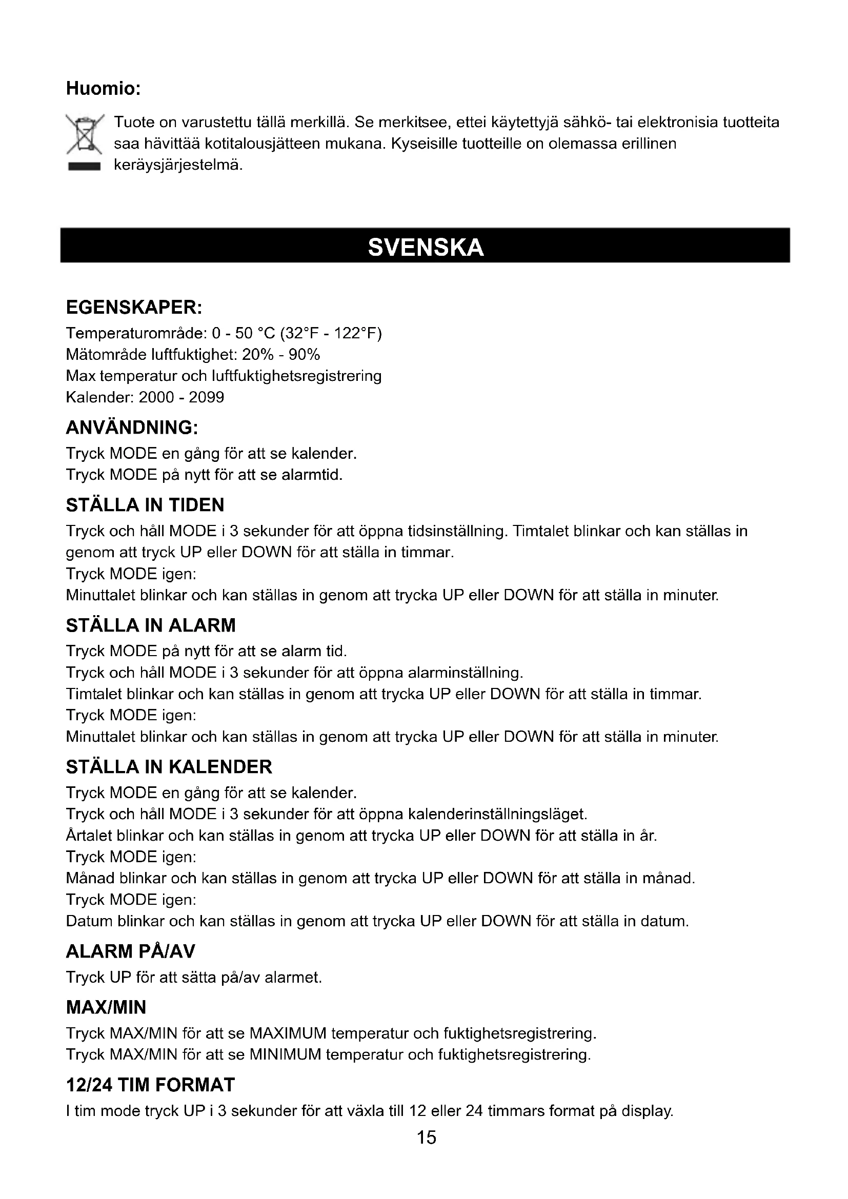 Tryck UP för att sätta på/av alarmet. MAX/MIN Tryck MAX/MIN för att se MAXIMUM temperatur och fuktighetsregistrering. Tryck MAX/MIN för att se MINIMUM temperatur och fuktighetsregistrering. 12/24 TIM FORMAT I tim mode tryck UP i 3 sekunder för att växla till 12 eller 24 timmars format på display.16