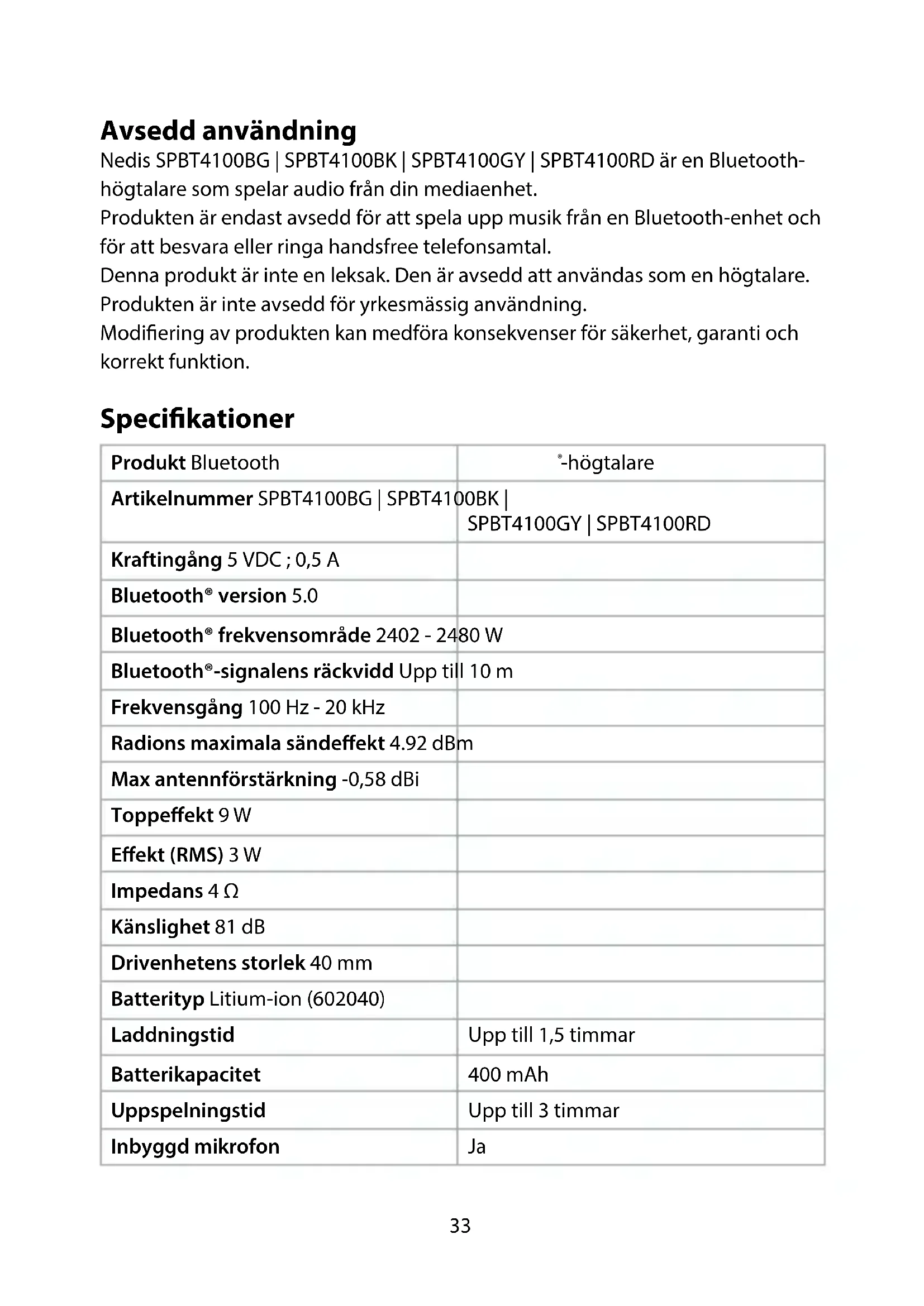 För ytterligare information, se den utökade manualen online: ned.is/spbt4100bg | ned.is/spbt4100bk ned.is/spbt4100gy | ned.is/spbt4100rd33 Avsedd användning Nedis SPBT4100BG | SPBT4100BK | SPBT4100GY | SPBT4100RD är en Bluetooth- högtalare som spelar audio från din mediaenhet. Produkten är endast avsedd för att spela upp musik från en Bluetooth-enhet och för att besvara eller ringa handsfree telefonsamtal. Denna produkt är inte en leksak. Den är avsedd att användas som en högtalare. Produkten är inte avsedd för yrkesmässig användning. Modiering av produkten kan medföra konsekvenser för säkerhet, garanti och korrekt funktion. Specikationer Produkt Bluetooth