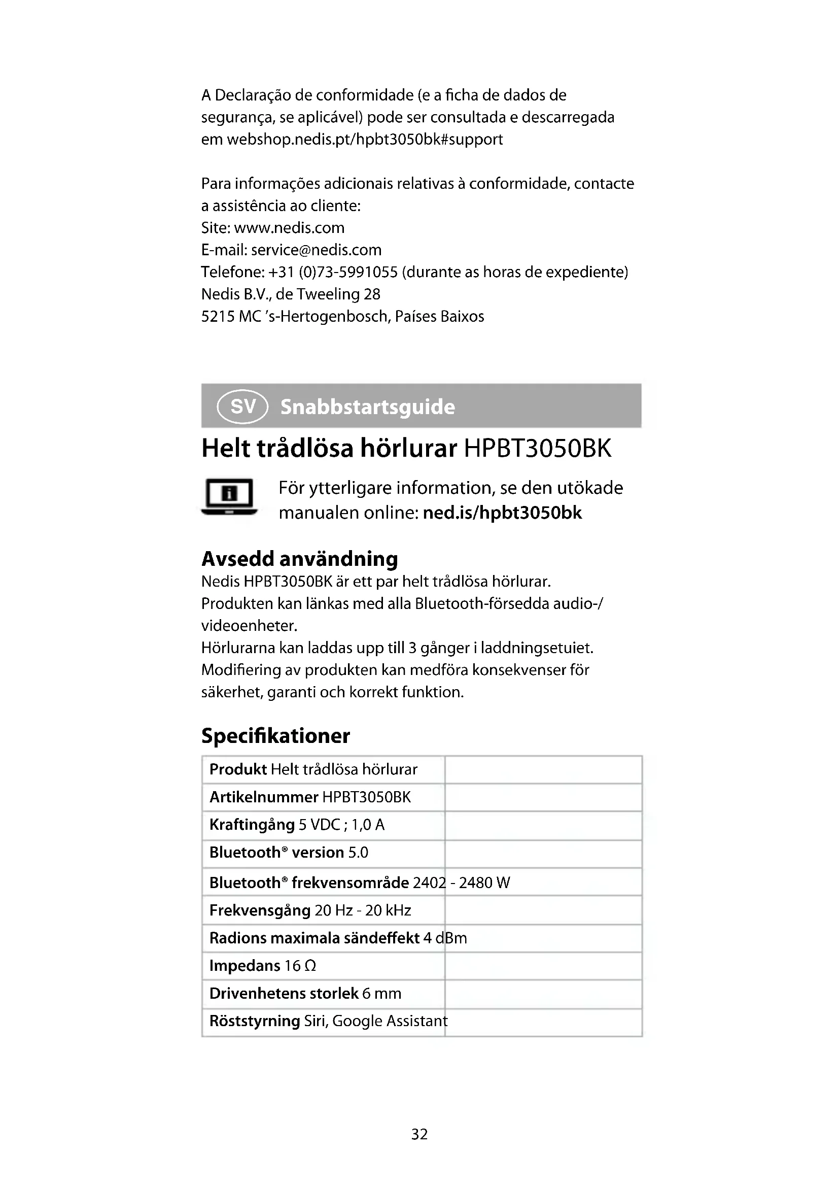 , tillverkad i Kina, har testats i enlighet med alla relevanta CE-standarder och föreskrifter och att alla tester genomförts med godkänt resultat. Detta inkluderar, men är inte begränsat till, radioutrustningsdirektivet 2014/53/EU. Den fullständiga försäkran om överensstämmelse (och säkerhetsdatabladet, om tillämpligt) kan läsas och laddas ned från webshop.nedis.sv/hpbt3050bk#support För ytterligare information om överensstämmelse, var god kontakta vår kundtjänst: Webbplats: www.nedis.com36 E-post: service@nedis.com Telefon: +31 (0)73-5991055 (under kontorstid) Nedis B.V., de Tweeling 28 5215 MC ’s-Hertogenbosch, Nederländerna