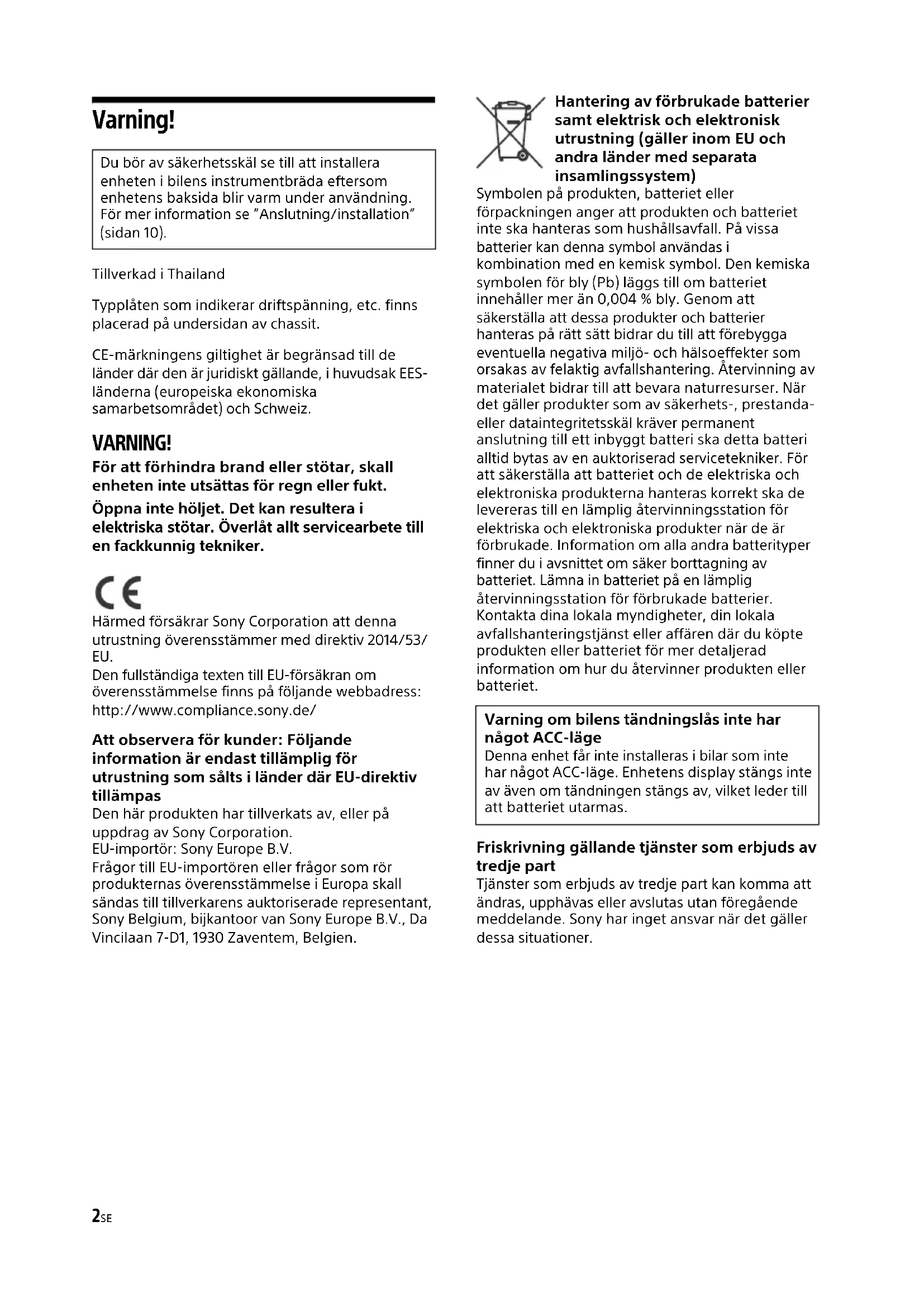 Beugel Beugel Zekering (10 A)2SE Varning! Tillverkad i Thailand Typplåten som indikerar driftspänning, etc. finns placerad på undersidan av chassit. CE-märkningens giltighet är begränsad till de länder där den är juridiskt gällande, i huvudsak EES- länderna (europeiska ekonomiska samarbetsområdet) och Schweiz. VARNING! För att förhindra brand eller stötar, skall enheten inte utsättas för regn eller fukt. Öppna inte höljet. Det kan resultera i elektriska stötar. Överlåt allt servicearbete till en fackkunnig tekniker. Härmed försäkrar Sony Corporation att denna utrustning överensstämmer med direktiv 2014/53/ EU. Den fullständiga texten till EU-försäkran om överensstämmelse finns på följande webbadress: http://www.compliance.sony.de/ Att observera för kunder: Följande information är endast tillämplig för utrustning som sålts i länder där EU-direktiv tillämpas Den här produkten har tillverkats av, eller på uppdrag av Sony Corporation. EU-importör: Sony Europe B.V. Frågor till EU-importören eller frågor som rör produkternas överensstämmelse i Europa skall sändas till tillverkarens auktoriserade representant, Sony Belgium, bijkantoor van Sony Europe B.V., Da Vincilaan 7-D1, 1930 Zaventem, Belgien. Hantering av förbrukade batterier samt elektrisk och elektronisk utrustning (gäller inom EU och andra länder med separata insamlingssystem) Symbolen på produkten, batteriet eller förpackningen anger att produkten och batteriet inte ska hanteras som hushållsavfall. På vissa batterier kan denna symbol användas i kombination med en kemisk symbol. Den kemiska symbolen för bly (Pb) läggs till om batteriet innehåller mer än 0,004 % bly. Genom att säkerställa att dessa produkter och batterier hanteras på rätt sätt bidrar du till att förebygga eventuella negativa miljö- och hälsoeffekter som orsakas av felaktig avfallshantering. Återvinning av materialet bidrar till att bevara naturresurser. När det gäller produkter som av säkerhets-, prestanda- eller dataintegritetsskäl kräver permanent anslutning till ett inbyggt batteri ska detta batteri alltid bytas av en auktoriserad servicetekniker. För att säkerställa att batteriet och de elektriska och elektroniska produkterna hanteras korrekt ska de levereras till en lämplig återvinningsstation för elektriska och elektroniska produkter när de är förbrukade. Information om alla andra batterityper finner du i avsnittet om säker borttagning av batteriet. Lämna in batteriet på en lämplig återvinningsstation för förbrukade batterier. Kontakta dina lokala myndigheter, din lokala avfallshanteringstjänst eller affären där du köpte produkten eller batteriet för mer detaljerad information om hur du återvinner produkten eller batteriet. Friskrivning gällande tjänster som erbjuds av tredje part Tjänster som erbjuds av tredje part kan komma att ändras, upphävas eller avslutas utan föregående meddelande. Sony har inget ansvar när det gäller dessa situationer. Du bör av säkerhetsskäl se till att installera enheten i bilens instrumentbräda eftersom enhetens baksida blir varm under användning. För mer information se ”Anslutning/installation” (sidan 10). Varning om bilens tändningslås inte har något ACC-läge Denna enhet får inte installeras i bilar som inte har något ACC-läge. Enhetens display stängs inte av även om tändningen stängs av, vilket leder till att batteriet utarmas.3SE Försiktighet