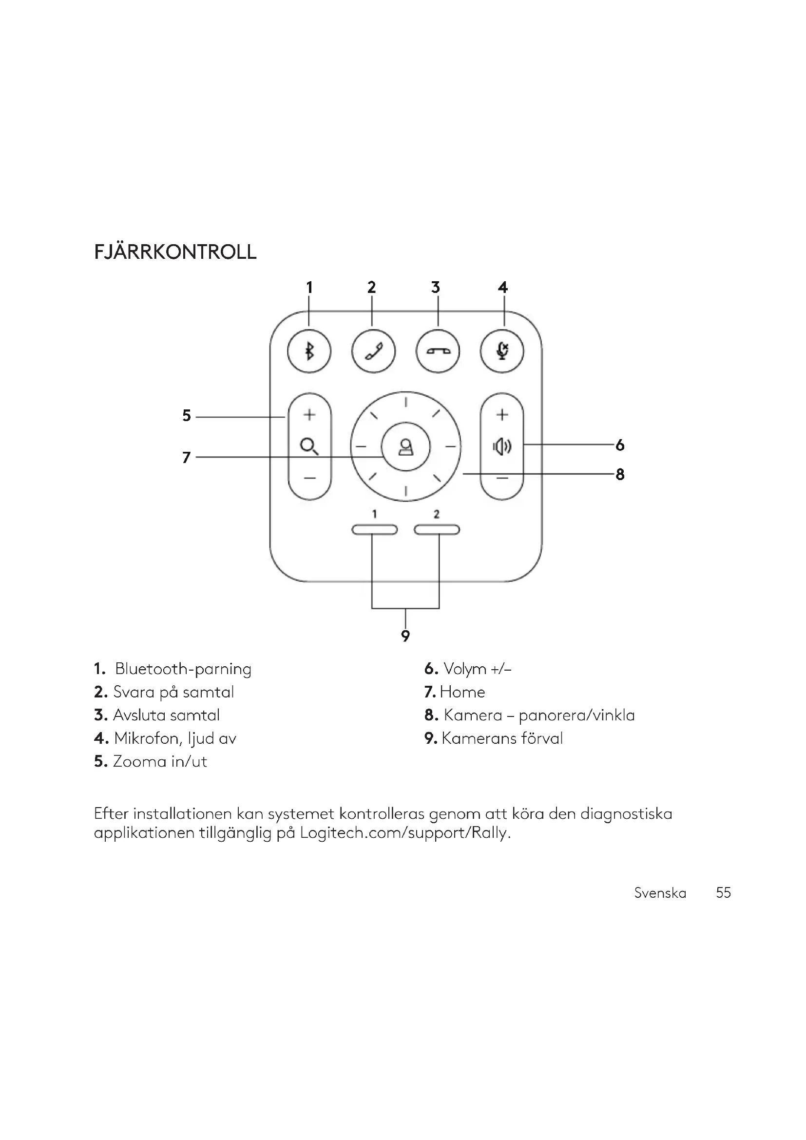 Efter installationen kan systemet kontrolleras genom att köra den diagnostiska applikationen tillgänglig på Logitech.com/support/Rally. FJÄRRKONTROLL