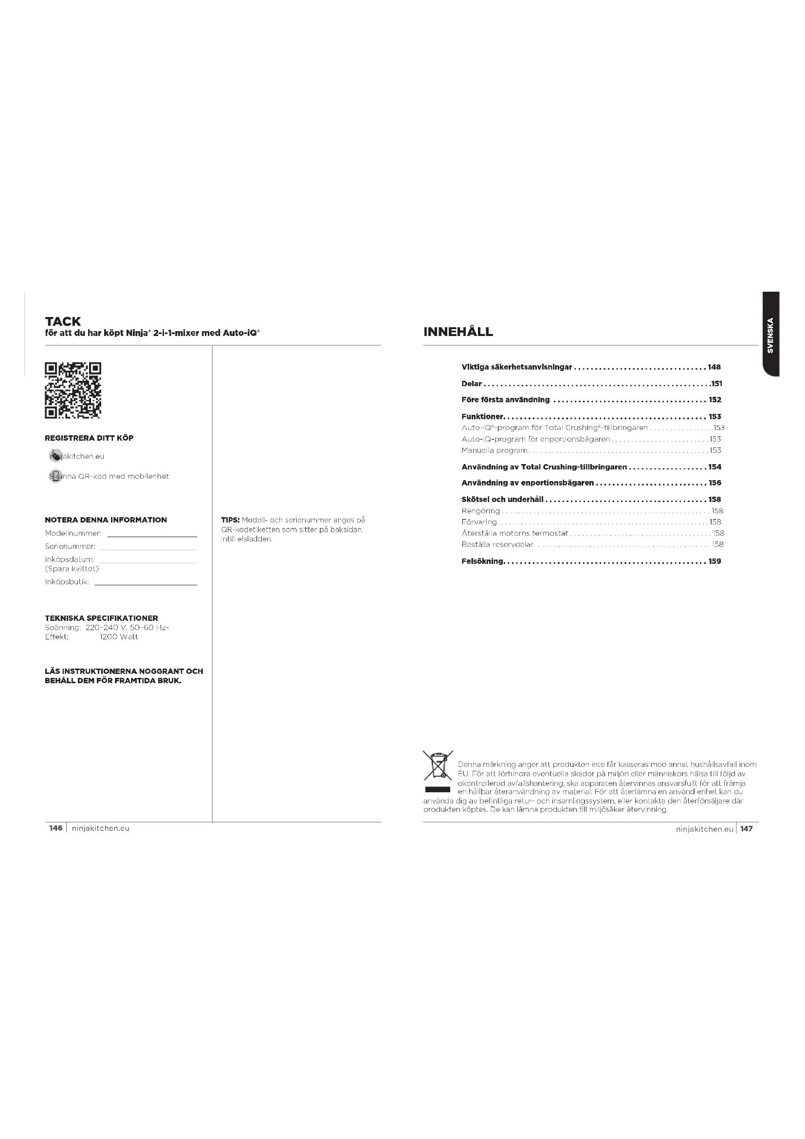 ninjakitchen.eu Skanna QR-kod med mobilenhet Denna märkning anger att produkten inte får kasseras med annat hushållsavfall inom EU. För att förhindra eventuella skador på miljön eller människors hälsa till följd av okontrollerad avfallshantering, ska apparaten återvinnas ansvarsfullt för att främja en hållbar återanvändning av material. För att återlämna en använd enhet kan du använda dig av befintliga retur- och insamlingssystem, eller kontakta den återförsäljare där produkten köptes. De kan lämna produkten till miljösäker återvinning. SVENSKA