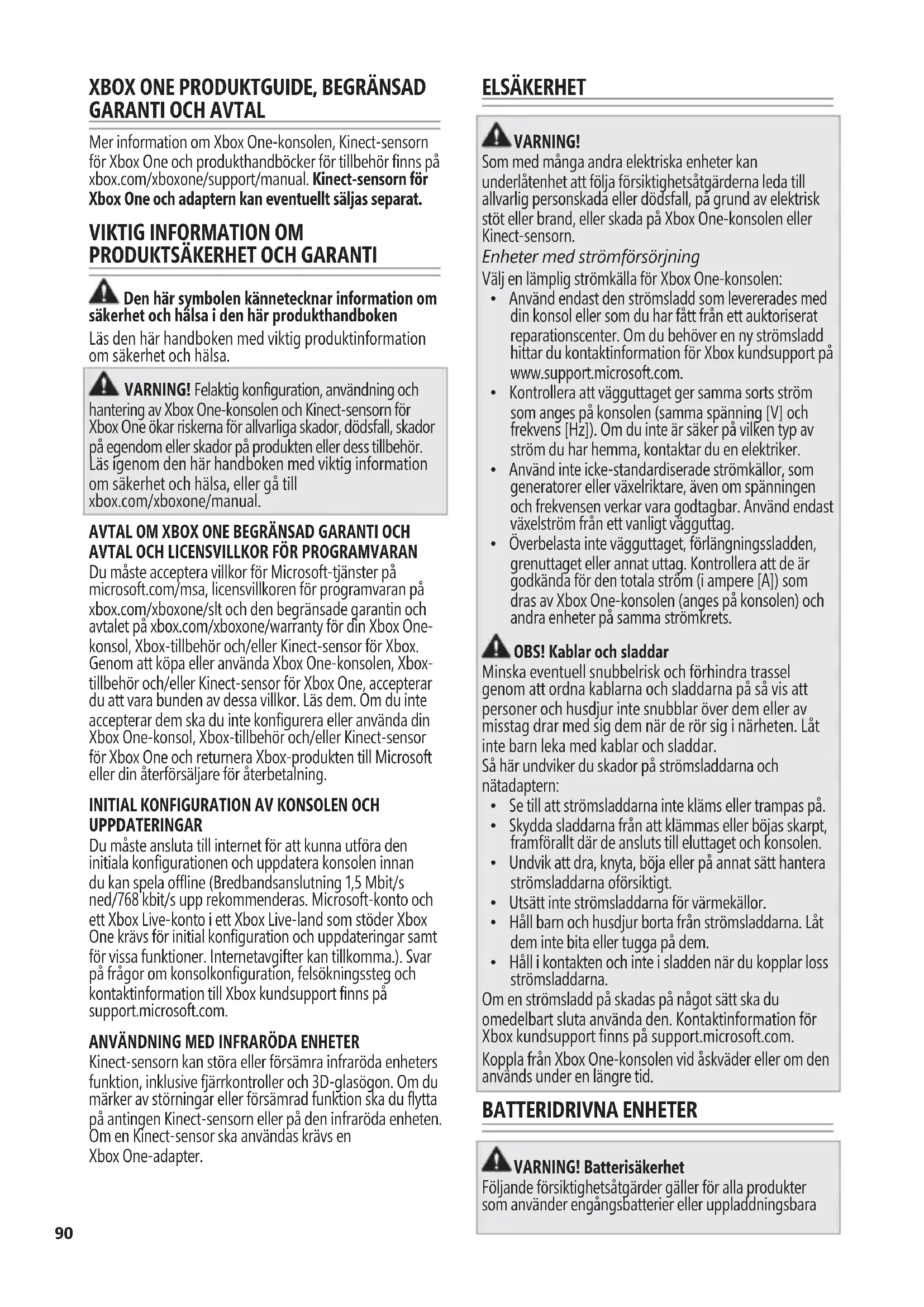Den här symbolen kännetecknar information om säkerhet och hälsa i den här produkthandboken Läs den här handboken med viktig produktinformation om säkerhet och hälsa. VARNING! Felaktig konfiguration, användning och hantering av Xbox One-konsolen och Kinect-sensorn för Xbox One ökar riskerna för allvarliga skador, dödsfall, skador på egendom eller skador på produkten eller dess tillbehör. Läs igenom den här handboken med viktig information om säkerhet och hälsa, eller gå till xbox.com/xboxone/manual. AVTAL OM XBOX ONE BEGRÄNSAD GARANTI OCH