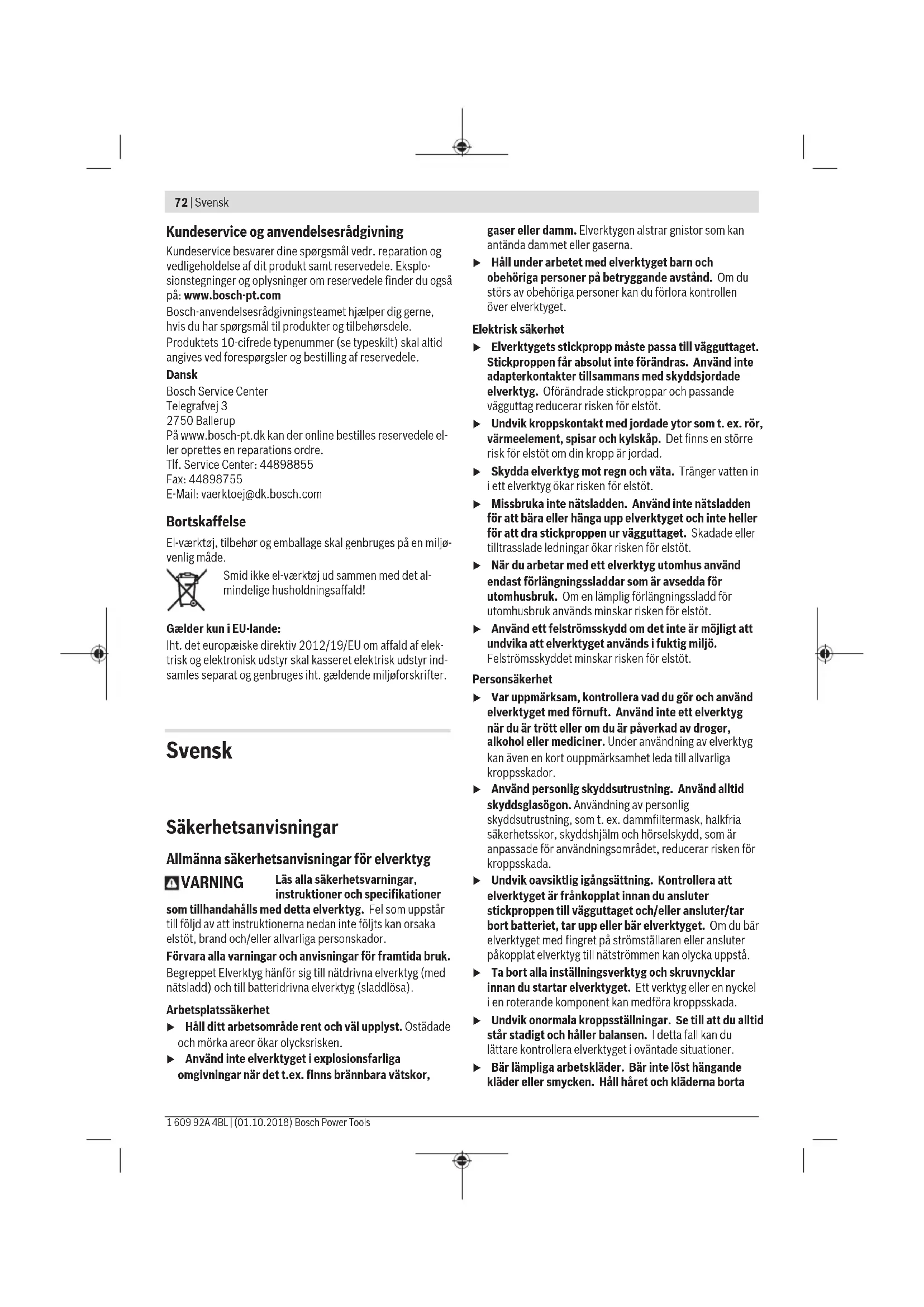 Sätta på/byta ut slipbladet på slipplattan Slipplattan (11) är utrustad med ett kardborrefäste så att slipblad kan fästas snabbt och enkelt. Knacka ut kardborrefästet på slipplattan (11) innan du sätter på slipbladet (12) för att få optimalt fäste. Sätt slipbladet (12) längs ena sidan av slipplattan (11), lägg hela slipbladet på slipplattan och tryck fast det ordentligt. För att säkerställa en optimal stoftbortsugning kontrollerar du att utstansningarna i slipbladet stämmer överens med borrhålen på slipplattan. För att ta av slipbladet (12), ta tag i ena sidan och dra av det från slipplattan (11). Du kan använda alla slipblad, polerings- och rengöringsfibrer i serien 93 mm i tillbehörsprogrammet från Bosch. Sliptillbehör som filt/poleringsfilt sätts på slipplattan på samma sätt. Damm-/spånutsugning Dammet från material som t.ex. blyhaltig målning, vissa träslag, mineraler och metall kan vara hälsovådligt. Beröring eller inandning av dammet kan orsaka allergiska reaktioner och/eller andningsbesvär hos användaren eller personer som uppehåller sig i närheten. Vissa damm från ek eller bok anses vara cancerogena, speciellt då i förbindelse med tillsatsämnen för Svensk | 77 Bosch Power Tools 1 609 92A 4BL | (01.10.2018)78 | Svensk 1 609 92A 4BL | (01.10.2018) Bosch Power Tools träbehandling (kromat, träkonserveringsmedel). Endast yrkesmän får bearbeta asbesthaltigt material. – Använd om möjligt en för materialet lämplig dammutsugning. – Se till att arbetsplatsen är väl ventilerad. – Vi rekommenderar ett andningsskydd i filterklass P2. Beakta de föreskrifter som i aktuellt land gäller för bearbetat material. u Undvik dammanhopning på arbetsplatsen. Damm kan lätt självantändas. Ansluta dammutsug (se bild C) Dammutsug (17) är endast avsett för arbeten med slipplattan (11) i kombination med andra insatsverktyg kan det inte användas. Anslut alltid ett dammutsug vid slipning. Vid montering av dammutsug (17) (tillbehör), ta av insatsverktyget och djupanslaget (13). Skjut dammutsuget (17) till anslag över verktygsfästet (6) på elverktygets spännhals. Vrid dammbortsugningen till den önskade positionen (ej direkt under elverktyget). Tryck på spännspaken (15) för att fixera dammutsuget. Sätt utsugsslangens (18) verktygsmuff på utsugsstutsen (16). Anslut utsugsslangen (18) till en dammsugare (tillbehör). En översikt över anslutning till olika sugare finns i slutet av denna bruksanvisning. Sugen måste vara lämplig för det material som ska bearbetas. Använd en specialsug för att suga hälsovådligt och cancerframkallande eller torrt damm. Drift Driftstart u Kontrollera nätspänningen! Kontrollera att strömkällans spänning överensstämmer med uppgifterna på elverktygets typskylt. In- och urkoppling u Se till att du kan manövrera på-/av-strömbrytaren utan att släppa handtaget. För att starta elverktyget, skjut på-/avknappen (1) framåt så att ”I” visas på brytaren. Den elektroniska mjukstarten begränsar vridmomentet vid påslagning och ökar motorns livslängd. Konstantelektroniken håller svängningstalet på tomgång och belastningen nästan konstant och säkerställer jämna arbetsprestanda. För att stänga av elverktyget, skjut på-/avknappen (1) bakåt så att ”0” visas. Förval av svängningstal Med reglaget svängningsförval (2) kan du förvälja svängningstalet och ändra det under drift. Lämpligt svängningstal beror på material och arbetsförhållande. Prova fram den bästa inställningen genom praktiska försök. Vid sågning, kapning och slipning av hårda material som trä eller metall rekommenderas svängningsnivån ”6”, vid mjukare material som t.ex. plast svängningstal ”4”. Arbetsanvisningar u Dra stickproppen ur nätuttaget innan arbeten utförs på elverktyget. u Vänta tills elverktyget stannat helt innan du lägger bort det. Observera: håll inte för ventilationsöppningen (3) på elverktyget under arbetet, då det kan reducera elverktygets livslängd. Arbetsprincip Genom den oscillerande driften oscillerar insatsverktyget upp till 20000 ggr per minut och med 2,8° fram och tillbaka. Det gör det möjligt att arbeta med precision även där det är trångt. Arbeta med lågt och jämnt tryck på verktyget, annars försämras prestandan och insatsverktyget kan fastna. Flytta elverktyget fram och tillbaka under arbetet så att insatsverktyget inte hettas upp eller fastnar. Sågning u Använd endast oskadade, felfria sågblad. Deformerade eller oskarpa sågblad kan brytas, negativt påverka snittet eller orsaka bakslag. u Beakta lagstadgade bestämmelser och rekommendationer från materialtillverkaren vid sågning av lättviktsmaterial. u Inga mjuka material såsom trä, gipskartong eller liknande får bearbetas med doppsågning! Innan sågning med HCS-sågblad i trä, spånplattor, byggmaterial osv., kontrollera att alla främmande föremål som spikar, skruvar o.l. har avlägsnats. Ta eventuellt bort de främmande föremålen eller använd bimetall-sågblad. Kapa Observera: vid kapning av kakel, observera att insatsverktyget utsätts för hög förslitning under längre användning. Slipa Avverkningseffekten och slipbilden är i hög grad beroende av valt slipblad, förvalt svängningstalsteg och anliggningstrycket. Endast felfria slipblad ger en god slipeffekt och skonar samtidigt elverktyget. Ett jämnt anliggningstryck förlänger slipbladens livslängd.Ett kraftigt ökat anliggningstryck ger inte en högre slipeffekt utan ett ökat slitage på elverktyget och slipbladet. För precis slipning av kanter, hörn och svåråtkomliga ställen kan du också arbeta med endast spetsen eller en kant av slipplattan. Vid punktslipning kan slipbladet värmas upp kraftigt. Reducera svängningstalet och presstrycket och låt slipbladet svalna regelbundet. Ett slipblad, som använts för slipning av metall får inte längre användas för andra material. Använd endast o