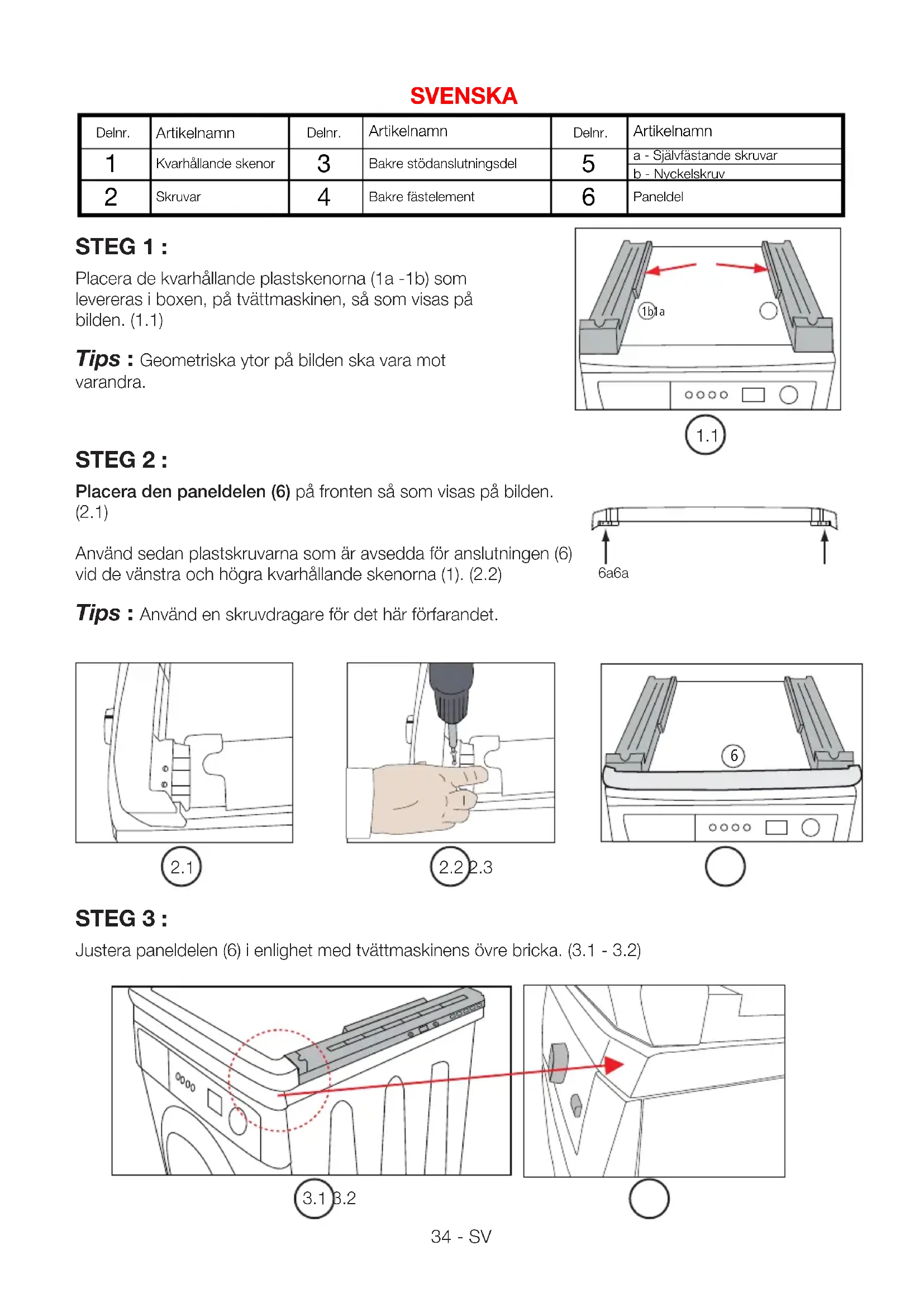 Brug strømforsynet skruetrækker til denne handling. 4a34 - SV STEG 1 : Placera de kvarhållande plastskenorna (1a -1b) som levereras i boxen, på tvättmaskinen, så som visas på bilden. (1.1) Tips : Geometriska ytor på bilden ska vara mot varandra. STEG 2 : Placera den paneldelen (6) på fronten så som visas på bilden. (2.1) Använd sedan plastskruvarna som är avsedda för anslutningen (6) vid de vänstra och högra kvarhållande skenorna (1). (2.2) Tips : Använd en skruvdragare för det här förfarandet. STEG 3 : Justera paneldelen (6) i enlighet med tvättmaskinens övre bricka. (3.1 - 3.2) Delnr.Artikelnamn Kvarhållande skenor SkruvarDelnr.Artikelnamn Bakre stödanslutningsdel Bakre fästelementDelnr.Artikelnamn a - Självfästande skruvarb - Nyckelskruv Paneldel1b 1a 6a 6a