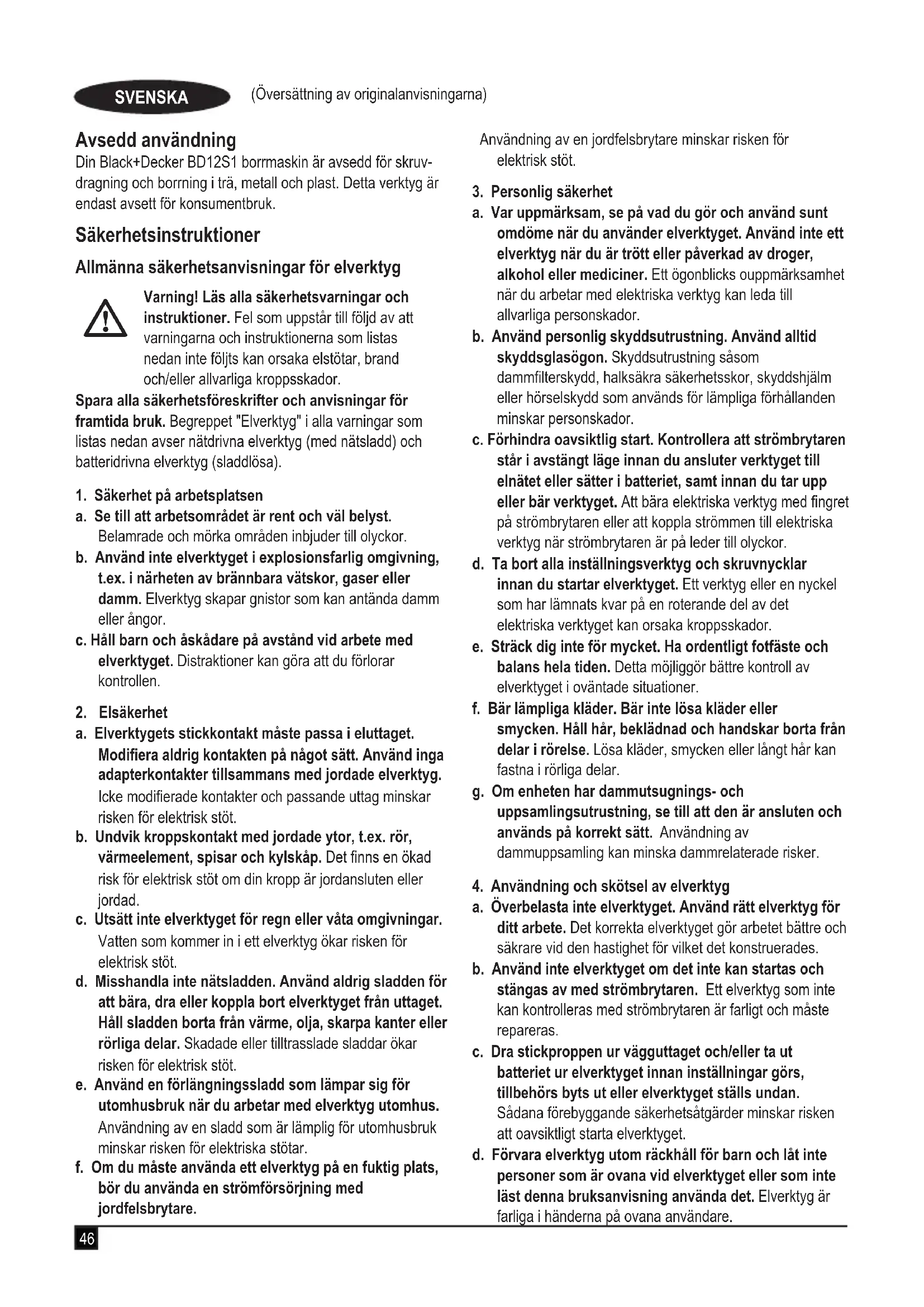EG-försäkran om överensstämmelse MASKINDIREKTIVET %51 (Översättning av originalanvis- ningarna) SVENSKA (Oversettelse av de opprinnelige instruksjonene) NORSK BD12S1 - borr Black & Decker försäkrar att dessa produkter, beskrivna under "tekniska data" uppfyller: 2006/42/EC, EN60745-1:2009+A11:2010, EN60745-2-1:2010 och EN60745-2-2:2010. Dessa produkter överensstämmer även med direktiven 2014/30/EU och 2011/65/EU. Kontakta Black & Decker för ytterligare information på följande adress, eller se handbokens baksida. Undertecknad är ansvarig för sammanställningen av den tekniska len och lämnar denna deklaration på uppdrag av Black & Deckers. A. P. Smith Technical Director Black & Decker Europe, 270 Bath Road, Slough, Berkshire, SL1 4DX Storbritannien 2019-04-30 Garanti Black & Decker är säker på kvaliteten hos denna produkt och erbjuder kunder 24 månaders garanti från inköpsdatumet. Garantin gäller utöver konsumentens rättigheter enligt lag och påverkar inte dessa. Garantin är giltig i de områden som tillhör medlemsstaterna i Europeiska unionen och det europeiska frihandelsområdet. För yrkande under garantin måste yrkandet vara in enlighet med Black & Deckers villkor och du kommer att behöva skicka in bevis på köpet till försäljaren eller en auktoriserad reparatör. Villkoren för Black & Deckers tvååriga garanti och var du hittar din närmaste auktoriserade reparatör kan erhållas på internet på www.2helpU.com, eller genom att kontakta ditt lokala Black & Deckers kontor på adressen som anges i denna manual. Besök vår webbplats www.blackanddecker.se för att registrera din nya Black & Decker-produkt samt för att få information om nya produkter och specialerbjudanden. (Oversettelse av de opprinnelige instruksjonene) NORSK Tiltenkt bruk Drillen BD12S1 fra BLACK+DECKER er designet for skrutrek- kerbruk og for boring i tre, metall og plast. Dette verktøyet er bare ment som et forbrukerverktøy. Sikkerhetsinstruksjoner Generelle sikkerhetsadvarsler for elektroverktøy