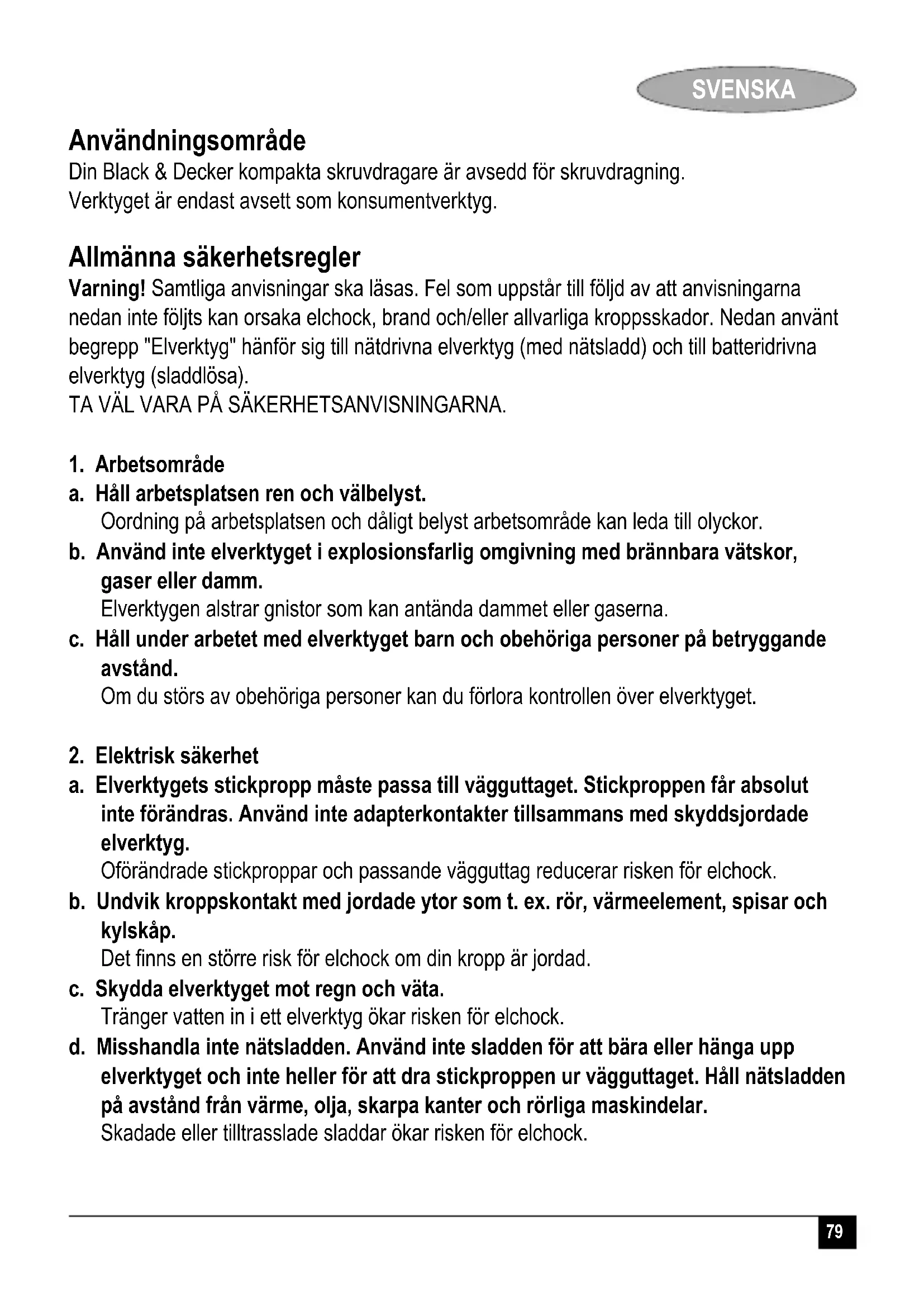 (osäkerhet akustisk effekt) 3 dB(A) Kevin Hewitt Director of Consumer Engineering Spennymoor, County Durham DL16 6JG, Storbrittannien 1-12-2006 Reservdelar / reparationer Reservdelar finns att köpa hos auktoriserade Black & Decker verkstäder, som även ger kostnadsförslag och reparerar våra produkter. Förteckning över våra auktoriserade verkstäder finns på Internet, vår hemsida www.blackanddecker.se samt www.2helpU.com Garanti Black & Decker garanterar att produkten är fri från material- och/eller fabrikationsfel vid leverans till kund. Garantin är i tillägg till konsumentens lagliga rättigheter och påverkar inte dessa. Garantin gäller inom medlemsstaterna i Europeiska Unionen och i det Europeiska Frihandelsområdet. Om en Black & Decker produkt går sönder på grund av material- och/eller fabrikationsfel eller brister i överensstämmelse med specifikationen, inom 24 månader från köpet, åtar sig Black & Decker att reparera eller byta ut produkten med minsta besvär för kunden.88 SVENSKA Garantin gäller inte för fel som beror på: normalt slitage felaktig användning eller skötsel att produkten skadats av främmande föremål, ämnen eller genom olyckshändelse Garantin gäller inte om reparation har utförts av någon annan än en auktoriserad Black & Decker verkstad. För att utnyttja garantin skall produkten och inköpskvittot lämnas till återförsäljaren eller till en auktoriserad verkstad senast 2 månader efter det att felet har upptäckts. För information om närmaste auktoriserad verkstad; kontakta det lokala Black & Decker kontoret på den adress som är angiven i bruksanvisningen. En lista på alla auktoriserade verkstäder samt servicevillkor finns även tillgängligt på Internet, adress: www.2helpU.com Besök vår webbplats www.blackanddecker.se för att registrera din nya Black & Decker- produkt samt för att erhålla information om nya produkter och specialerbjudanden. Vidare information om märket Black & Decker och vårt produktsortiment kan återfinnas på www.blackanddecker.se89 NORSK Bruksområder Denne kompaktskrutrekkeren fra Black & Decker er konstruert for skrutrekkeranvendelser. Verktøyet er tiltenkt kun som konsumentverktøy. Generelle sikkerhetsforskrifter Advarsel! Les gjennom alle anvisningene. Hvis anvisningene nedenfor ikke overholdes, kan det medføre elektrisk støt, brann og/eller alvorlige skader. Uttrykket «elektroverktøy» i alle advarslene nedenfor gjelder for strømdrevne elektroverktøy (med ledning) og batteridrevne elektroverktøy (uten ledning). TA GODT VARE PÅ DISSE ANVISNINGENE.
