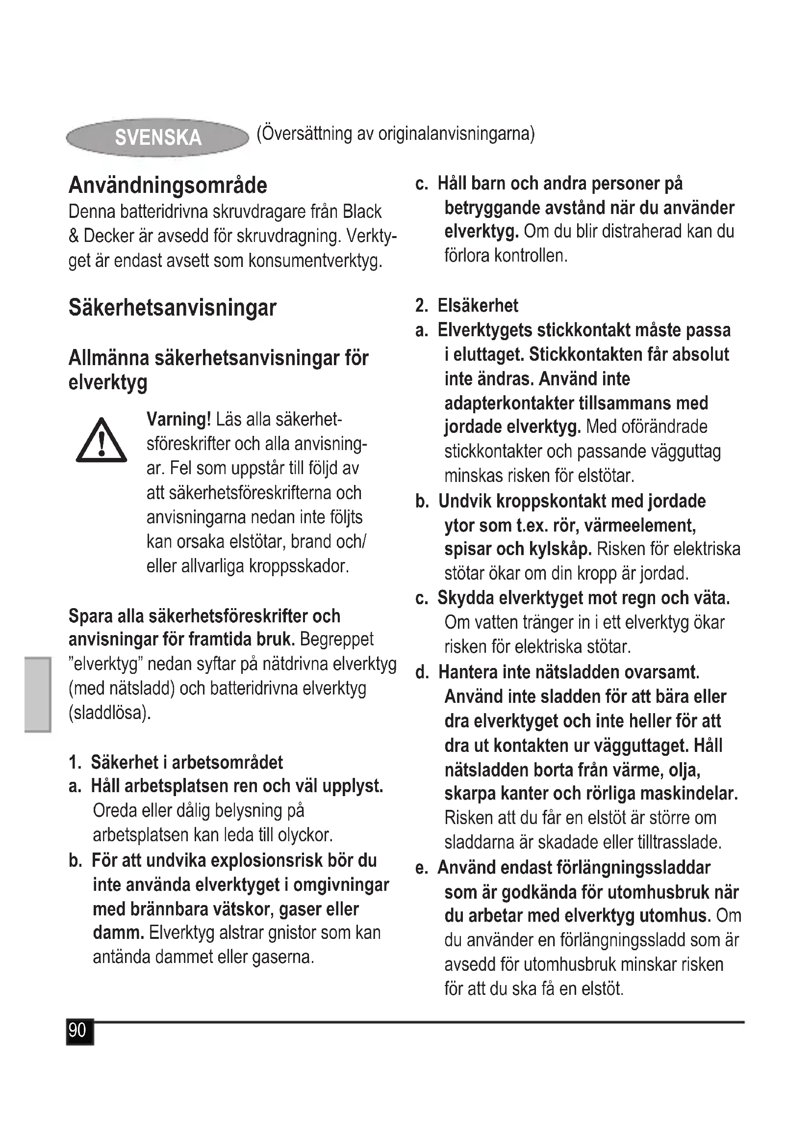 Kevin Hewitt Vice-President Global Engineering Black & Decker Europe, 210 Bath Road, Slough, Berkshire, SL1 3YD Storbritannien 28/05/2013 Garanti Black & Decker garanterar att produkten är fri från material- och/eller fabrikationsfel vid leverans till kund. Garantin gäller utöver konsumentens rättigheter enligt lag och påverkar inte dessa. Garantin gäller inom medlemsstaterna i Europeiska Unionen och i det Europeiska Frihandelsområdet. Om en Black & Decker-produkt går sönder på grund av material- och/eller fabrikations- fel eller brister i överensstämmelse med specikationen, inom 24 månader från köpet, åtar sig Black & Decker att reparera eller byta ut produkten med minsta besvär för kunden, förutom om: u Produkten har använts i kommersiellt eller yrkesmässigt syfte eller i uthyrningssyfte. u Produkten har utsatts för felaktig an- vändning eller skötsel. u Produkten har skadats av främmande föremål, ämnen eller genom olyckshän- delse. u Reparation har utförts av någon annan än en auktoriserad Black & Decker-verkstad.100 (Översättning av originalanvisningarna) SVENSKA Vid garantianspråk ska produkten och inköpskvittot lämnas till återförsäljaren eller till en auktoriserad verkstad. För information om närmaste auktoriserade verkstad, kontakta det lokala Black & Decker-kontoret på den adress som är angiven i bruksanvisningen. En lista över alla auktoriserade Black & Decker-verkstäder samt servicevillkor nns på Internet: www.2helpU.com Besök vår webbplats www.blackanddecker. se för att registrera din nya Black & Decker- produkt samt för att erhålla information om nya produkter och specialerbjudanden. Vidare information om märket Black & Decker och vårt produktsortiment åternns på www. blackanddecker.se101 (Oversettelse av de opprinnelige instruksjonene) NORSK Bruksområde Dette verktøyet fra Black & Decker er bereg- net for bruk som skrutrekker. Verktøyet er beregnet bare som konsumentverktøy. Sikkerhetsinstruksjoner Generelle sikkerhetsadvarsler for elektroverktøy