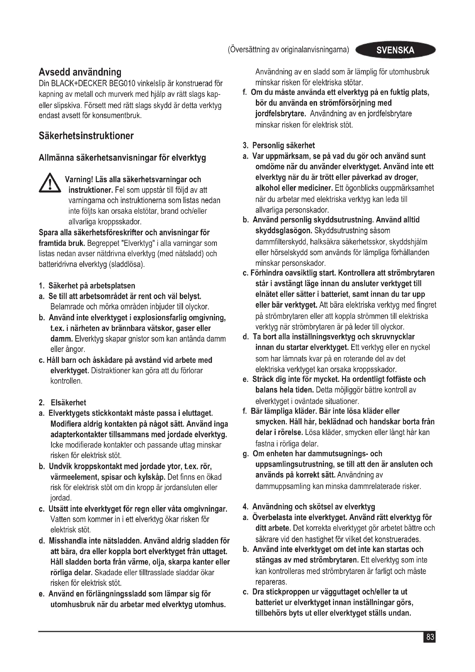 BEG010 vinkelslip Black & Decker försäkrar att dessa produkter, beskrivna under "tekniska data" uppfyller: 2006/42/EG, EN 60745-1:2009 + A11:2010; EN 60745-2-3:2011 + A2:2013 + A11:2014 + A12:2014 + A13:2015 Dessa produkter överensstämmer även med direktiven 2014/30/EU och 2011/65/EU. Kontakta Black & Decker för ytterligare information på följande adress, eller se handbokens baksida. Undertecknad är ansvarig för sammanställningen av tekniska data och gör denna försäkran för Black & Decker. Patrick Diepenbach General Manager, Benelux Black and Decker, Egide Walschaertsstraat 14-18 2800 Mechelen, Belgium 23/04/2021 Garanti Black & Decker är säker på kvaliteten hos denna produkt och erbjuder kunder 24 månaders garanti från datumet inköpsdatumet. Garantin gäller utöver konsumentens rättigheter enligt lag och påverkar inte dessa. Garantin är giltig i de territorier som tillhör medlemsstaterna i Europeiska unionen och det europeiska frihandelsområdet. För yrkande under garantin måste yrkandet vara in enlighet med Black & Deckers villkor och du kommer att behöva skicka in bevis på köpet till försäljaren eller en auktoriserad reparatör. Villkoren för Black & Deckers tvååriga garanti och var du hittar din närmaste auktoriserade reparatör kan erhållas på Internet på www.2helpU.com, eller genom att kontakta ditt lokal Black & Decker kontor på adressen som angetts i denna bruksanvisning. Besök vår webbsida www.blackanddecker.co.uk för att registrera din nya Black & Decker-produkt samt för att få information om nya produkter och specialerbjudanden.93 (Oversettelse av de opprinnelige instruksjonene) NORSK Tiltenkt bruk BLACK+DECKER BEG010 vinkelsliper er designet for sliping og kapping av metall og murverk ved hjelp av passende slipe- eller kappeskiver. Ved påmontert passende beskyttelse er dette apparatet kun ment for privat bruk. Sikkerhetsinstruksjoner Generelle sikkerhetsadvarsler for elektroverktøy
