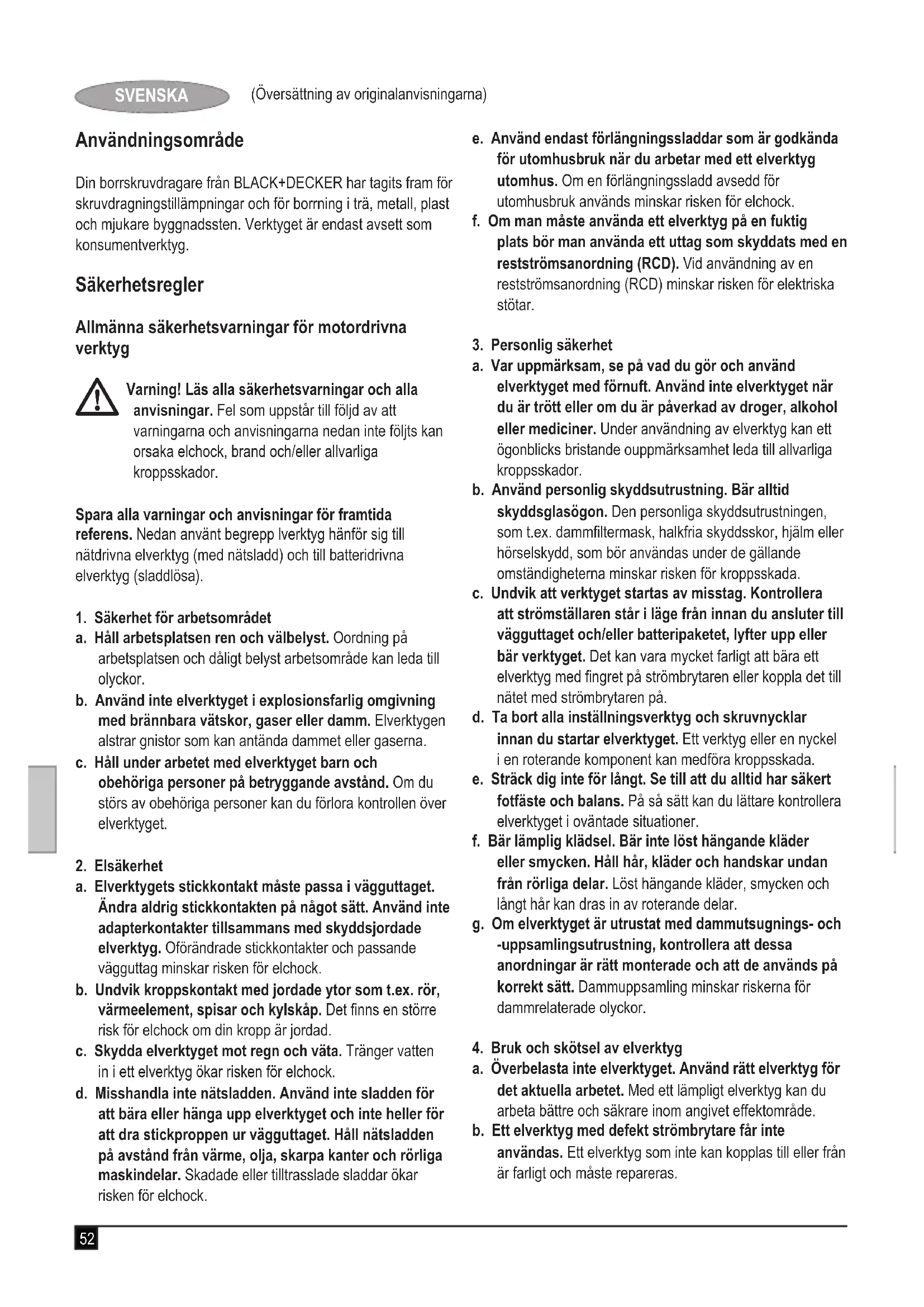 BDK48/BDK188 Black & Decker garanterar att produkterna som beskrivs under "Tekniska data" uppfyller: 2006/42/EG, EN 60745-1, EN 60745-2-1 De här produkterna överensstämmer även med direktiven 2014/30/EU och 2011/65/EU. Mer information får du genom att kontakta Black & Decker på följande adress eller titta i slutet av bruksanvisningen. Undertecknad är ansvarig för sammanställningen av tekniska data och gör denna försäkran för Black & Decker. R. Laverick Engineering Manager Black & Decker Europe, 210 Bath Road, Slough, Berkshire, SL1 3YD Storbritannien 05/09/201458 (Översättning av originalanvisningarna) SVENSKA Reservdelar / reparationer Reservdelar nns att köpa hos auktoriserade Black & Decker verkstäder, som även ger kostnadsförslag och reparerar våra produkter. Förteckning över våra auktoriserade verkstäder nns på Internet, vår hemsida www.blackanddecker.se samt www.2helpU.com Garanti Black & Decker garanterar att produkten är fri från material- och/eller fabrikationsfel vid leverans till kund. Garantin är i tillägg till konsumentens lagliga rättigheter och påverkar inte dessa. Garantin gäller inom medlemsstaterna i Europeiska Unionen och i det Europeiska Frihandelsområdet. Om en Black & Decker produkt går sönder på grund av material- och/eller fabrikationsfel eller brister i överensstämmelse med specikationen, inom 24 månader från köpet, åtar sig Black & Decker att reparera eller byta ut produkten med minsta besvär för kunden. Garantin gäller inte för fel som beror på: u normalt slitage u felaktig användning eller skötsel u att produkten skadats av främmande föremål, ämnen eller genom olyckshändelse Garantin gäller inte om reparation har utförts av någon annan än en auktoriserad Black & Decker verkstad. För att utnyttja garantin skall produkten och inköpskvittot lämnas till återförsäljaren eller till en auktoriserad verkstad senast 2 månader efter det att felet har upptäckts. För information om närmaste auktoriserad verkstad; kontakta det lokala Black & Decker kontoret på den adress som är angiven i bruksanvisningen. En lista på alla auktoriserade verkstäder samt servicevillkor nns även tillgängligt på Internet, adress: www.2helpU.com Besök vår webbplats www.blackanddecker.se för att registrera din nya BLACK+DECKER-produkt samt för att erhålla information om nya produkter och specialerbjudanden. Vidare information om märket BLACK+DECKER och vårt produktsortiment kan åternnas på www.blackanddecker.se59 (Oversettelse av de opprinnelige instruksjonene) NORSK Bruksområder BLACK+DECKER drill/skrutrekker er konstruert for skruing og boring i tre, metall, plast og mur. Verktøyet er tiltenkt kun som konsumentverktøy. Sikkerhetsinstruksjoner Generelle sikkerhetsadvarsler for elektroverktøy