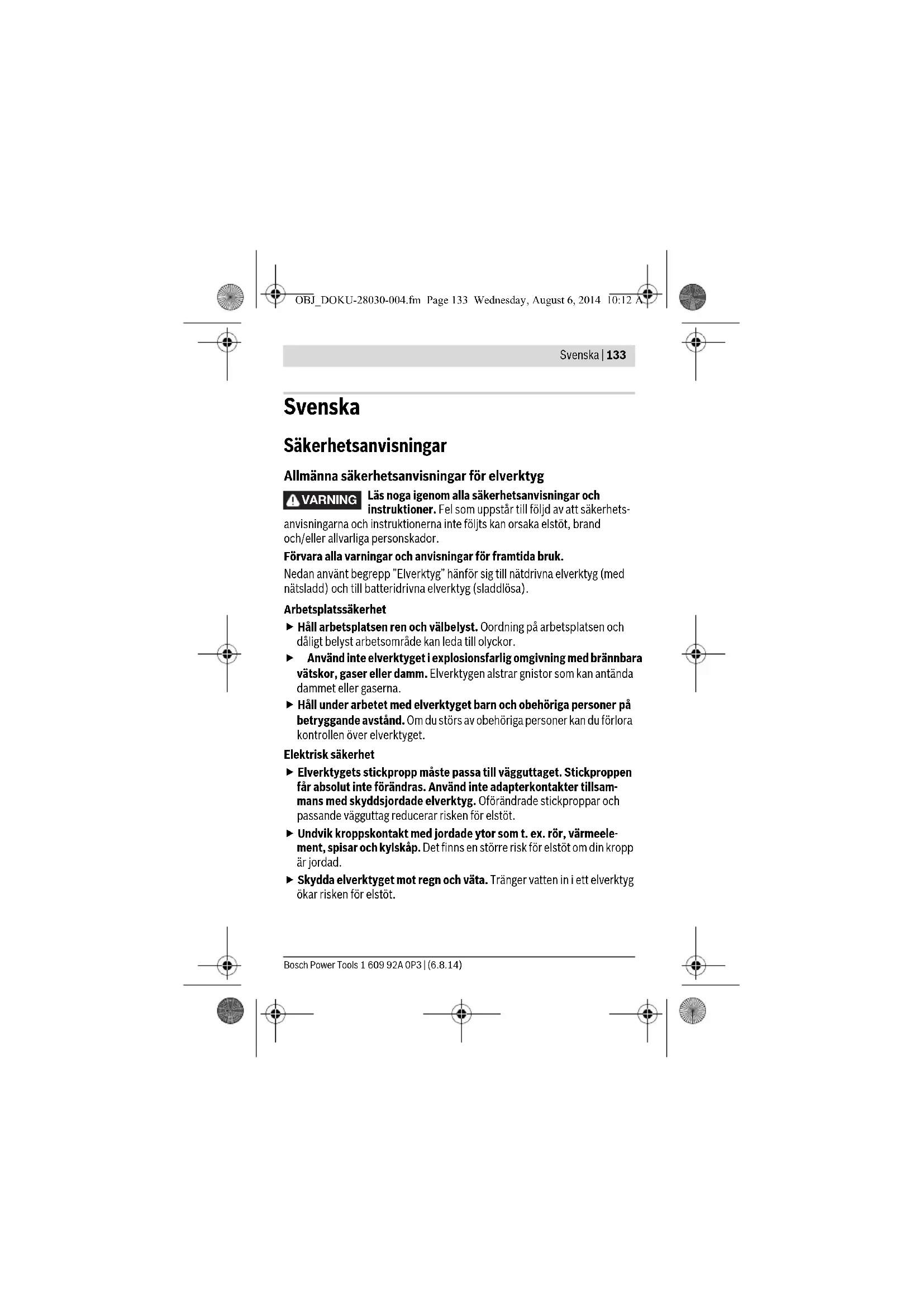 helt til venstre. Drejeretningsindikatoren højreløb 4 lyser, når der trykkes på start- stop-kontakten 8 og motoren går. Venstreløb: Skruer løsnes og drejes ud ved at trykke drejeretningsomskifte- ren 9 helt mod højre. Drejeretningsindikatoren venstreløb 6 lyser, når der trykkes på start-stop-kontakten 8 og motoren går. Tænd/sluk Til ibrugtagning af el-værktøjet tryk på start-stop-kontakten 8 og hold den nede. OBJ_DOKU-28030-004.fm Page 129 Wednesday, August 6, 2014 10:12 AM1 609 92A 0P3 | (6.8.14) Bosch Power Tools 130 | Dansk Lampen 10 lyser, når start-stop-kontakten 8 trykkes halvt eller helt ned, hvil- ket gør det muligt at oplyse arbejdsområdet ved dårlige lysforhold. El-værktøjet slukkes ved at slippe start-stop-kontakten 8. Automatisk spindellås (Auto-Lock) Borespindlen er fastlåst, hvis start-stop-kontakten 8 ikke er trykket ned. Dette gør det muligt at idreje skruer, selv om akkuen er afladet, og at bruge el-værktøjet som skruetrækker. Tryk ikke på start-stop-kontakten 8 i mere end 15 sekunder, mens borespindlen er blokeret. Ellers kan el-værktøjet blive beskadiget. Arbejdsvejledning El-værktøjet skal altid være slukket, når det anbringes på skruen. Roterende indsatsværktøj kan glide af. På siden af ladeaggregatet 12 kan der opbevares op til 13 skruebits. Holde- ren til skruebitten kan tages ud. Vedligeholdelse og service Vedligeholdelse og rengøring Retningsomskifteren skal altid stå i midten, før der indstilles på maskinen (f.eks. vedligeholdelse, værktøjsskift osv.) samt før ma- skinen transporteres og stilles til opbevaring. Utilsigtet start ved aktivering af start-stop-kontakten kan føre til kvæstelser. El-værktøj og el-værktøjets ventilationsåbninger skal altid holdes rene for at sikre et godt og sikkert arbejde. Når akkuen ikke fungerer mere, bedes du kontakte et autoriseret service- værksted for Bosch el-værktøj. Hvis det er nødvendigt at erstatte tilslutningsledningen, skal dette arbejde udføres af Bosch eller på et autoriseret serviceværksted for Bosch el-værktøj for at undgå farer. Skulle el-værktøjet trods omhyggelig fabrikation og kontrol holde op med at fungere, skal reparationen udføres af et autoriseret serviceværksted for Bosch-elektroværktøj. OBJ_DOKU-28030-004.fm Page 130 Wednesday, August 6, 2014 10:12 AMBosch Power Tools 1 609 92A 0P3 | (6.8.14) Dansk | 131 El-værktøjets 10-cifrede typenummer (se typeskilt) skal altid angives ved forespørgsler og bestilling af reservedele. Kundeservice og brugerrådgivning Kundeservice besvarer dine spørgsmål vedr. reparation og vedligeholdelse af dit produkt samt reservedele. Eksplosionstegninger og informationer om reservedele findes også under: www.bosch-pt.com Bosch brugerrådgivningsteamet vil gerne hjælpe dig med at besvare spørgs- mål vedr. vores produkter og deres tilbehør. Dansk Bosch Service Center Telegrafvej 3 2750 Ballerup På www.bosch-pt.dk kan der online bestilles reservedele eller oprettes en reparations ordre. Tlf. Service Center: 44898855 Fax: 44898755 E-Mail: vaerktoej@dk.bosch.com Transport De indeholdte Li-Ion-akkuer overholder bestemmelserne om farligt gods. Ak- kuerne kan transporteres af brugeren på offentlig vej uden yderligere pålæg. Ved forsendelse gennem tredjemand (f.eks.: lufttransport eller spedition) skal særlige krav vedr. emballage og mærkning overholdes. Her skal man kontakte en faregodsekspert, før forsendelsesstykket forberedes. Bortskaffelse El-værktøj, akku, tilbehør og emballage skal genbruges på en miljø- venlig måde. Smid ikke el-værktøj og akkuer/batterier ud sammen med det almindelige husholdningsaffald! OBJ_DOKU-28030-004.fm Page 131 Wednesday, August 6, 2014 10:12 AM1 609 92A 0P3 | (6.8.14) Bosch Power Tools 132 | Dansk Gælder kun i EU-lande: Iht. det europæiske direktiv 2012/19/EU skal kasseret elektroværktøj og iht. det europæiske direktiv 2006/66/EF skal defekte eller opbrugte akkuer/batterier indsamles separat og genbruges iht. gældende miljøfor- skrifter. Akkuer/batterier: Li-Ion: Læs og overhold henvisningerne i afsnit „Transport“, side 131. Integrerede batterier må kun fjernes af fagfolk med henblik på bort- skaffelse. El-værktøjet kan blive ødelagt, når kabinetdelene fjernes. Hvis du vil tage batteriet ud af el-værktøjet, skal du trykke på tænd/sluk- knappen 8, indtil batteriet er helt afladet. Skru skruerne ud af kabinettet, og fjern kabinetdelene for at tage batteriet ud. For at undgå kortslutning skal du afmontere tilslutningerne på batteriet enkeltvis og derefter isolere polerne. Selvom batteriet er helt afladet, kan det indeholde en restspænding, som kan blive udløst i tilfælde af kortslutning. Ret til ændringer forbeholdes. OBJ_DOKU-28030-004.fm Page 132 Wednesday, August 6, 2014 10:12 AMBosch Power Tools 1 609 92A 0P3 | (6.8.14) Svenska | 133 Svenska Säkerhetsanvisningar Allmänna säkerhetsanvisningar för elverktyg Läs noga igenom alla säkerhetsanvisningar och instruktioner. Fel som uppstår till följd av att säkerhets- anvisningarna och instruktionerna inte följts kan orsaka elstöt, brand och/eller allvarliga personskador. Förvara alla varningar och anvisningar för framtida bruk. Nedan använt begrepp ”Elverktyg” hänför sig till nätdrivna elverktyg (med nätsladd) och till batteridrivna elverktyg (sladdlösa). Arbetsplatssäkerhet Håll arbetsplatsen ren och välbelyst. Oordning på arbetsplatsen och dåligt belyst arbetsområde kan leda till olyckor. Använd inte elverktyget i explosionsfarlig omgivning med brännbara vätskor, gaser eller damm. Elverktygen alstrar gnistor som kan antända dammet eller gaserna. Håll under arbetet med elverktyget barn och obehöriga personer på betryggande avstånd. Om du störs av obehöriga personer kan du förlora kontrollen över elverktyget. Elektrisk säkerhet Elverktygets stickpropp måste passa till vägguttaget. Stickproppen får absolut inte förändras. Använd inte adapterkontakt