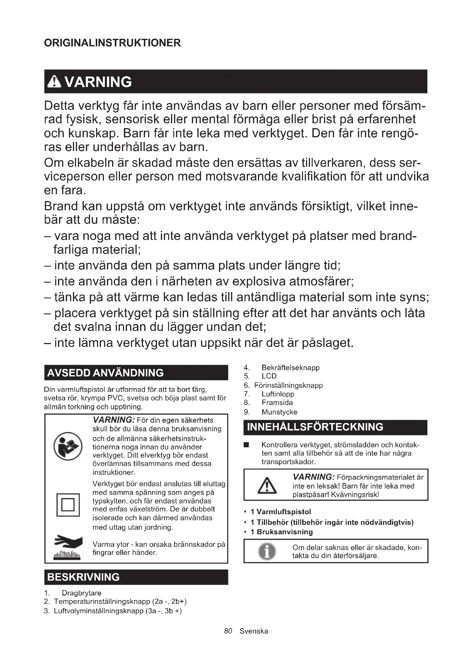 ÇEVRE Sadece AB ülkeleri için Ekipmanda tehlikeli bileşenler bulunduğundan dolayı eski elektrikli ve elektronik ekipmanlar çevre ve insan sağlığı üzerinde olumsuz etkiye yol açabilir. Elektrikli ve elektronik cihazları evsel atıklarla birlikte atmayın! Atık elektrikli ve elektronik ekipmanlar hakkındaki Avrupa Direktifi ve söz konusu direktifin ulusal yasalara uyarlanması gereğince eski elektrikli ve elektronik ekipmanlar ayrı olarak toplanmalı ve çevre koruma mevzuatına uygun olarak faaliyet gösteren ayrı bir kentsel atık toplama noktasına teslim edilmelidir. Bu husus, ekipmanın üzerine yerleştirilmiş üzerinde çarpı işareti bulunan tekerlekli çöp kovası simgesi ile belirtilmiştir.80 Svenska ORIGINALINSTRUKTIONER VARNING Detta verktyg får inte användas av barn eller personer med försäm- rad fysisk, sensorisk eller mental förmåga eller brist på erfarenhet och kunskap. Barn får inte leka med verktyget. Den får inte rengö- ras eller underhållas av barn. Om elkabeln är skadad måste den ersättas av tillverkaren, dess ser- viceperson eller person med motsvarande kvalikation för att undvika en fara. Brand kan uppstå om verktyget inte används försiktigt, vilket inne- bär att du måste: – vara noga med att inte använda verktyget på platser med brand- farliga material; – inte använda den på samma plats under längre tid; – inte använda den i närheten av explosiva atmosfärer; – tänka på att värme kan ledas till antändliga material som inte syns; – placera verktyget på sin ställning efter att det har använts och låta det svalna innan du lägger undan det; – inte lämna verktyget utan uppsikt när det är påslaget.