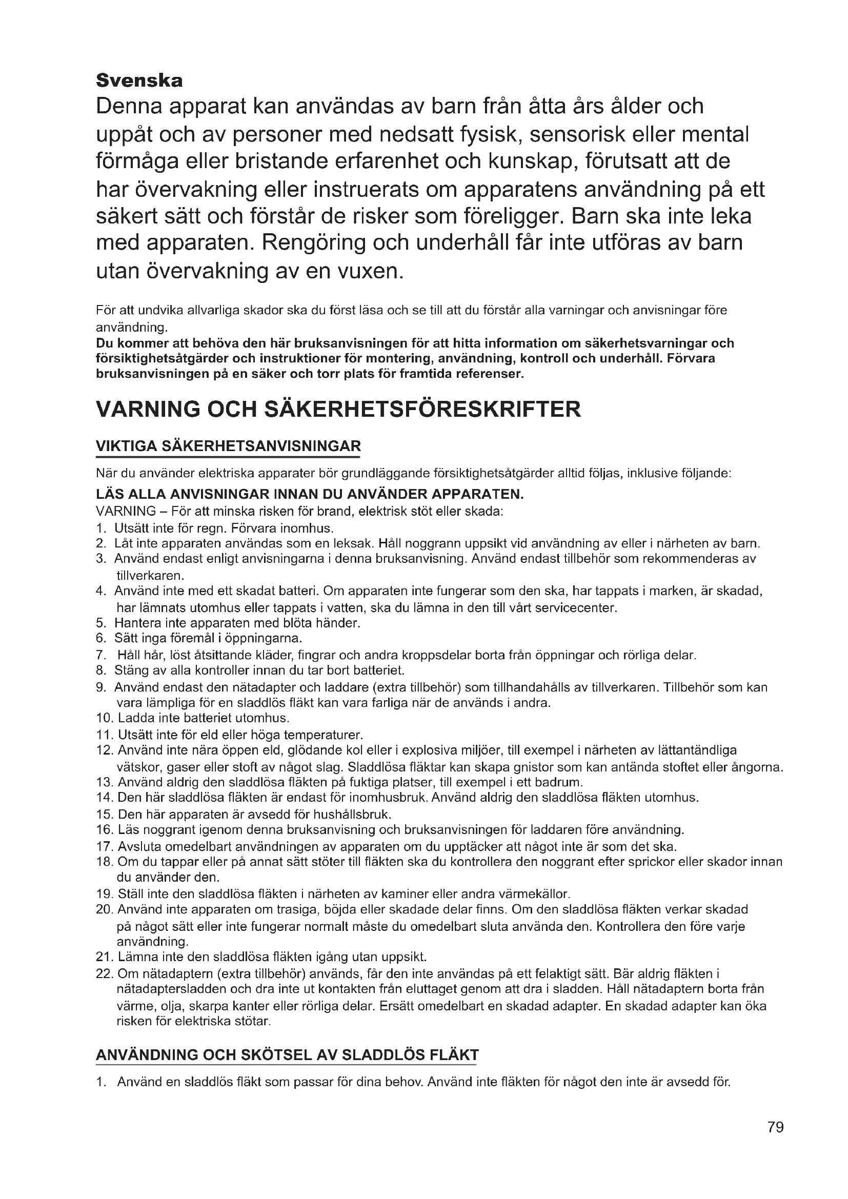 nätadaptersladden och dra inte ut kontakten från eluttaget genom att dra i sladden. Håll nätadaptern borta från värme, olja, skarpa kanter eller rörliga delar. Ersätt omedelbart en skadad adapter. En skadad adapter kan öka risken för elektriska stötar. ANVÄNDNING OCH SKÖTSEL AV SLADDLÖS FLÄKT