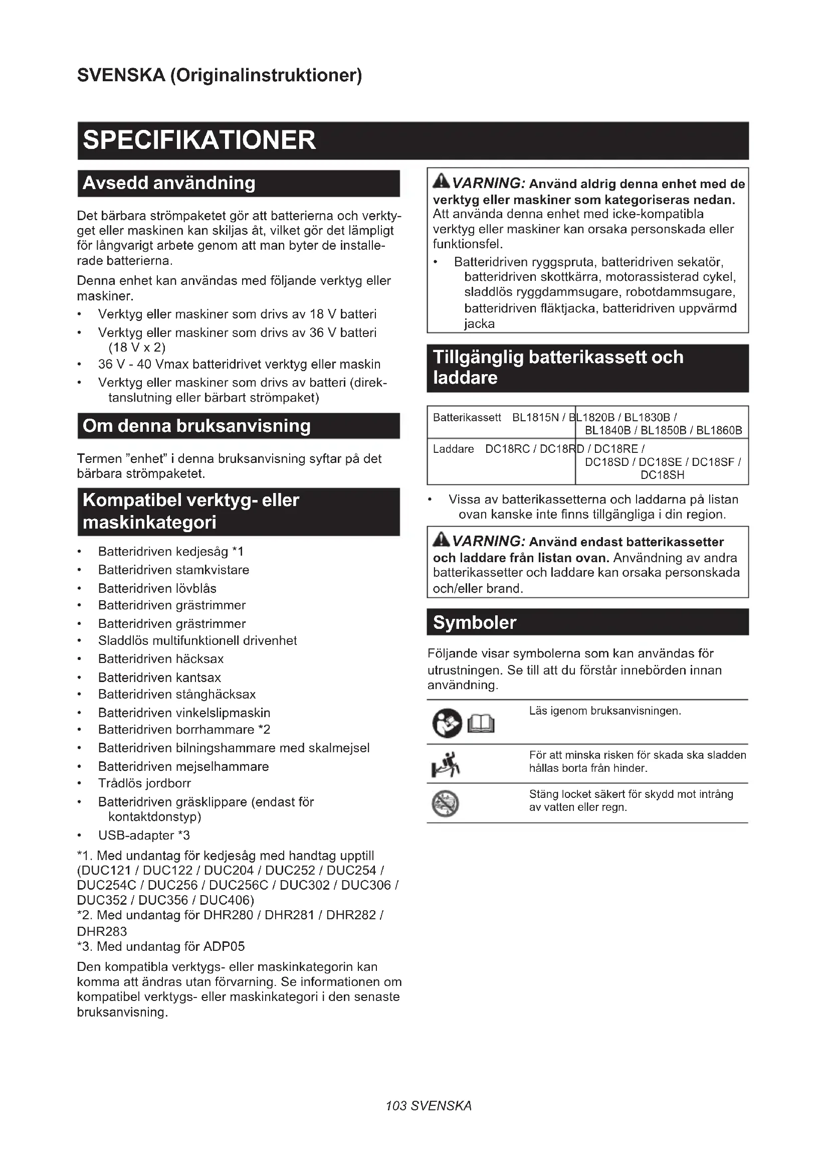 - 36V-40Vmaksadaptörü NOT:Listedekiparçalarınbazılarıaletpaketiiçeri- sindestandartaksesuarolarakdahiledilmişolabilir. Bunlarülkedenülkeyefarklılıkgösterebilir.103 SVENSKA SVENSKA (Originalinstruktioner) SPECIFIKATIONER Avsedd användning Detbärbaraströmpaketetgörattbatteriernaochverkty- getellermaskinenkanskiljasåt,vilketgördetlämpligt förlångvarigtarbetegenomattmanbyterdeinstalle- rade batterierna. Dennaenhetkananvändasmedföljandeverktygeller maskiner.