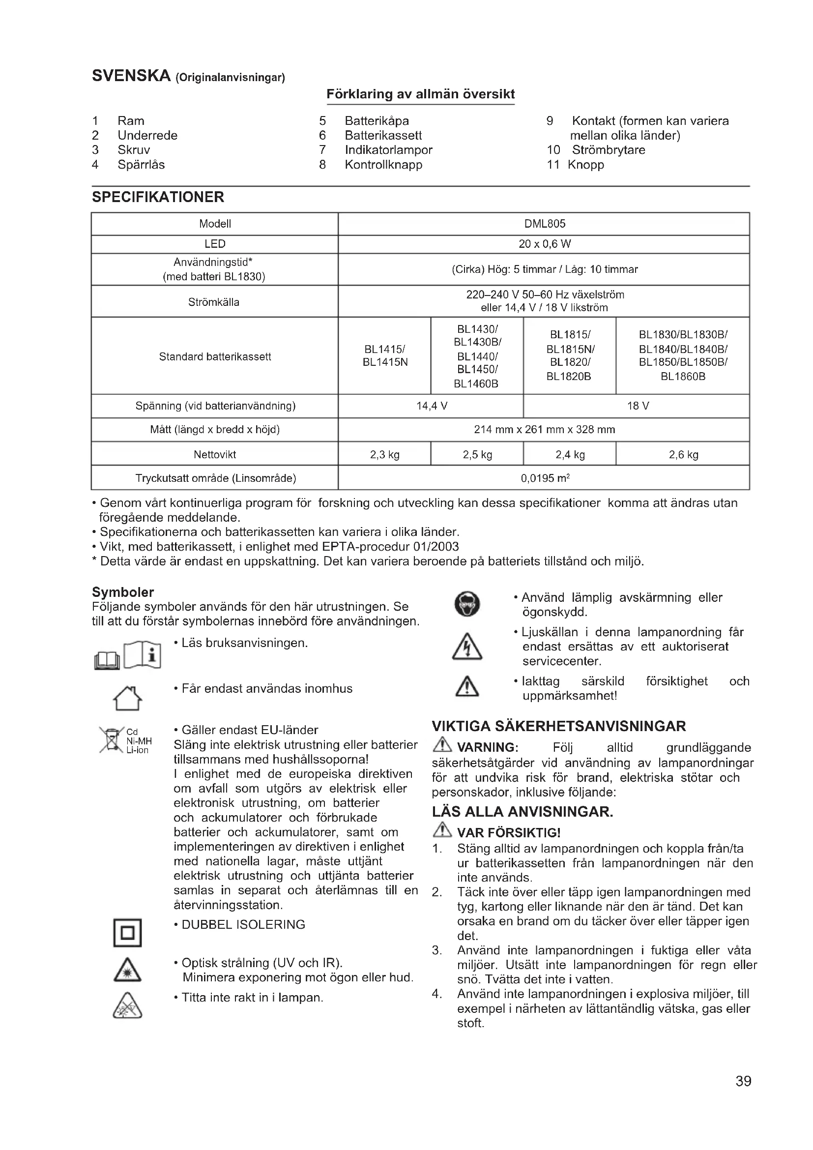 exempel i närheten av lättantändlig vätska, gas eller stoft. Modell DML805 LED 20 x 0,6 W Användningstid* (med batteri BL1830) (Cirka) Hög: 5 timmar / Låg: 10 timmar Strömkälla 220–240 V 50–60 Hz växelström eller 14,4 V / 18 V likström Standard batterikassett BL1415/ BL1415N BL1430/ BL1430B/ BL1440/ BL1450/ BL1460B BL1815/ BL1815N/ BL1820/ BL1820B BL1830/BL1830B/ BL1840/BL1840B/ BL1850/BL1850B/ BL1860B Spänning (vid batterianvändning) 14,4 V 18 V Mått (längd x bredd x höjd) 214 mm x 261 mm x 328 mm Nettovikt 2,3 kg 2,5 kg 2,4 kg 2,6 kg Tryckutsatt område (Linsområde) 0,0195 m