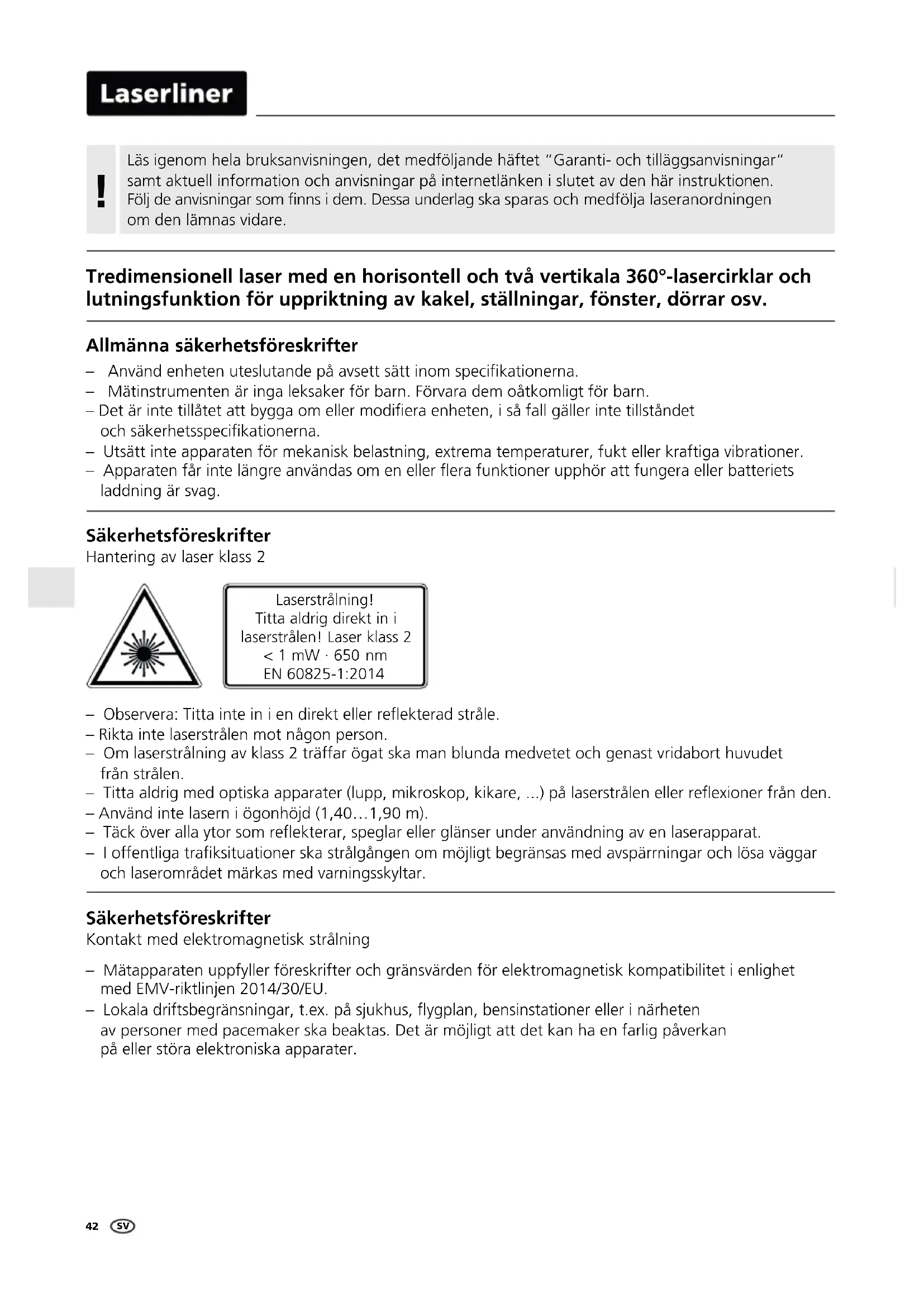 – Utsätt inte apparaten för mekanisk belastning, extrema temperaturer, fukt eller kraftiga vibrationer. m OO@Q@SDME¬QHMSDK«MFQD@MU«MC@RNLDMDKKDQ×DQ@ETMJSHNMDQTOOG¼Q@SSETMFDQ@DKKDQA@SSDQHDSR laddning är svag. Tredimensionell laser med en horisontell och två vertikala 360°-lasercirklar och lutningsfunktion för uppriktning av kakel, ställningar, fönster, dörrar osv. Läs igenom hela bruksanvisningen, det medföljande häftet “Garanti- och tilläggsanvisningar“ samt aktuell information och anvisningar på internetlänken i slutet av den här instruktionen. Följ de anvisningar som finns i dem. Dessa underlag ska sparas och medfölja laseranordningen om den lämnas vidare.