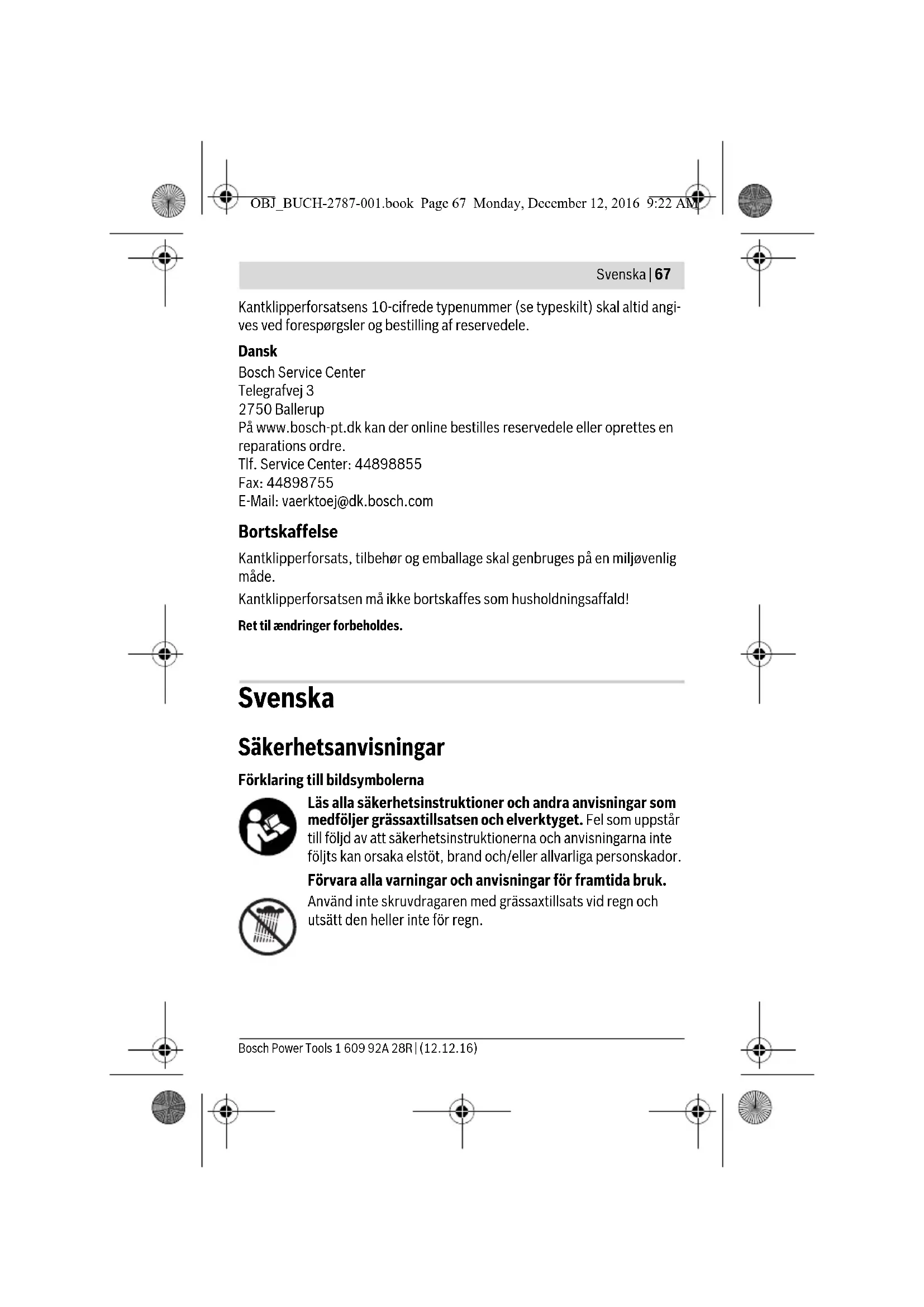 –Stik herefter gummikappen 9 på skruemaskinen igen. Brug Ibrugtagning Stil skruemaskinen med kantklipperforsats på skærekniven, når du sætter den fra dig. Derved undgå du indtrængen af fugt i el-værktøjet. Tænd/sluk – Træk knivbeskyttelsen 3 til skærekniven 2 af. –For ibrugtagning af skruemaskinen med kantklipperforsats skal låsekon- takten 8 trykkes op. – Indstil drejeretningen med retningsomskifteren 6. Kantklipperforsatsen kan bruges højreløbende eller venstreløbende. – Tryk på start-stop-kontakten 7, og hold den inde. – For at slukke kantklipperforsatsen skal du slippe start-stop-kontakten 7. – Anbring retningsomskifteren 6 i midterstilling. – Tryk låsekontakten 8 ned. – Sæt knivbeskyttelsen 3 på skærekniven 2. Knivbeskyttelsen 3 skal gå hør- bart i indgreb! Skære kanter Før skruemaskinen med kantklipperforsats langs med græskanten. Sørg for, at skærekniven ikke kommer i kontakt med flisebelagte underlag, sten eller havemure, da dette forkorter skæreknivens levetid væsentligt. Sæt knivbe- skyttelsen på skærekniven igen efter brug. OBJ_BUCH-2787-001.book Page 65 Monday, December 12, 2016 9:22 AM1 609 92A 28R | (12.12.16) Bosch Power Tools 66 | Dansk Afhjælpning af blokeringer på skærekniven Fjern eller fasthold aldrig skæremateriale, mens skærekniven er i bevægelse. Slip start-stop-kontakten 7, og tryk låseknappen 8 ned. Bemærk! Efter at skruemaskinen med kantklipperforsats er slukket, vil skærekniven stadig bevæge sig i nogle sekunder. Rør ikke ved skærekniven, så længe den bevæger sig. Vent, til skærekniven er standset helt, og afhjælp derefter blokeringen. Vedligeholdelse og service Vedligeholdelse og rengøring Brug altid beskyttelseshandsker, når du vil udføre vedligeholdelses-/ reparationsarbejde med kantklipperforsatsen. Anbring retningsomskifteren i midterstilling. Før vedligeholdelses- eller rengøringsarbejde skal du trykke låsekon- takten ned og fjerne kantklipperforsatsen fra skruemaskinen. Hold skærekniven ren, så du kan arbejde godt og sikkert. – Undersøg kantklipperforsatsen 1 regelmæssigt for åbenlyse fejl, f.eks. utilstrækkelig fastgørelse og slidte eller beskadigede komponenter. – Rengør altid kantklipperforsatsen 1 efter brug med en pensel eller en blød børste, og smør skærekniven 2 med Bosch vedligeholdelsesspray. Brug ikke opløsnings- eller polermidler! Tilbehør Kundeservice og brugerrådgivning Kundeservice besvarer dine spørgsmål vedr. reparation og vedligeholdelse af dit produkt samt reservedele. Eksplosionstegninger og informationer om reservedele findes også under: www.bosch-pt.com Bosch brugerrådgivningsteamet vil gerne hjælpe dig med at besvare spørgs- mål vedr. vores produkter og deres tilbehør. Typenummer Servicespray, 250 ml 1 609 200 399 OBJ_BUCH-2787-001.book Page 66 Monday, December 12, 2016 9:22 AMSvenska | 67 Bosch Power Tools 1 609 92A 28R | (12.12.16) Kantklipperforsatsens 10-cifrede typenummer (se typeskilt) skal altid angi- ves ved forespørgsler og bestilling af reservedele. Dansk Bosch Service Center Telegrafvej 3 2750 Ballerup På www.bosch-pt.dk kan der online bestilles reservedele eller oprettes en reparations ordre. Tlf. Service Center: 44898855 Fax: 44898755 E-Mail: vaerktoej@dk.bosch.com Bortskaffelse Kantklipperforsats, tilbehør og emballage skal genbruges på en miljøvenlig måde. Kantklipperforsatsen må ikke bortskaffes som husholdningsaffald! Ret til ændringer forbeholdes. Svenska Säkerhetsanvisningar Förklaring till bildsymbolerna Läs alla säkerhetsinstruktioner och andra anvisningar som medföljer grässaxtillsatsen och elverktyget. Fel som uppstår till följd av att säkerhetsinstruktionerna och anvisningarna inte följts kan orsaka elstöt, brand och/eller allvarliga personskador. Förvara alla varningar och anvisningar för framtida bruk. Använd inte skruvdragaren med grässaxtillsats vid regn och utsätt den heller inte för regn. OBJ_BUCH-2787-001.book Page 67 Monday, December 12, 2016 9:22 AM1 609 92A 28R | (12.12.16) Bosch Power Tools 68 | Svenska Observera: skären på grässaxtillsatsen eftersläpar vid avstäng- ning! Se till att personer som står i närheten inte skadas av föremål som eventuellt slungas ut. Varning: håll alltid ett säkert avstånd till skruvdragaren med gräs- saxtillsats när du arbetar med den. Säkerhetsinstruktioner för skruvdragare med grässaxtillsats Denna skruvdragare med grässaxtillsats är inte avsedd för användning av barn eller personer med begränsad fysisk, sensorisk eller mental förmåga eller med bristande kunskap och erfarenhet. Använd inte grässaxtillsatsen eller skruv- dragaren med grässaxtillsats om människor eller djur befinner sig i närheten. Se till att barn inte leker med grässaxtillsatsen eller skruvdragaren med grässaxtillsatsen. Ta bort grässaxtillsatsen från skruvdragaren när den inte används. Se till att knivskyddet sitter på när den inte används. Kontrollera att skyddet som hör till grässaxtillsatsen inte är skadat. Skyddet ska skydda användaren mot oavsiktlig kontakt med kniven. Håll kniven vass och ren. En välskött kniv med vass egg fastnar mindre och är lättare att styra. OBJ_BUCH-2787-001.book Page 68 Monday, December 12, 2016 9:22 AMSvenska | 69 Bosch Power Tools 1 609 92A 28R | (12.12.16) Skär inte i trä, sten, betong eller i kablar. Kniven blir slö och kan fastna. Bär alltid skyddsglasögon, hela skor och långa byxor när du arbetar med skruvdragaren med grässaxtillsats. Undvik dålig kroppshållning och se till att du står stabilt. Behåll alltid jämvikten, särskilt i lutningar och vallar. Stabil hållning och korrekt kroppshållning gör att du får bättre kontroll över skruvdragaren med gräs- saxtillsats i oväntade situationer. Spring inte medan du använder eller transporterar grässaxtillsatsen. Om du halkar eller faller föreligger skaderisk. Stäng av strömbrytaren, ställ vridriktningsomkopplaren i mittläge