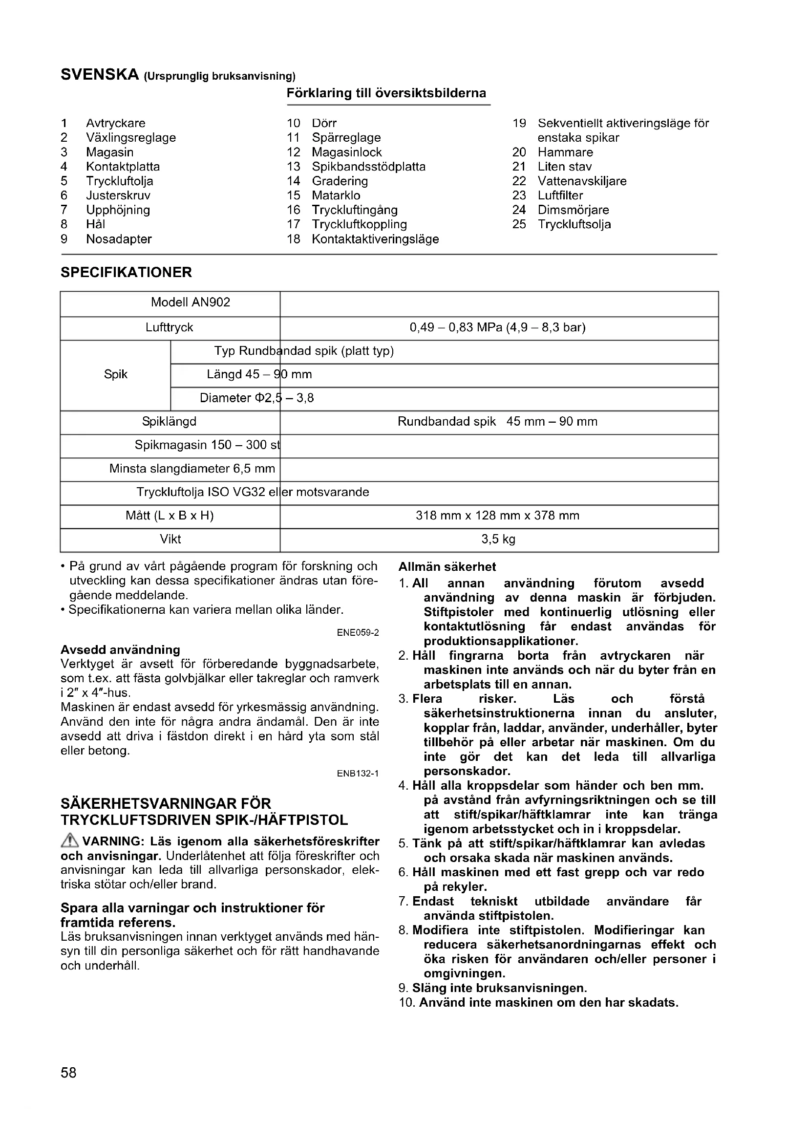 Modell AN902 Lufttryck 0,49 – 0,83 MPa (4,9 – 8,3 bar) Spik Typ Rundbandad spik (platt typ) Längd 45 – 90 mm Diameter Φ2,5 – 3,8 Spiklängd Rundbandad spik 45 mm – 90 mm Spikmagasin 150 – 300 st Minsta slangdiameter 6,5 mm Tryckluftolja ISO VG32 eller motsvarande Mått (L x B x H) 318 mm x 128 mm x 378 mm Vikt 3,5 kg 1 Avtryckare 2 Växlingsreglage 3 Magasin 4 Kontaktplatta 5 Tryckluftolja 6 Justerskruv 7 Upphöjning 8Hål 9 Nosadapter 10 Dörr 11 Spärreglage 12 Magasinlock 13 Spikbandsstödplatta 14 Gradering 15 Matarklo 16 Tryckluftingång 17 Tryckluftkoppling 18 Kontaktaktiveringsläge 19 Sekventiellt aktiveringsläge för enstaka spikar 20 Hammare 21 Liten stav 22 Vattenavskiljare 23 Luftfilter 24 Dimsmörjare 25 Tryckluftsolja59